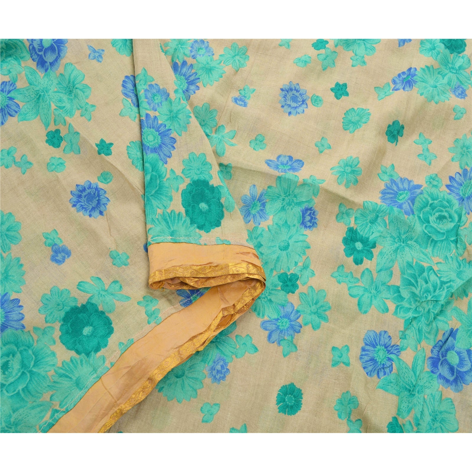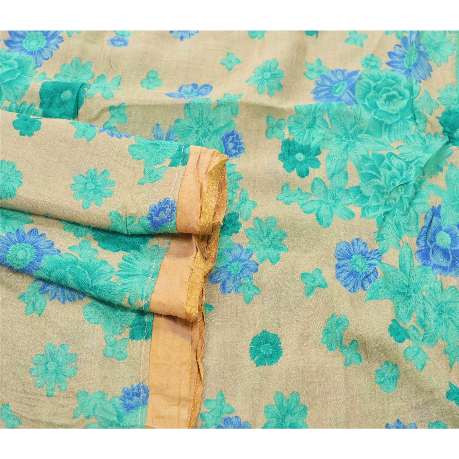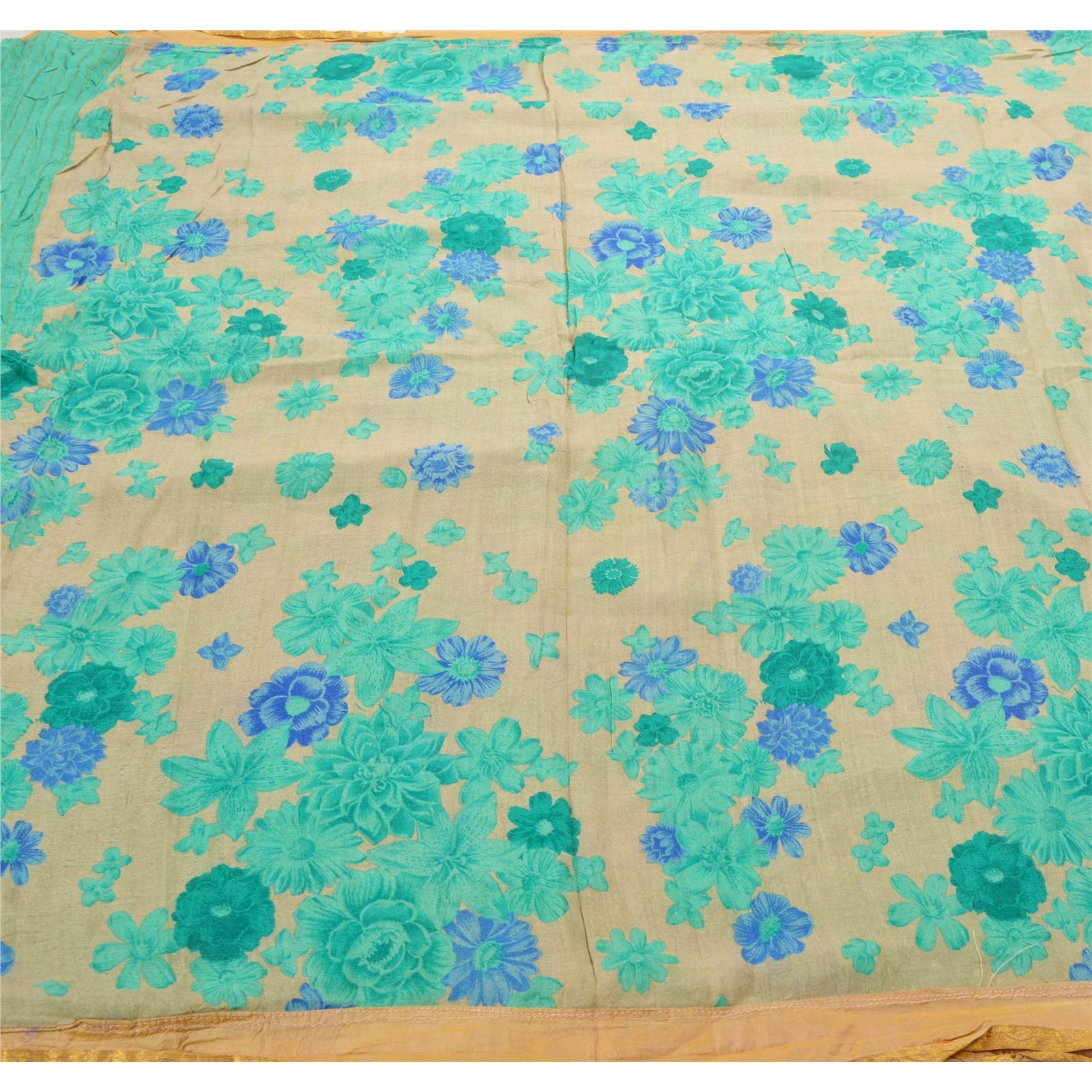 An Awesome Heavy Sari In Cream & Green Color 100% Pure Silk Base Sustainable Fabric. Pallu & Border Of The Sari Has Multi Color Printed Floral Pattern Along With Golden Zari Woven Work. Centre Portion Of Sari Has Similar Work With Similar Pattern. A One Of Kind Unique Saree Must In Your Collection. This unique vintage saree can be used for various crafting ideas even if you don't want to use it as a sari. Design a dress, use it as a throw, as window dressing, upholstery, table linen and much more. Let your creative juices flow and use this decorated Sustainable Fabric in multiple fashion.