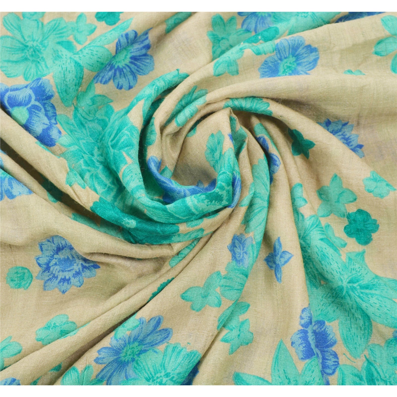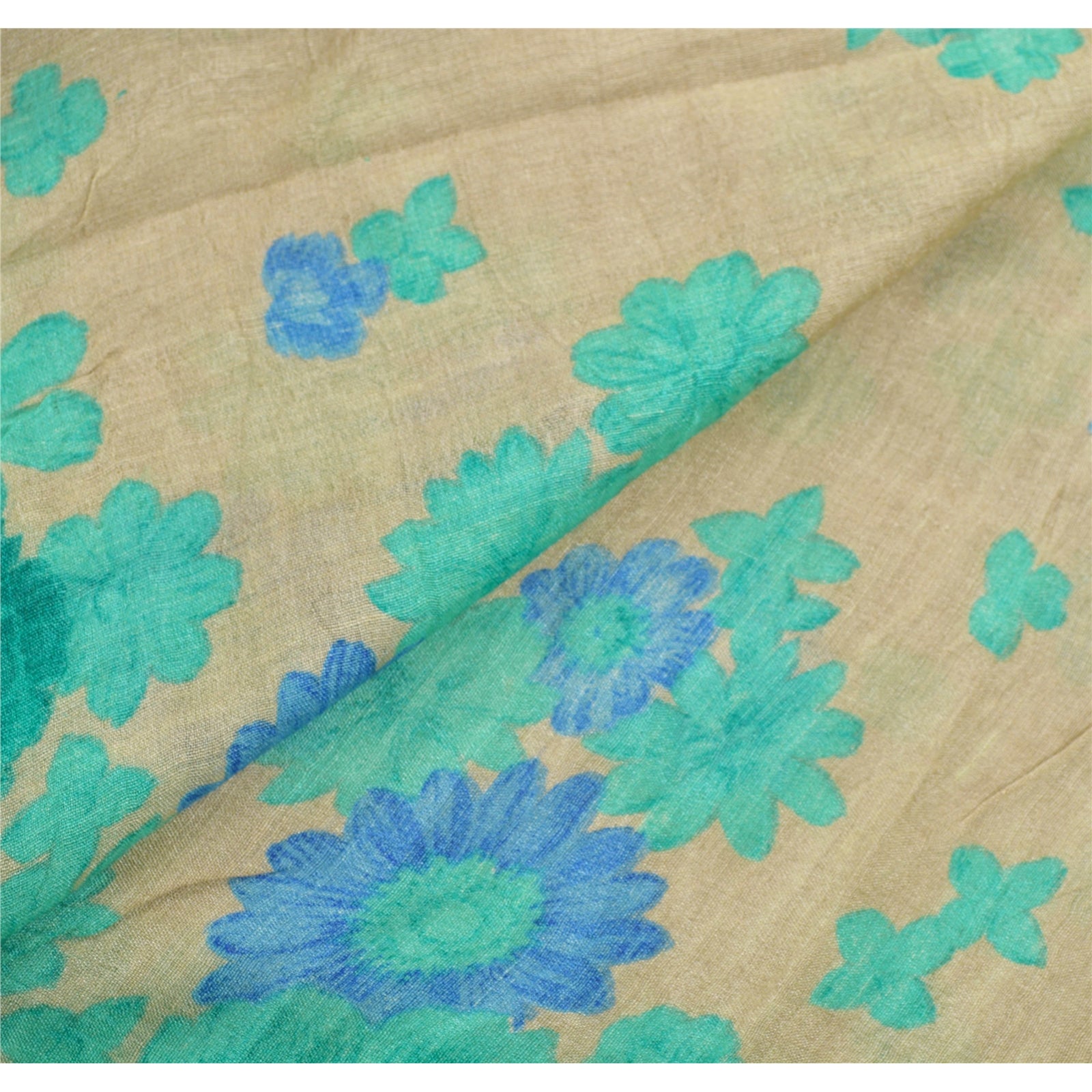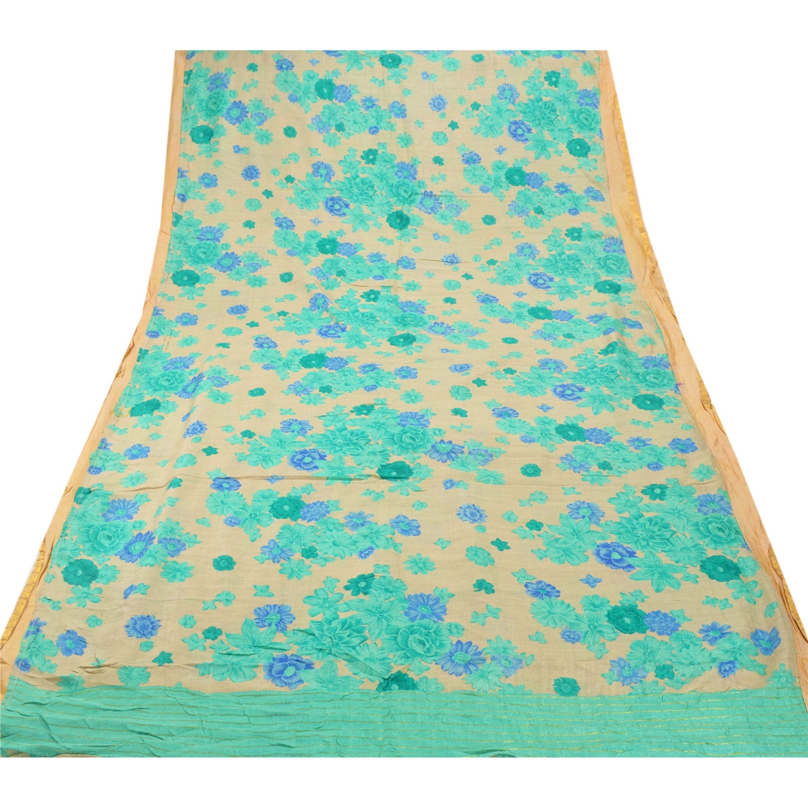 An Awesome Heavy Sari In Cream & Green Color 100% Pure Silk Base Sustainable Fabric. Pallu & Border Of The Sari Has Multi Color Printed Floral Pattern Along With Golden Zari Woven Work. Centre Portion Of Sari Has Similar Work With Similar Pattern. A One Of Kind Unique Saree Must In Your Collection. This unique vintage saree can be used for various crafting ideas even if you don't want to use it as a sari. Design a dress, use it as a throw, as window dressing, upholstery, table linen and much more. Let your creative juices flow and use this decorated Sustainable Fabric in multiple fashion.