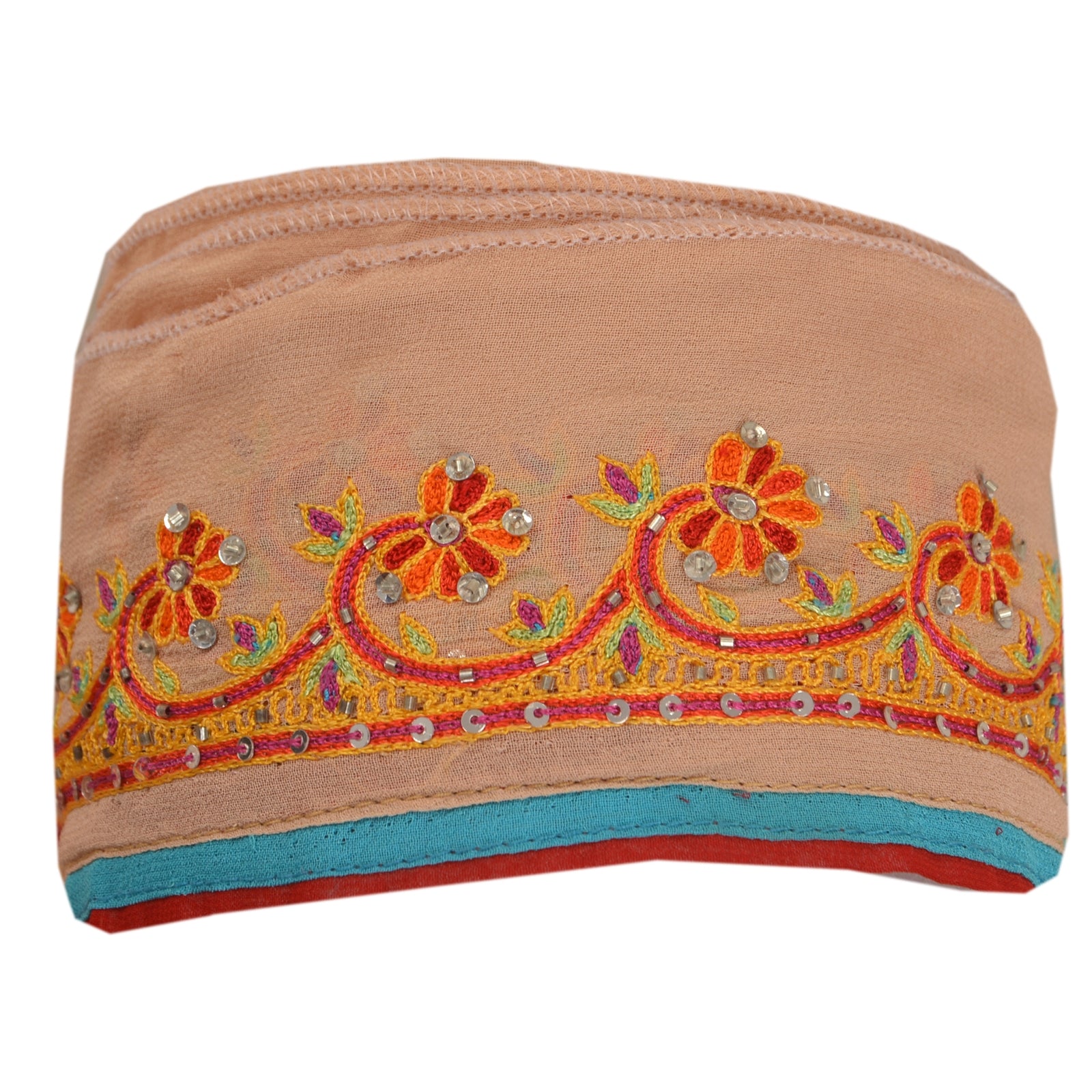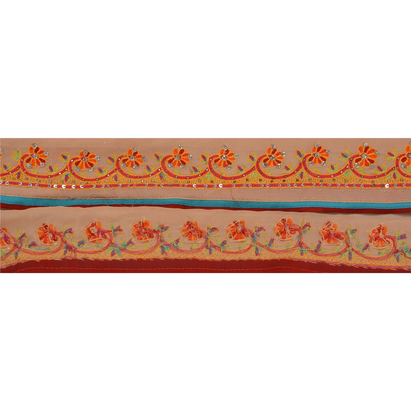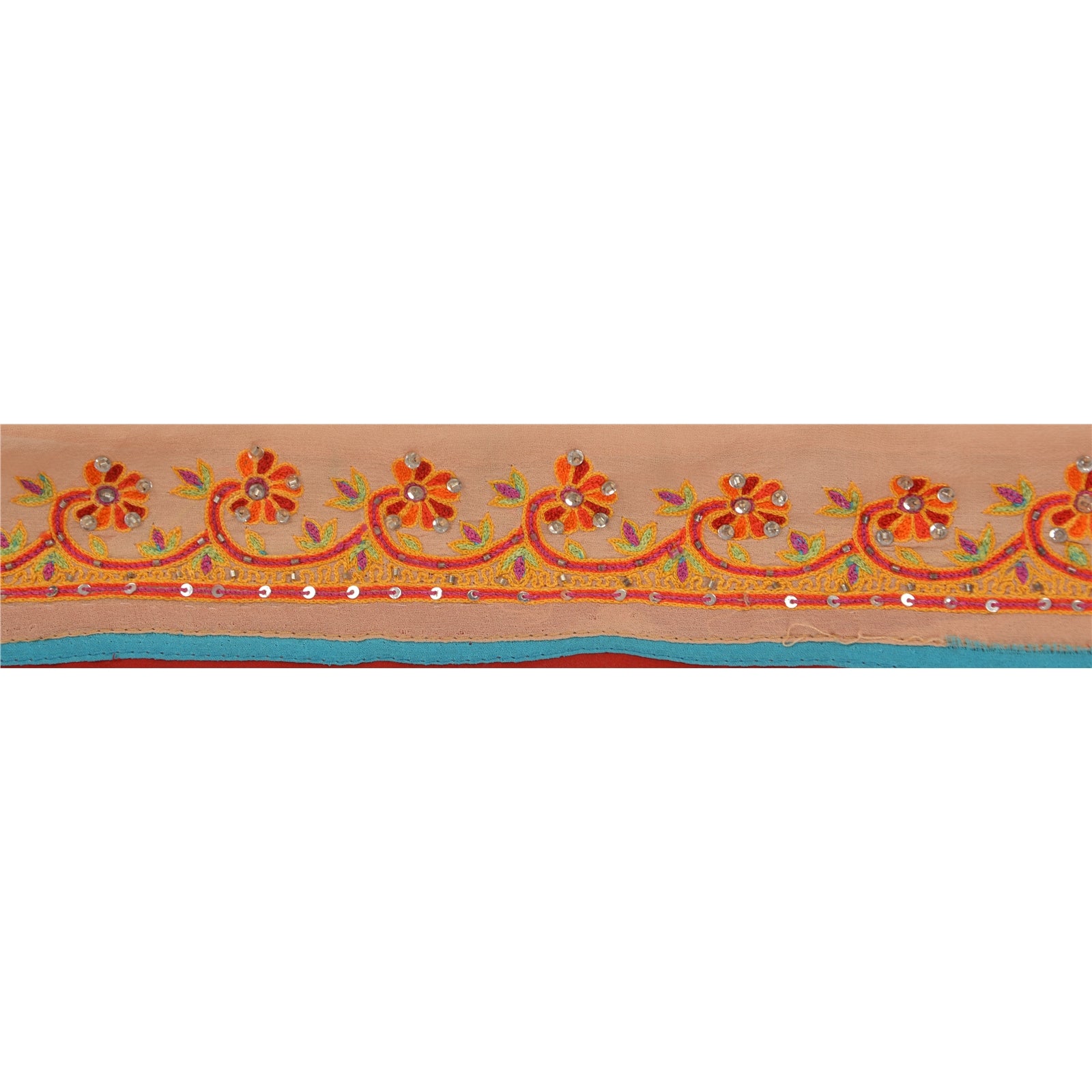 Fabulous georgette hand beaded sari border in peach color highlighting sequins work. Border has beautiful floral patterns painstakingly hand beaded with silver sequins, white glass beads work, blue/maroon fabric patch work . Further you can see fine detailing with multi color thread work. WOW!! an awesome one of a kind versatile border. 1 Quantity = 1 Yard B-13523