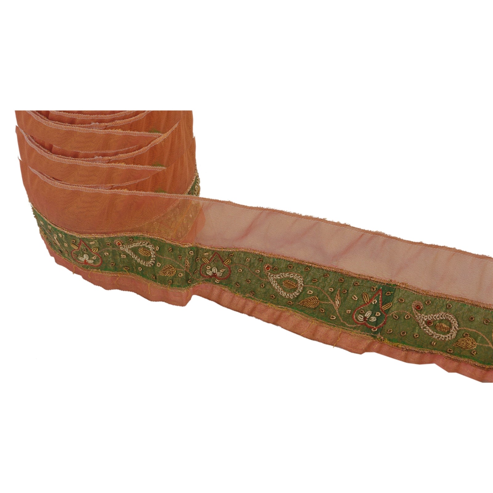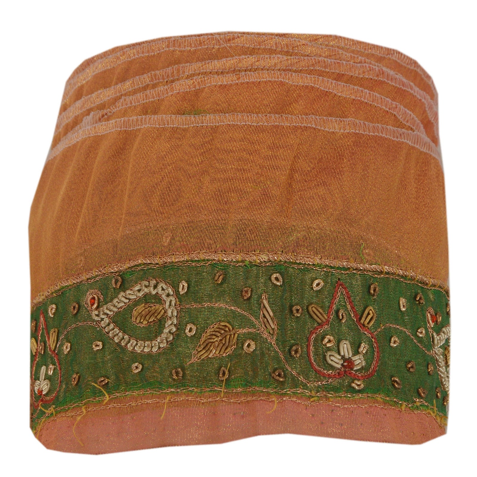 Fantastisk håndperlet sari-kant med silkestof i gylden farve, der fremhæver zardozi-arbejde. Kanten har smukke blomster- og paisleymønstre, der er omhyggeligt håndperlet med gyldne zari/zardozi-arbejder og røde glasperler. Ydermere kan du se fine detaljer med rødt trådarbejde og grønt patchwork med bæredygtigt stof. WOW!! En fantastisk, unik og alsidig kant. 1 antal = 1 yard.
