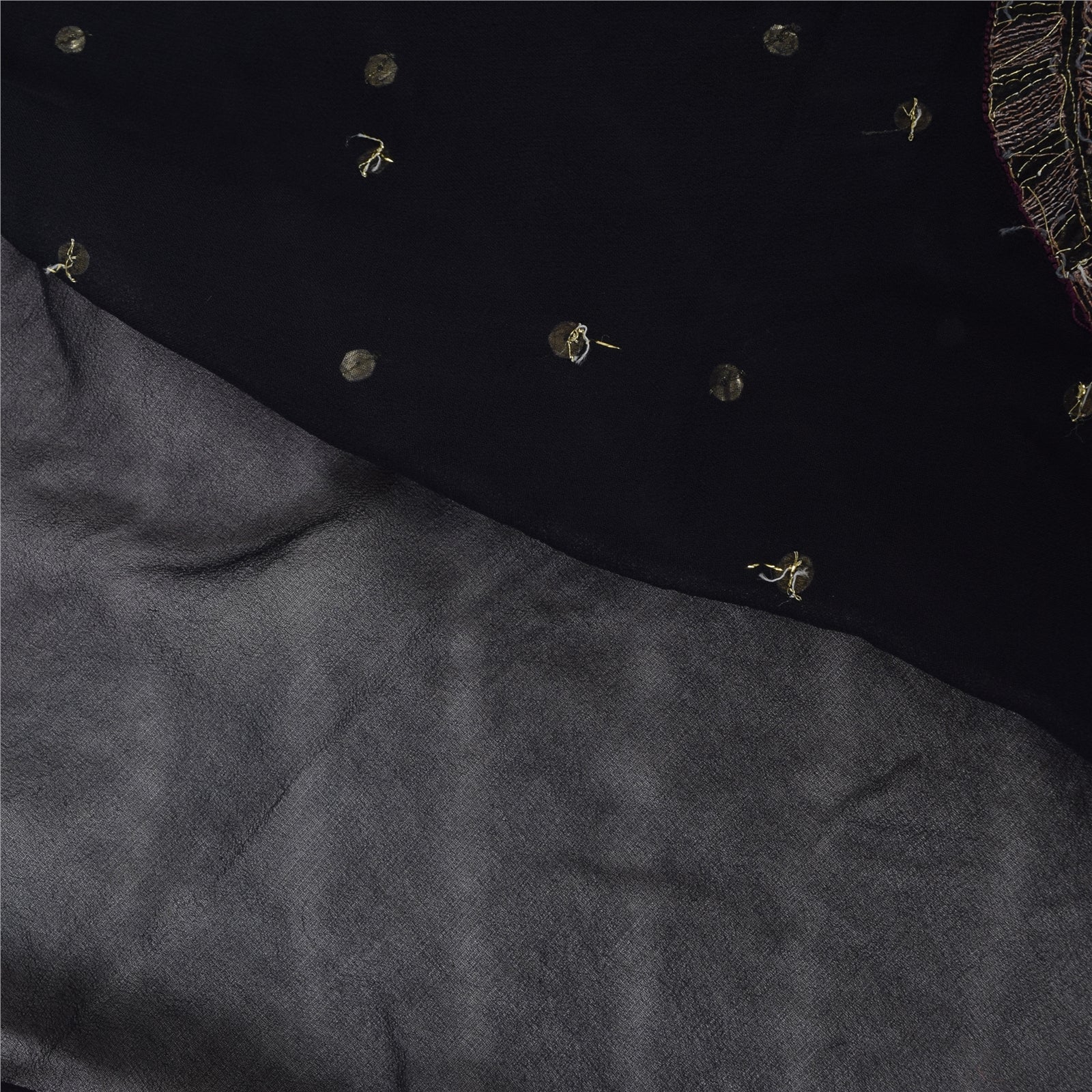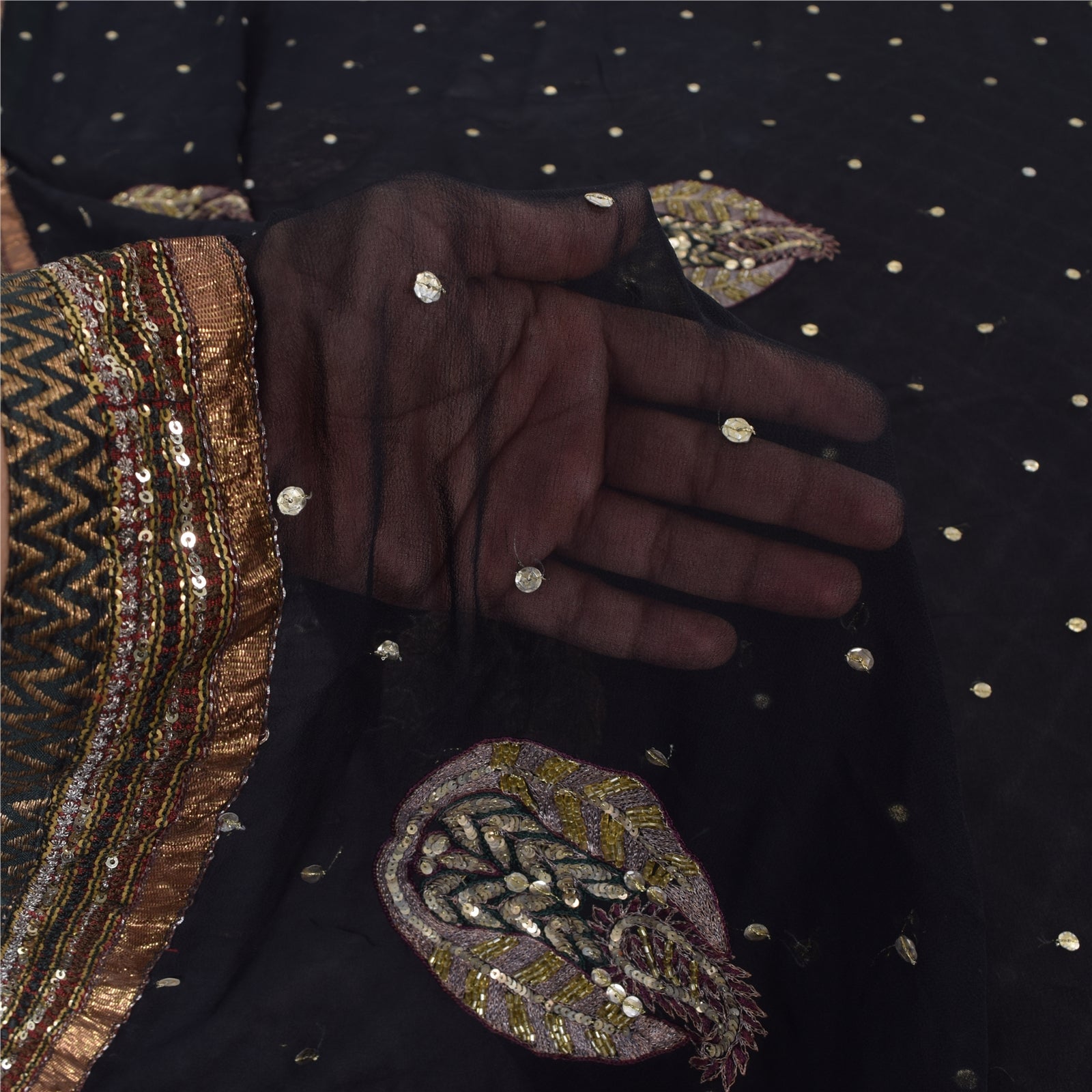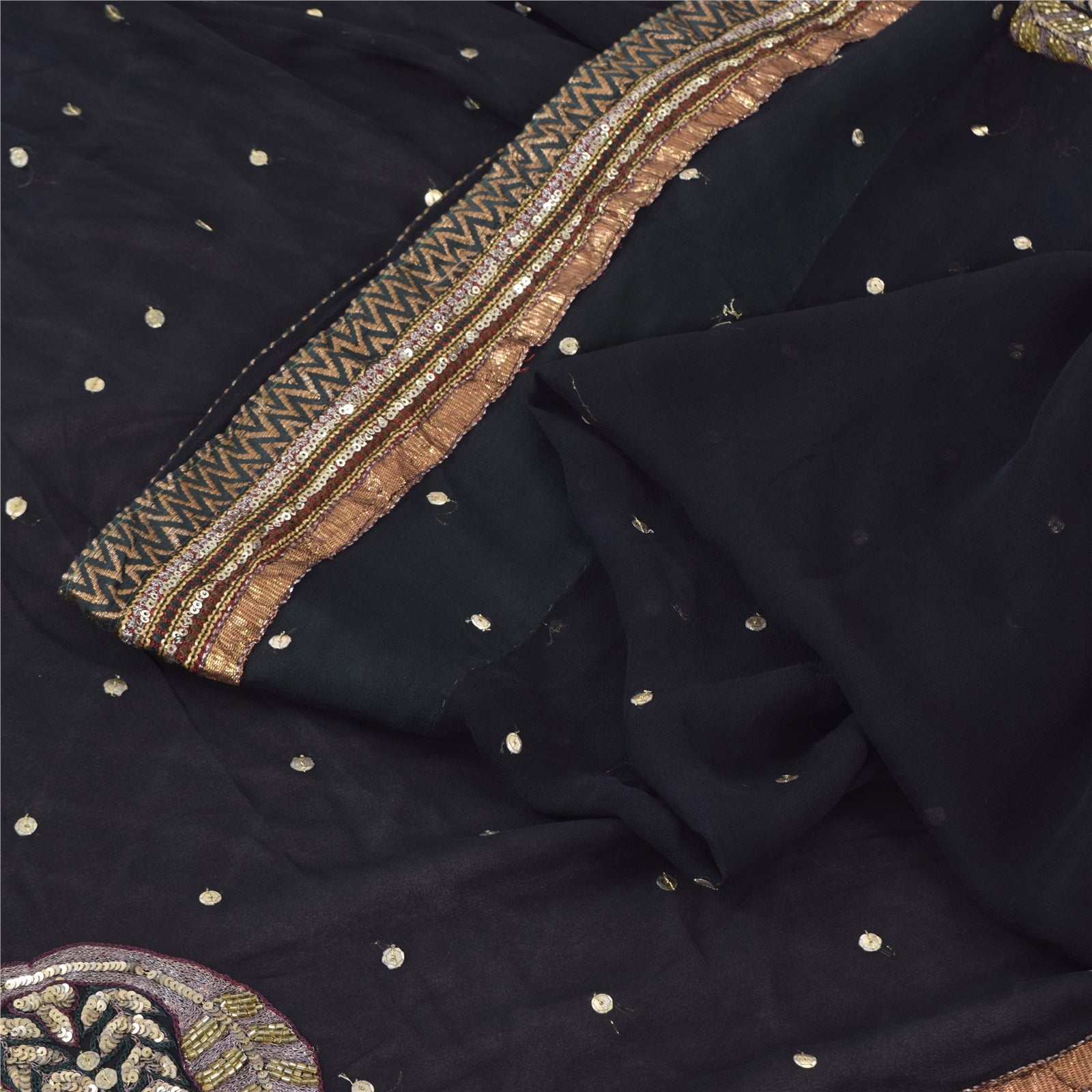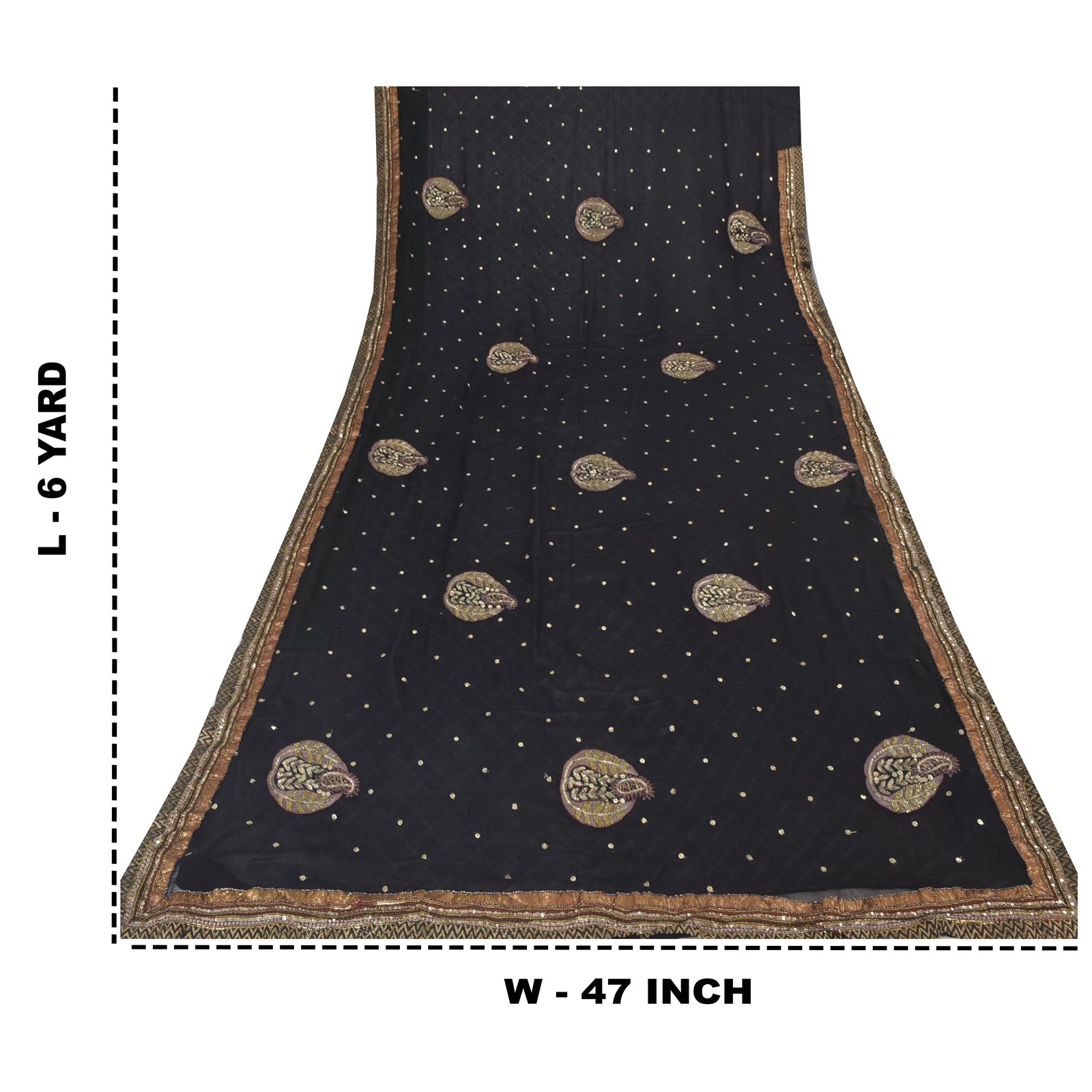 THE ITEM COLOR OR SHADE MAY BE DARKER OR LIGHTER THAN THE PICTURE.' An Awesome Sari In Pure Georgette Silk Black Colored Hand Embroidered Sari/Fabric. Pallu & Border Features floral design embellished with copper zari work, golden sequins work & yellow glass beads work & red & black color thread work. You Can See Center Portion Of The Sari Has Similar Thread Work With Floral Design This unique vintage saree can be used for various crafting ideas for example design a dress, use it as a throw, as window dressing, upholstery, table linen and much more. Let your creative juices flow and use this decorated fabric in multiple fashion Shipping note: International buyers please note: Import duties, taxes, and charges are not included in the item price or postage cost. These charges are the buyer's responsibility. Please check with your country's customs office to determine what these additional costs will be prior to bidding or buying. Buyer will pay custom duty/tax. It is calculated and charged differently by every country. As a seller I do not have any control over it. VAT or sales tax is calculated by the platform at the time of checkout. Customs charge is payable at the time of delivery. SKU: HS-7156