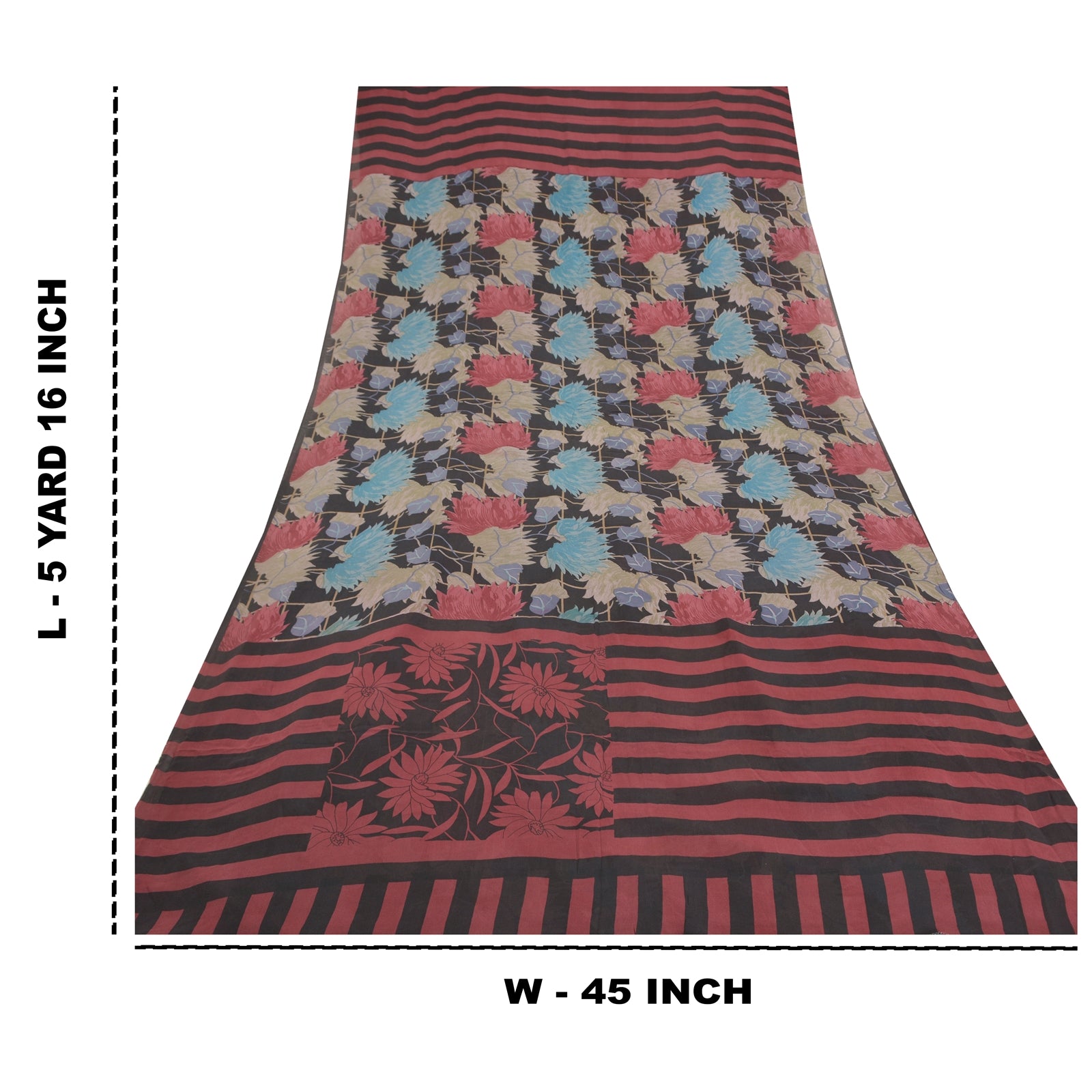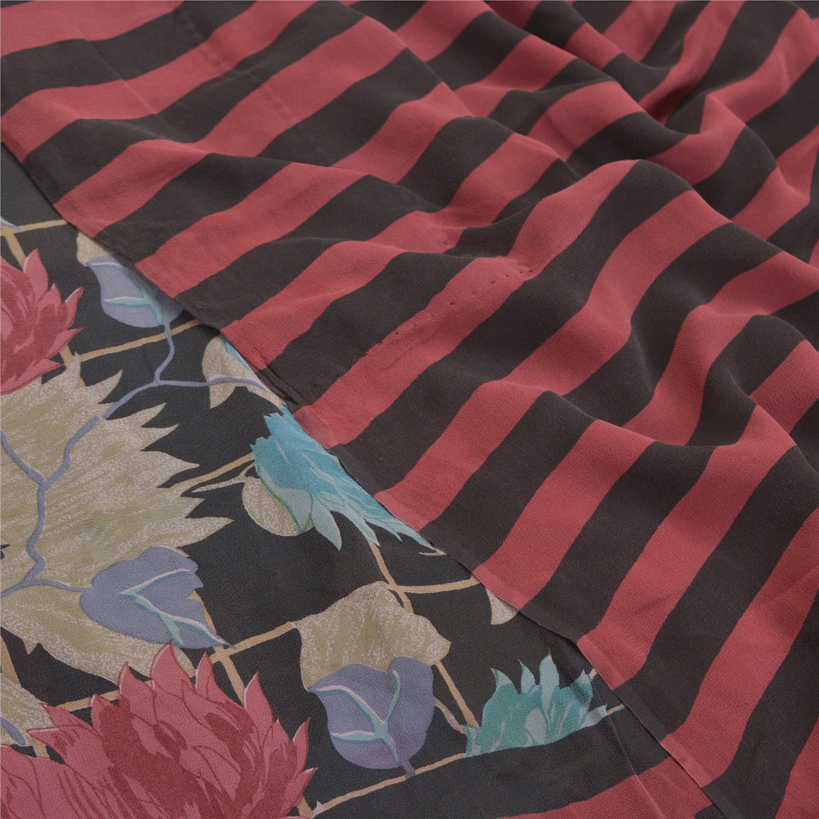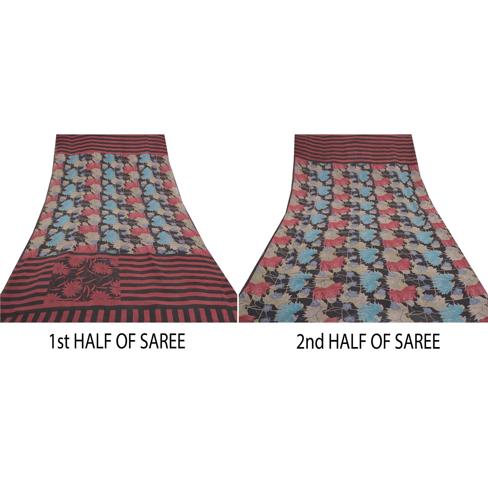 Iøjnefaldende sort sari i ren georgette-silketryk. Pallu & Border har et trykt blomster- og stribedesign. Blomsterdesign i midten af sarien. Hvad er det særlige ved denne sari? Fantastisk design på blødt bæredygtigt stof fremhæver virkelig sariens skønhed. Denne unikke vintage-sari kan bruges til forskellige kreative ideer, selvom du ikke ønsker at bruge den som sari. Design en kjole, brug den som vinduesdekoration, polstring, saronger, tæppe, syning af kjoler og bordlinned, og meget mere. Lad dine kreative safter flyde, og brug dette dekorerede bæredygtige stof på flere måder.
