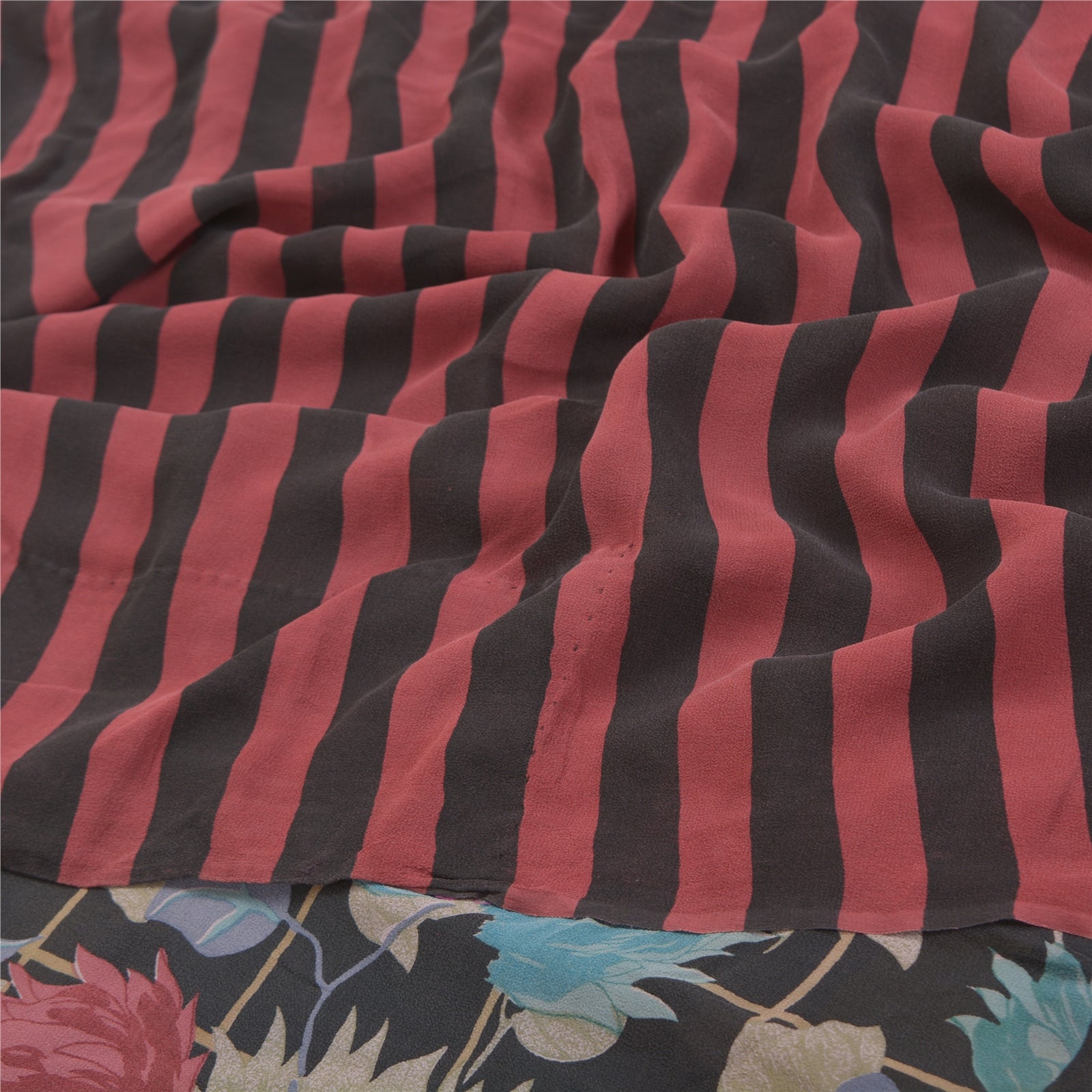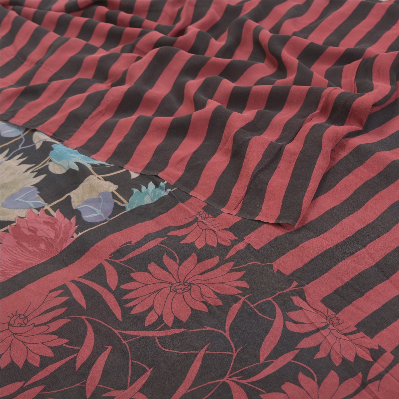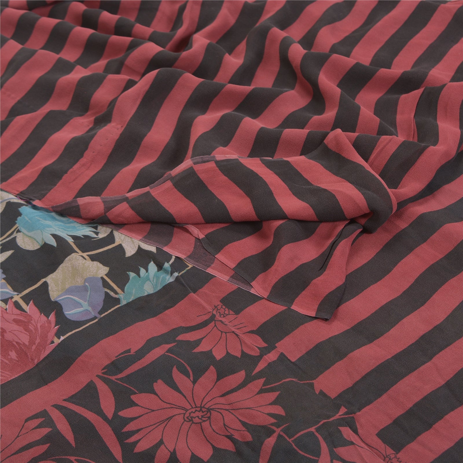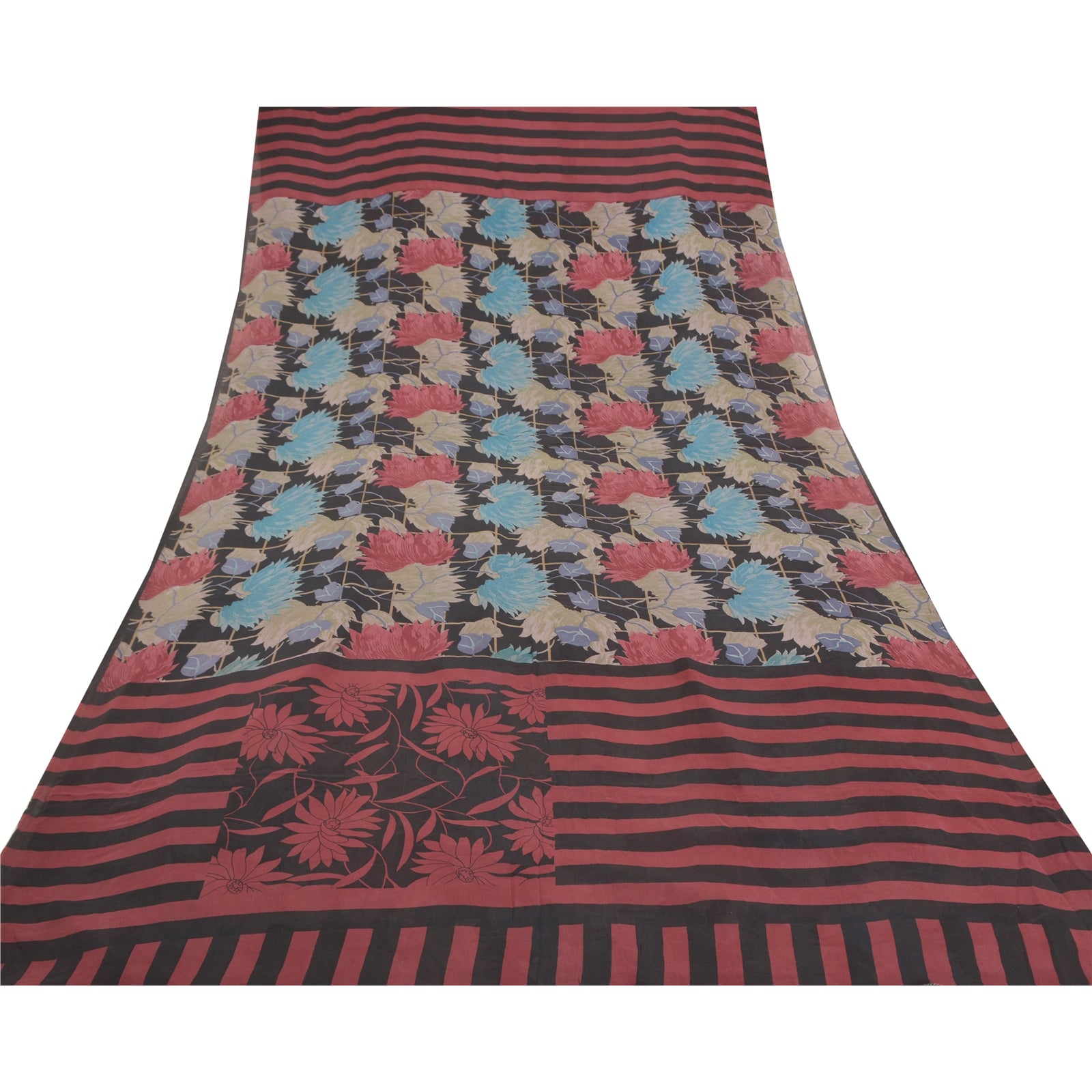 Iøjnefaldende sort sari i ren georgette-silketryk. Pallu & Border har et trykt blomster- og stribedesign. Blomsterdesign i midten af sarien. Hvad er det særlige ved denne sari? Fantastisk design på blødt bæredygtigt stof fremhæver virkelig sariens skønhed. Denne unikke vintage-sari kan bruges til forskellige kreative ideer, selvom du ikke ønsker at bruge den som sari. Design en kjole, brug den som vinduesdekoration, polstring, saronger, tæppe, syning af kjoler og bordlinned, og meget mere. Lad dine kreative safter flyde, og brug dette dekorerede bæredygtige stof på flere måder.
