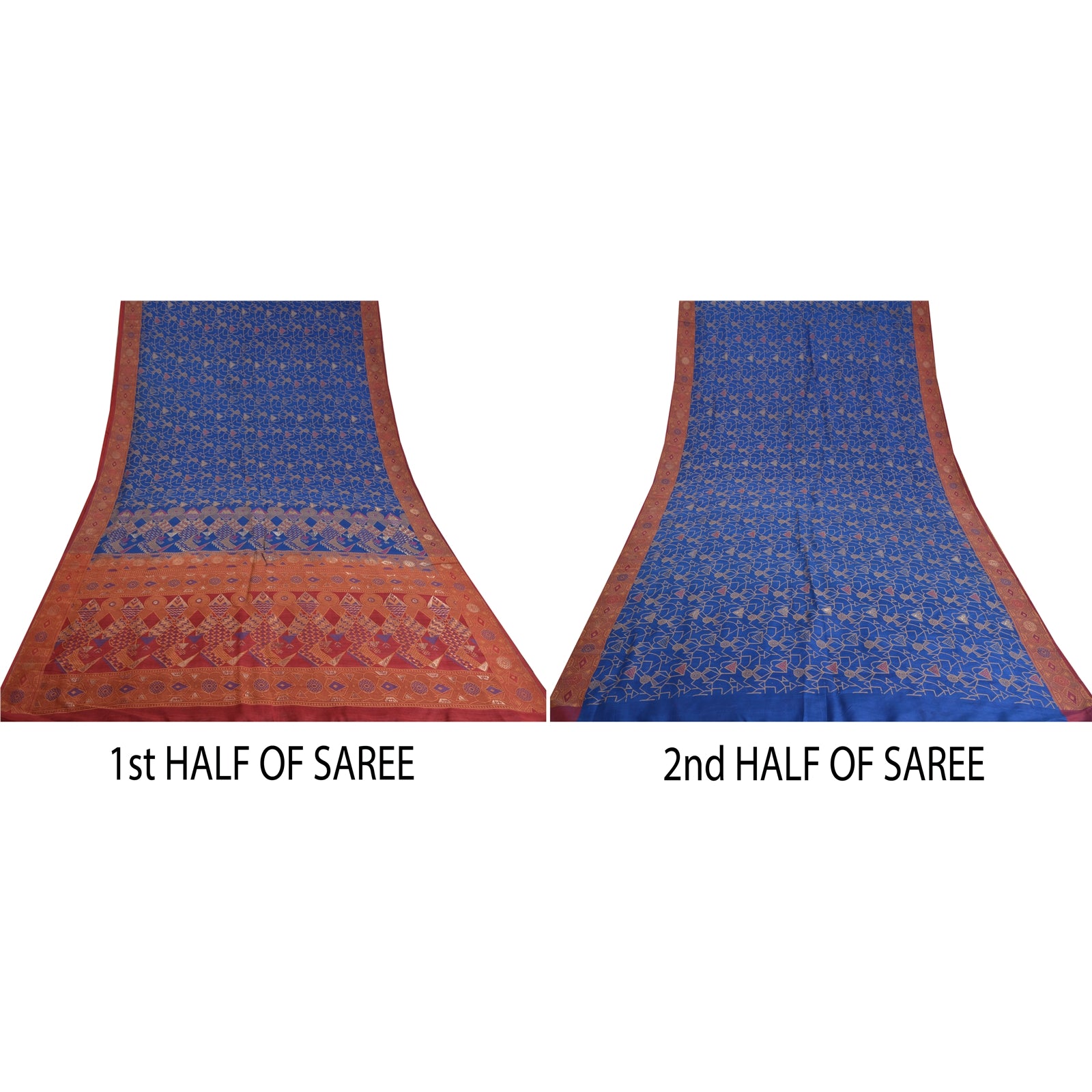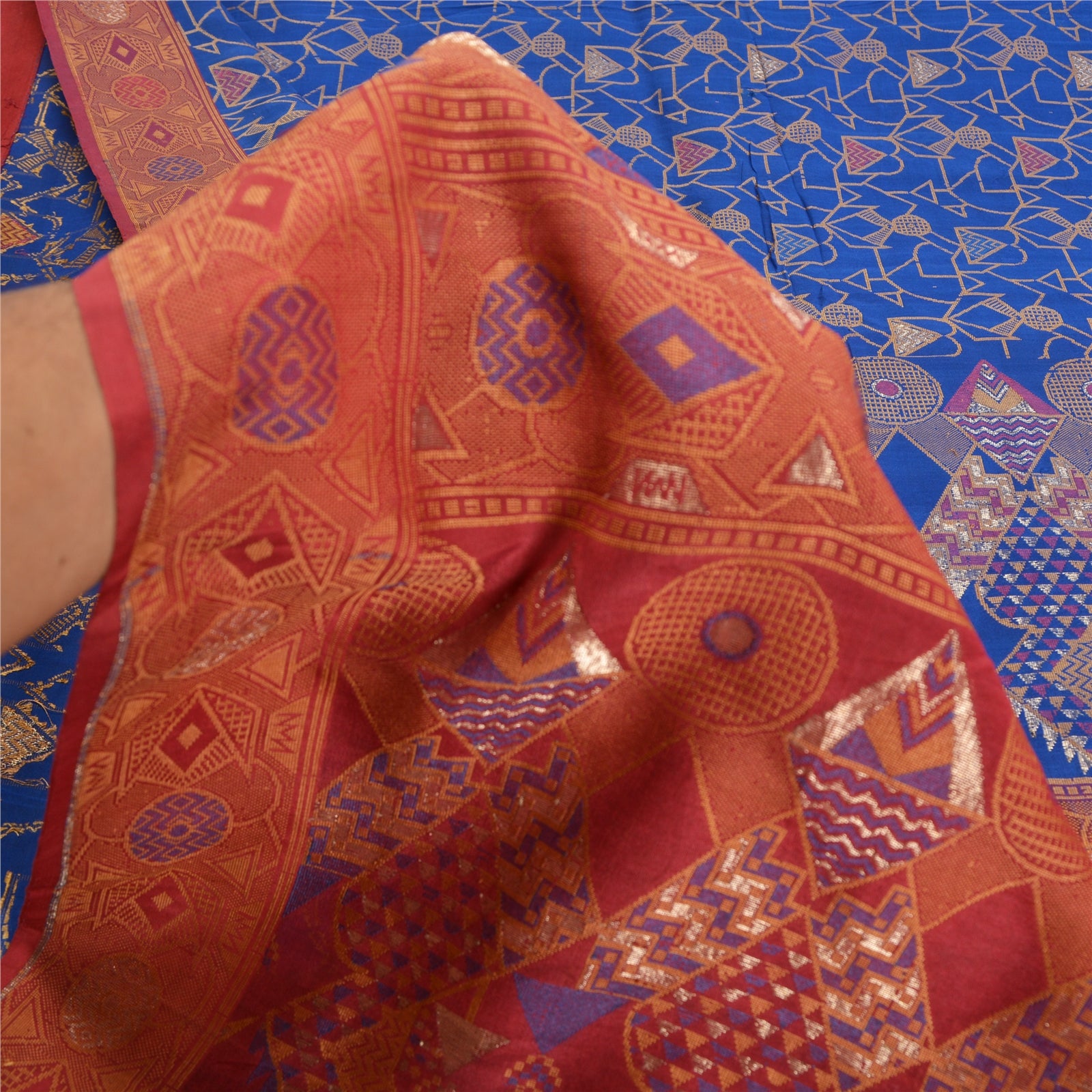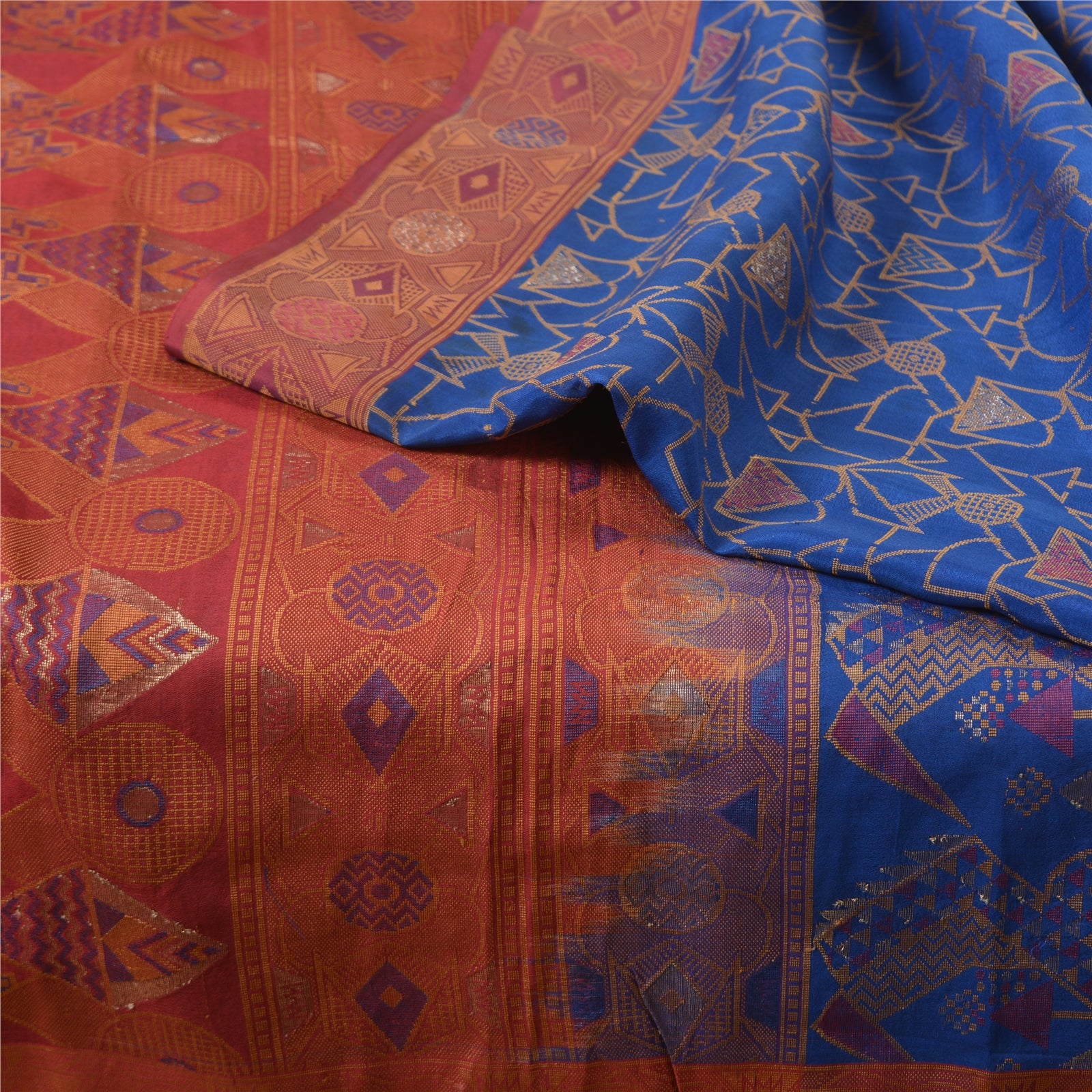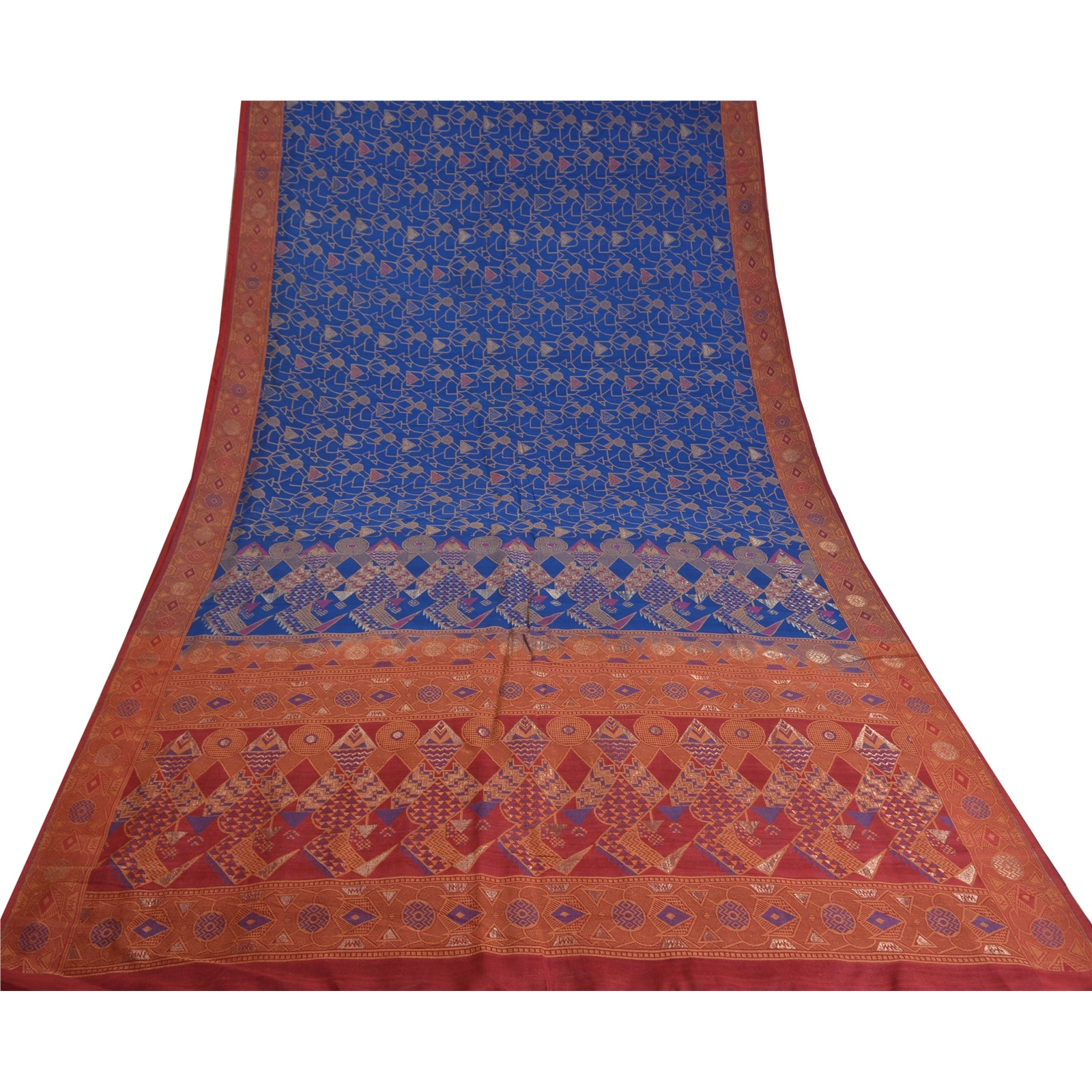 Sanskriti Vintage Blå/Mørkerøde Sarier 100% Ren Silke Vævet Tanchoi Sari Bæredygtigt Stof