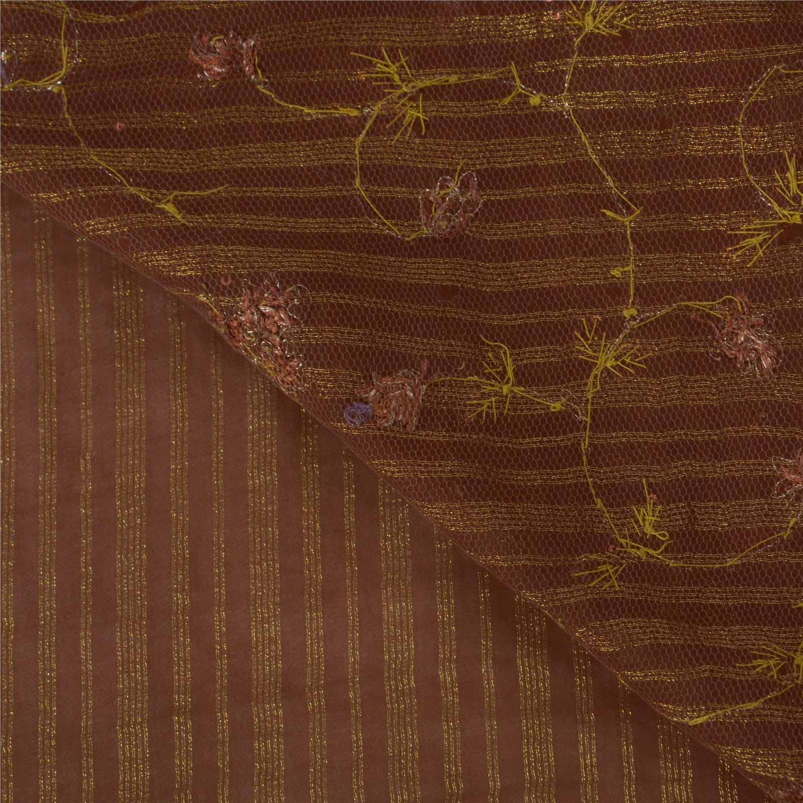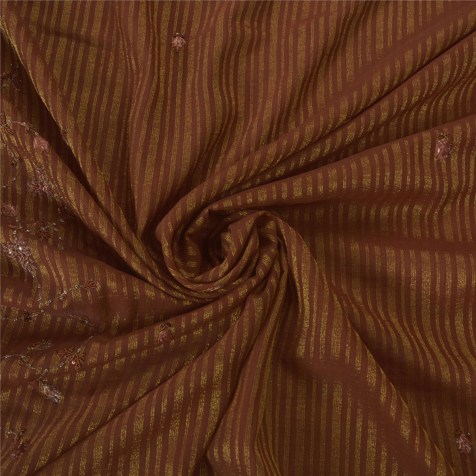 • Beautiful brown colored hand embroidered woven blend georgette sari. • Pallu & Border features floral design embellished with gold/orange thread work, gold zari work, copper/gold zardozi work, silver/copper sequins, gold beads work. • There are floral motifs with similar work in center part of sari. What is special about this saree? Awesome zari/zardozi work with floral design on brown color base fabric is really enhancing the beauty of the saree. This unique vintage saree can be used for various crafting ideas even if you don't want to use it as a sari. Design a dress, use it as a throw, as window dressing, upholstery, sarongs, table linen and much more. Let your creative juices flow and use this decorated fabric in multiple fashion.