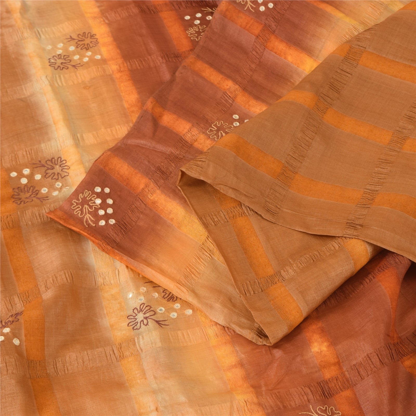 THE ITEM COLOR OR SHADE MAY BE DARKER OR LIGHTER THAN THE PICTURE.' Beautiful brown & saffron colored hand embroidered pure silk sari. Pallu & border features has floral design embellished with cream & purple color thread work & diy mirror rhinestone work. There are floral motifs with similar work in center part of sari. This item's Beauty Factor This unique vintage saree can be used for various crafting ideas even if you don't want to use it as a sari. Design a dress, use it as a throw, as window dressing, upholstery, sarongs, table linen and much more. Let your creative juices flow and use this decorated fabric in multiple fashion. Shipping note: International buyers please note: Import duties, taxes, and charges are not included in the item price or postage cost. These charges are the buyer's responsibility. Please check with your country's customs office to determine what these additional costs will be prior to bidding or buying. Buyer will pay custom duty/tax. It is calculated and charged differently by every country. As a seller I do not have any control over it. VAT or sales tax is calculated by the platform at the time of checkout. Customs charge is payable at the time of delivery. SKU: PS-29379