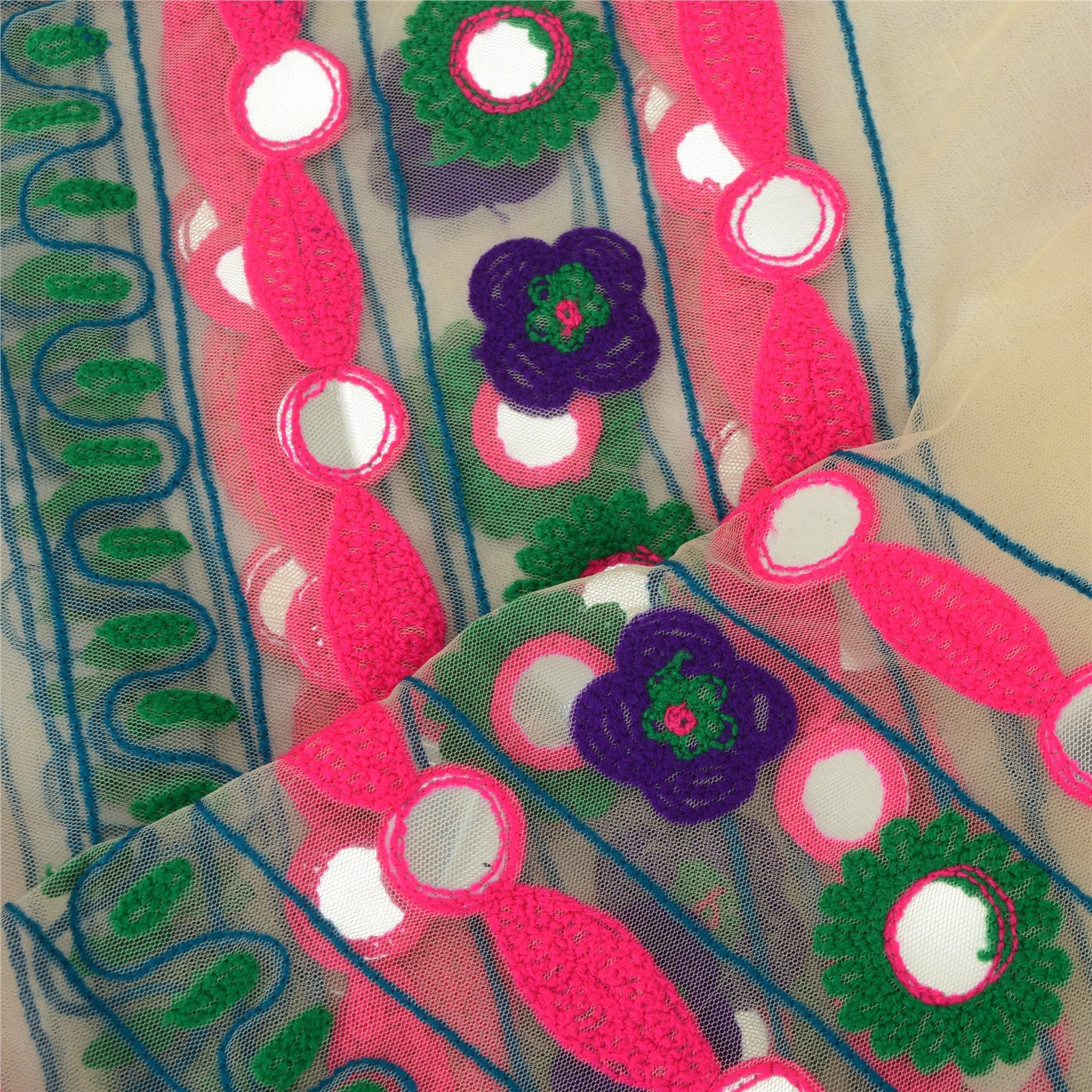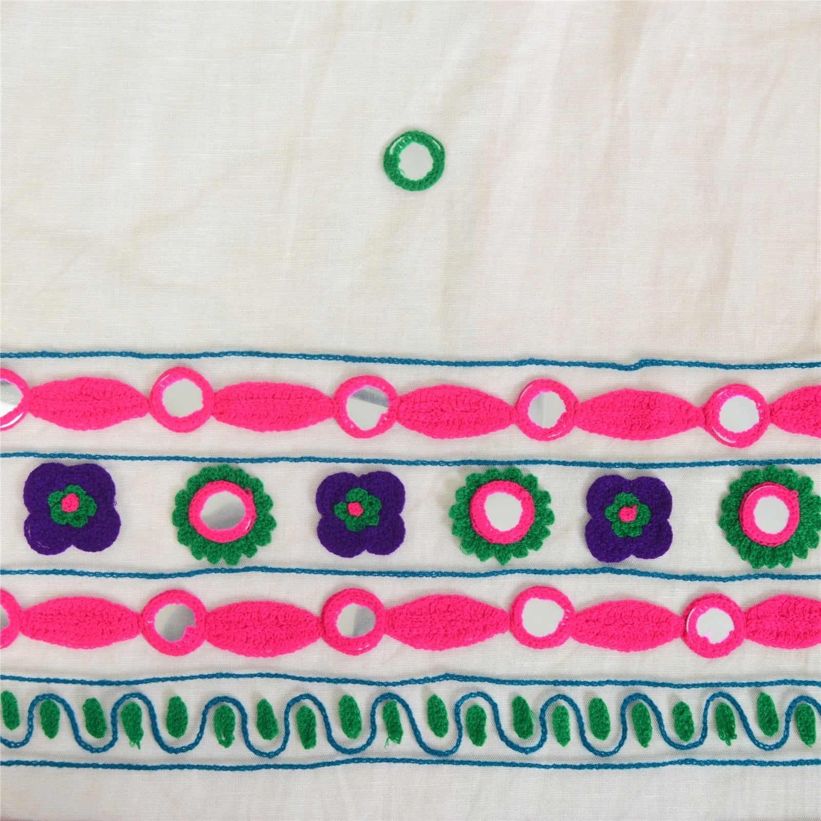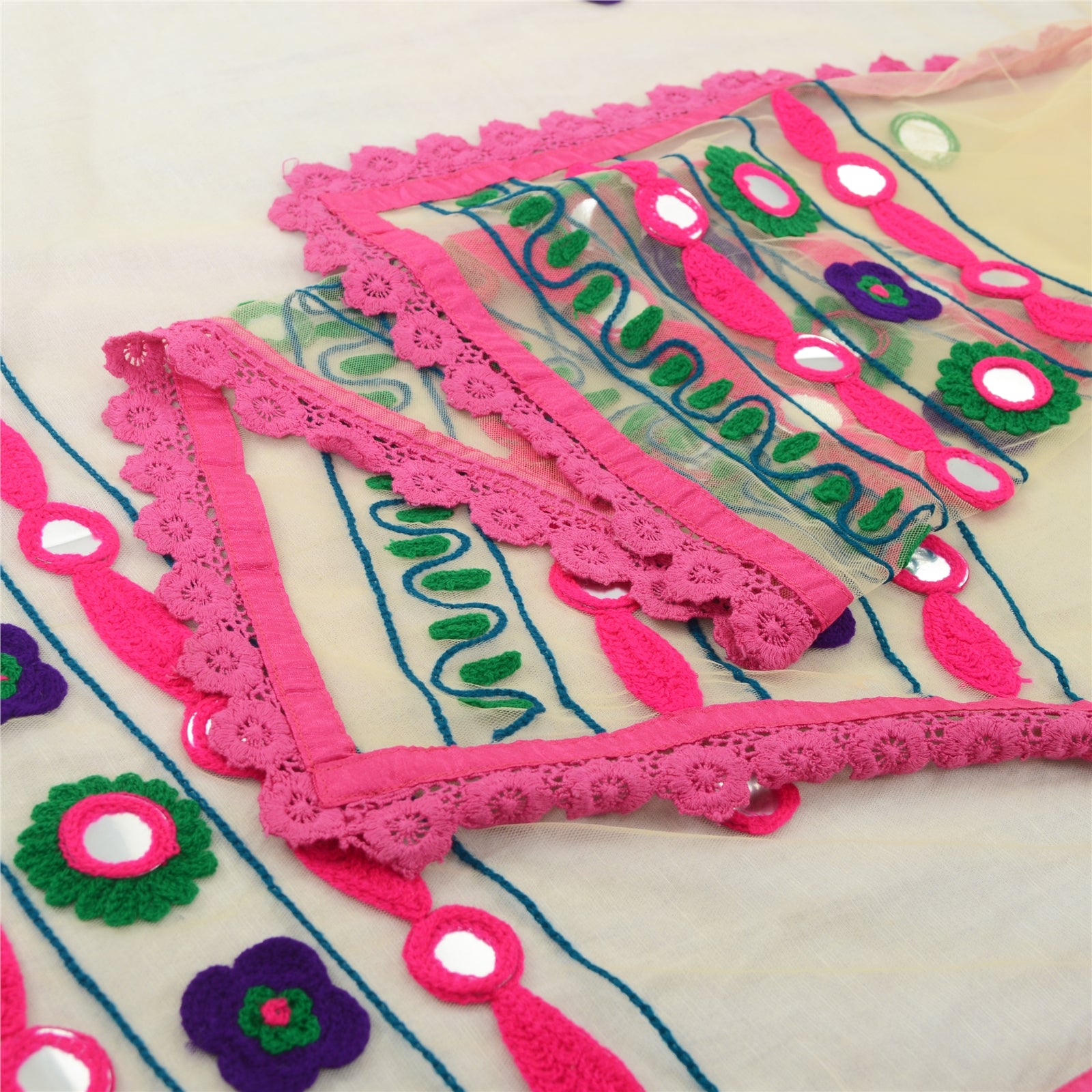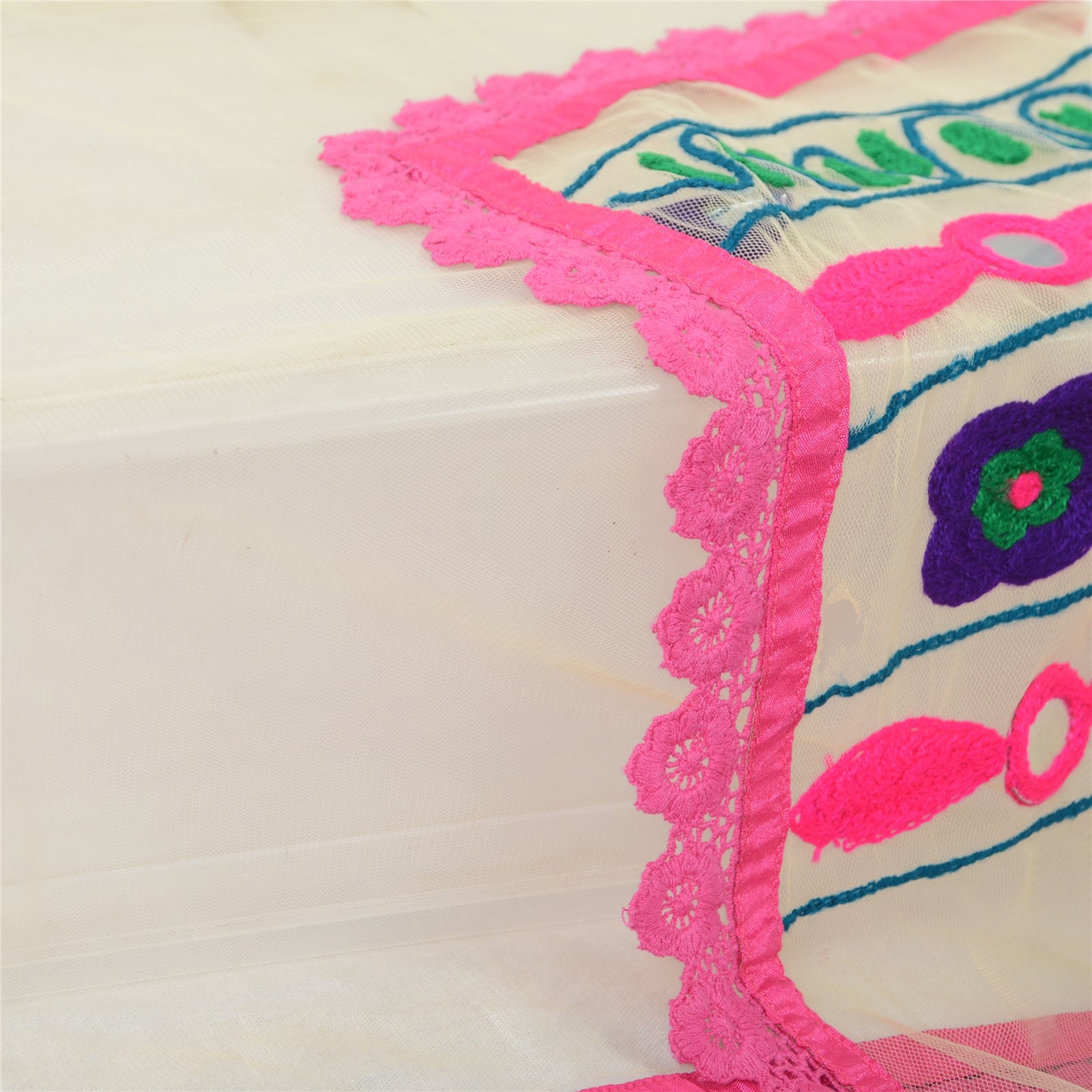 'THE ITEM COLOR OR SHADE MAY BE DARKER OR LIGHTER THAN THE PICTURE.' Beautiful cream colored net mesh hand embroidered long scarf/dupatta. The center portion has floral design with thread work . Border of the dupatta features has floral design embellished with green/purple/pink thread work, diy mirror rhinestone work . Also you can see pink lace work . This item's Beauty Factor Very colorful thread work with mirror work on cream color base fabric is really enhancing the beauty of the dupatta. This dupatta/stole can be used for various crafting ideas too. Use it for dress designing, as a throw, as window dressing, upholstery, table linen and much more. Let your creative juices flow. Shipping note: International buyers please note: Import duties, taxes, and charges are not included in the item price or postage cost. These charges are the buyer's responsibility. Please check with your country's customs office to determine what these additional costs will be prior to bidding or buying. Buyer will pay custom duty/tax. It is calculated and charged differently by every country. As a seller I do not have any control over it. VAT or sales tax is calculated by the platform at the time of checkout. Customs charge is payable at the time of delivery.'