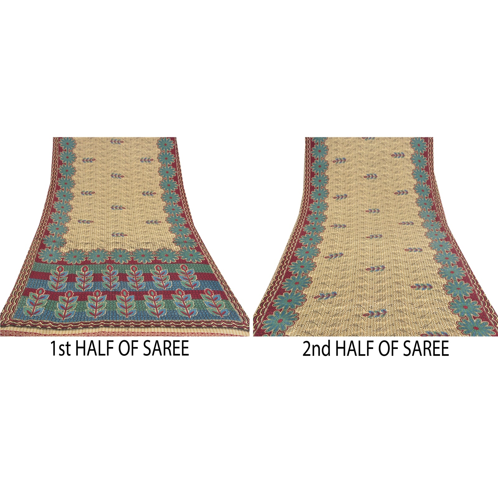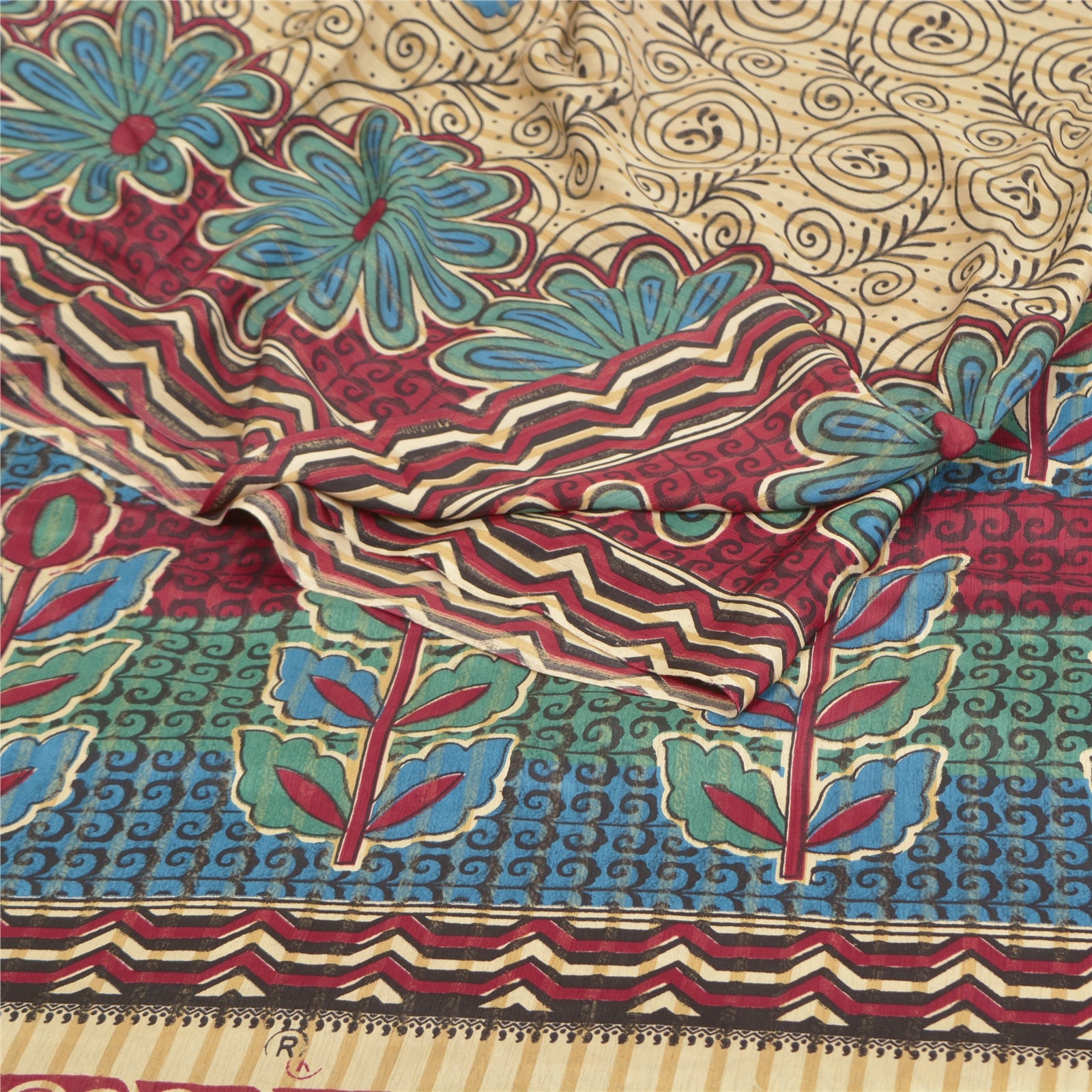 Sanskriti Vintage Cream Sarees Moss Crepe Floral Printed Craft Fabric Sari