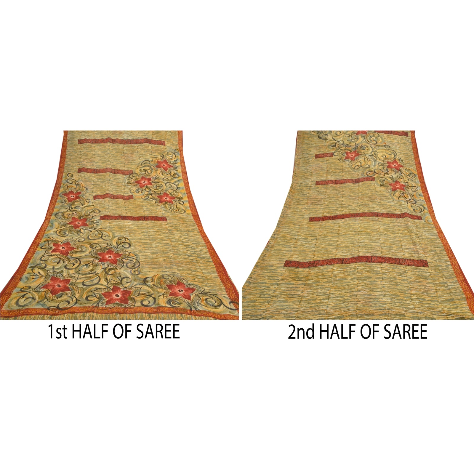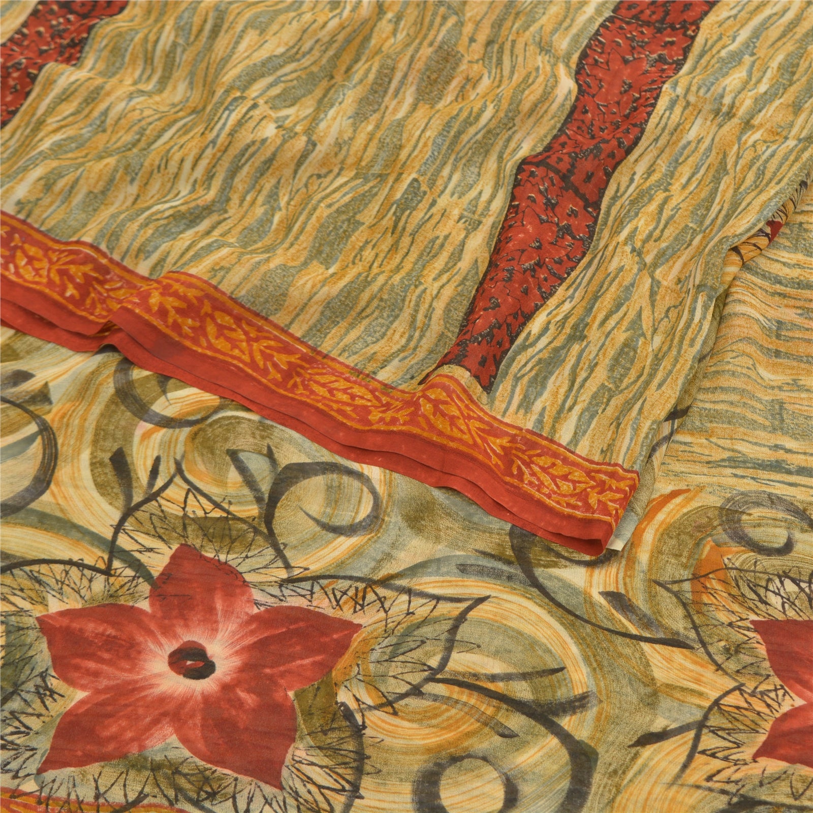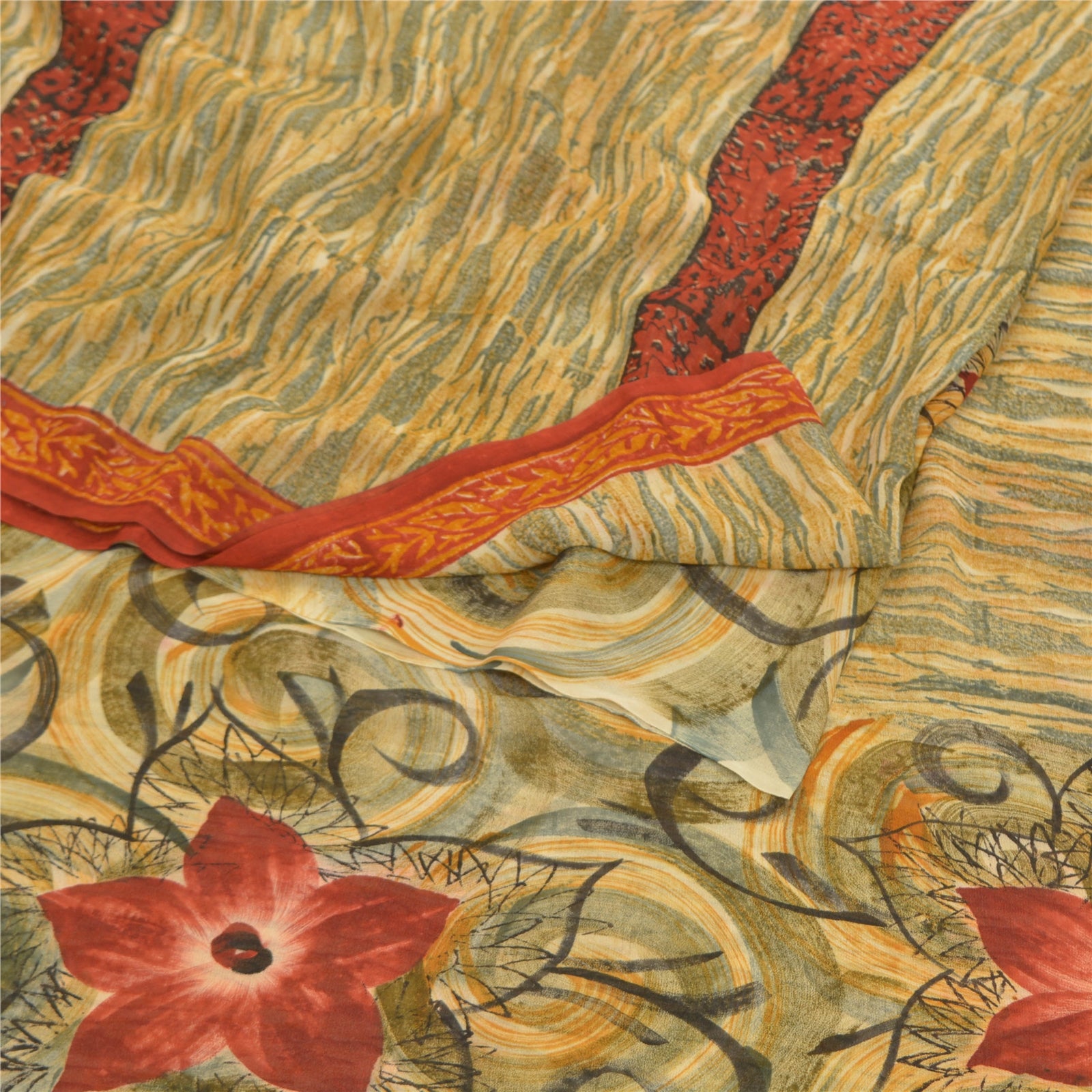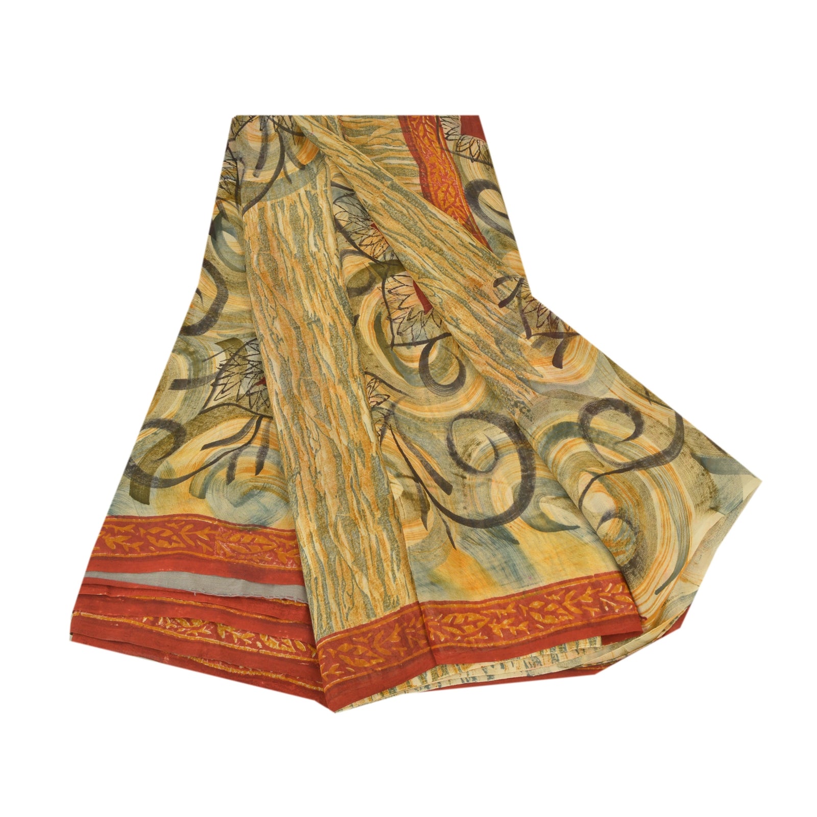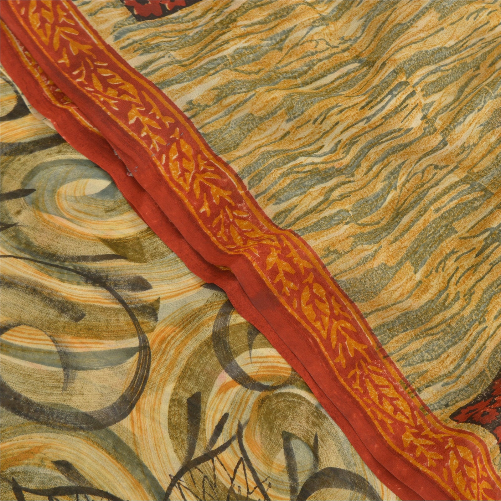 Sanskriti Vintage Cremefarvede Sarier Ren Georgette Silke Trykt Sari 5YD Håndværk Bæredygtigt Stoff