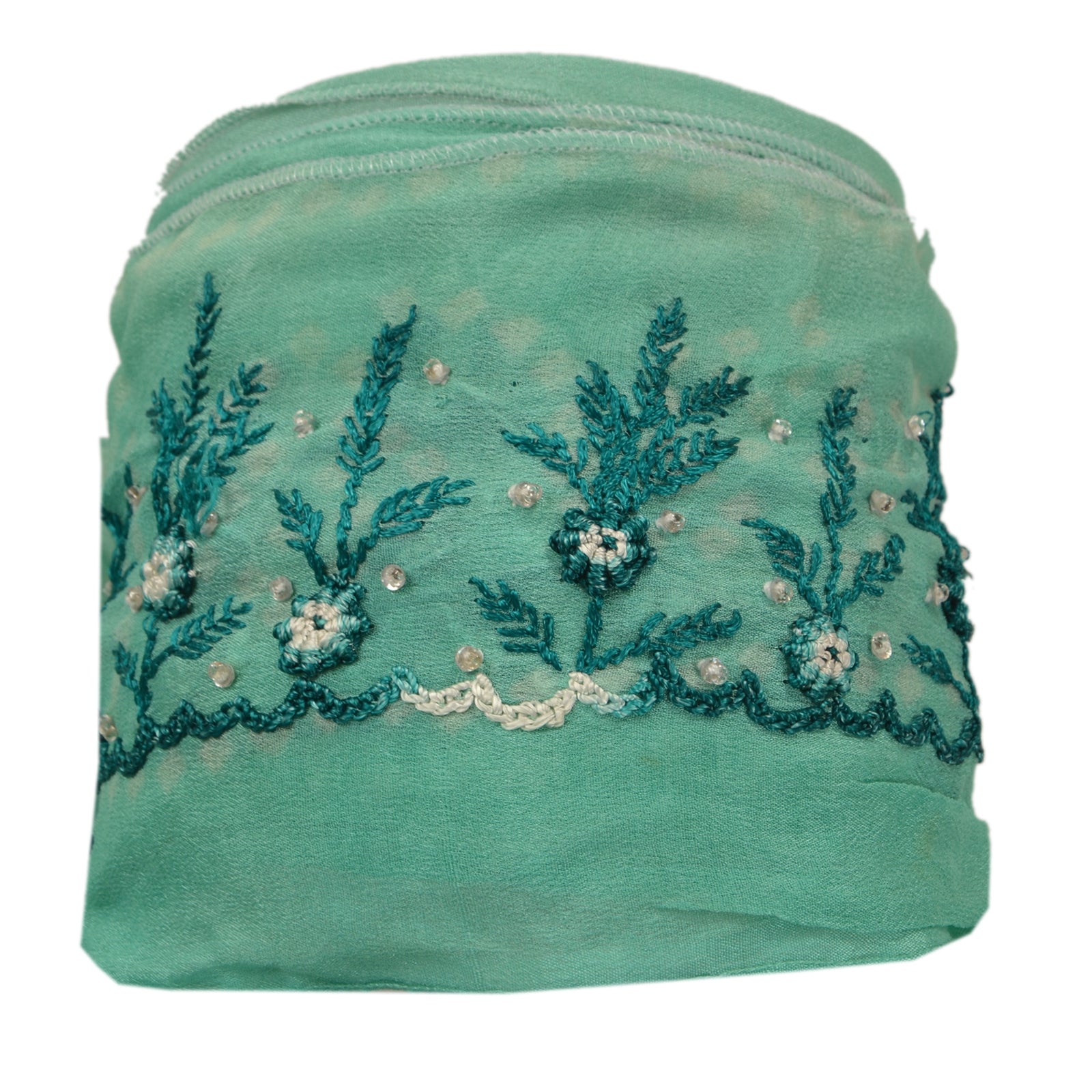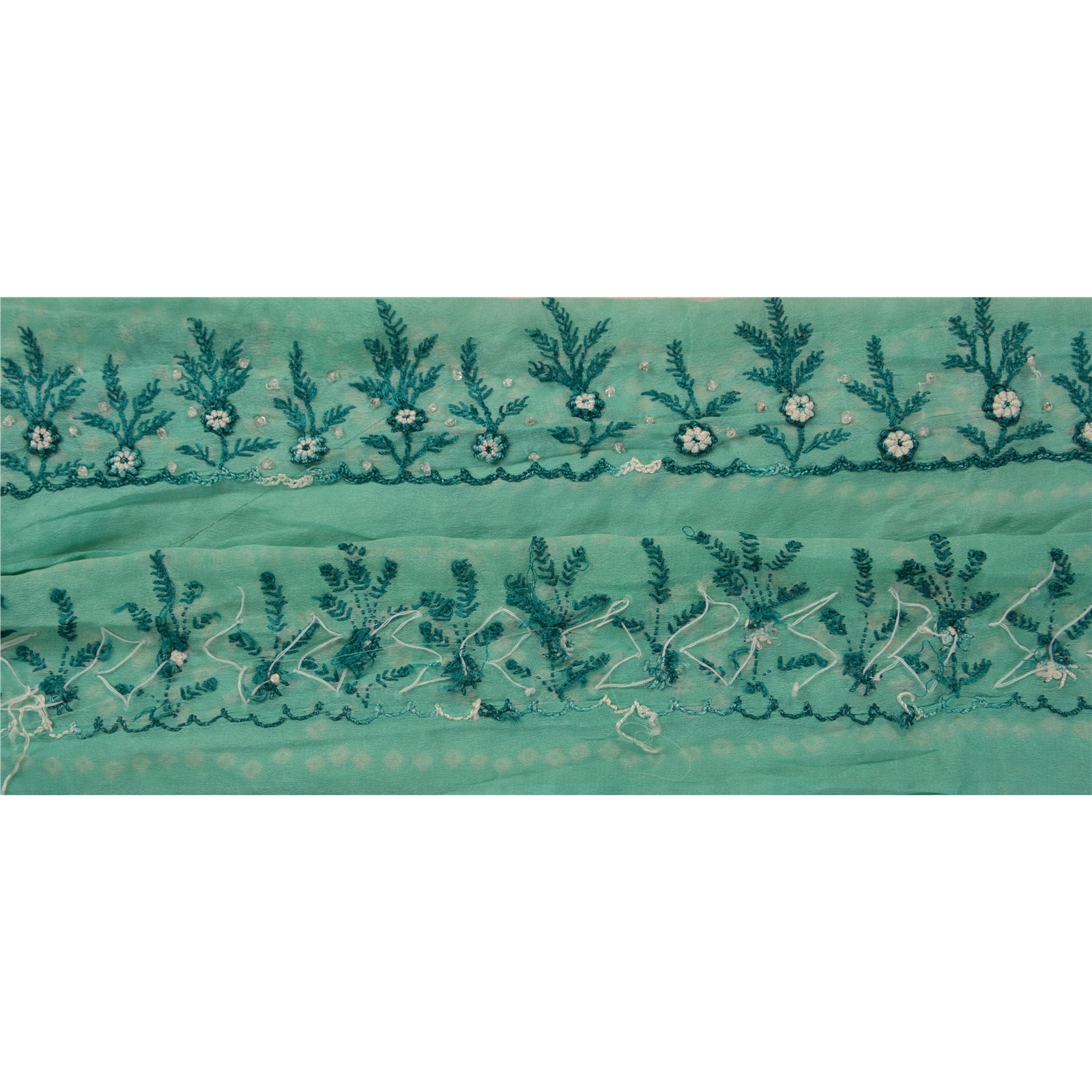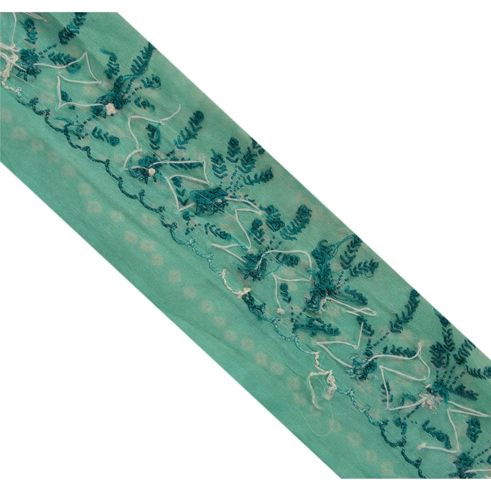 Amazing georgette hand beaded Bandhani sari border in green color highlighting thread work. Border has beautiful floral patterns painstakingly hand beaded with green/cream thread work. Further you can see fine detailing with silver sequins, white glass beads work. WOW!! an awesome one of a kind versatile border. 1 Quantity =1 Yard B-13007