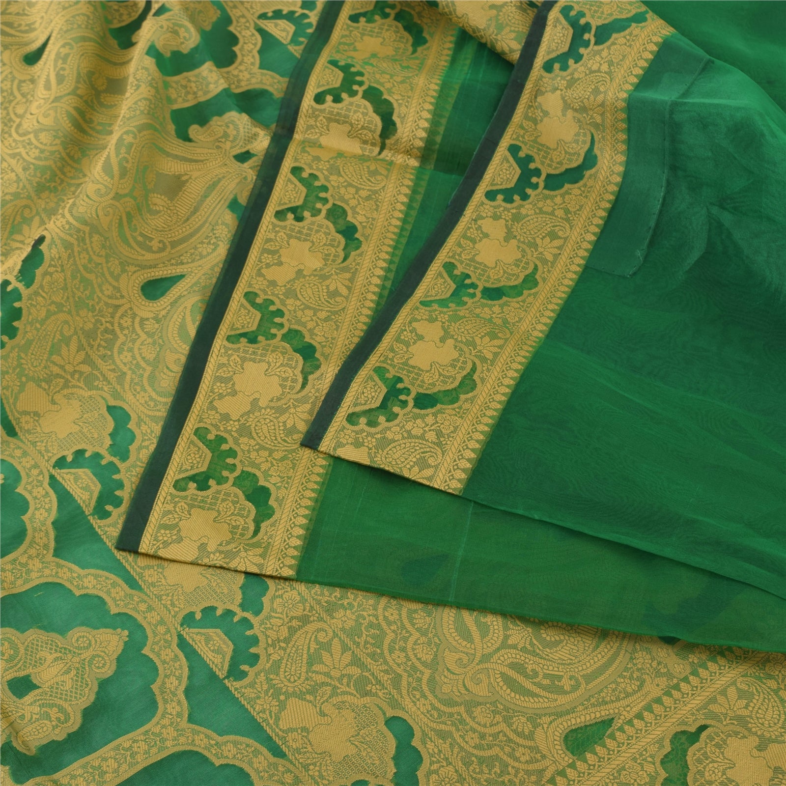 THE ITEM COLOR OR SHADE MAY BE DARKER OR LIGHTER THAN THE PICTURE.' An Awesome Sari In 100% Pure Silk Green Colored Woven work Sari/Fabric. Pallu & Border Features floral design embellished with golden woven work. You Can See Center Portion Of The Sari Has solid green color This unique vintage saree can be used for various crafting ideas for example design a dress, use it as a throw, as window dressing, upholstery, table linen and much more. Let your creative juices flow and use this decorated fabric in multiple fashion Shipping note: International buyers please note: Import duties, taxes, and charges are not included in the item price or postage cost. These charges are the buyer's responsibility. Please check with your country's customs office to determine what these additional costs will be prior to bidding or buying. Buyer will pay custom duty/tax. It is calculated and charged differently by every country. As a seller I do not have any control over it. VAT or sales tax is calculated by the platform at the time of checkout. Customs charge is payable at the time of delivery. SKU: PS-64054