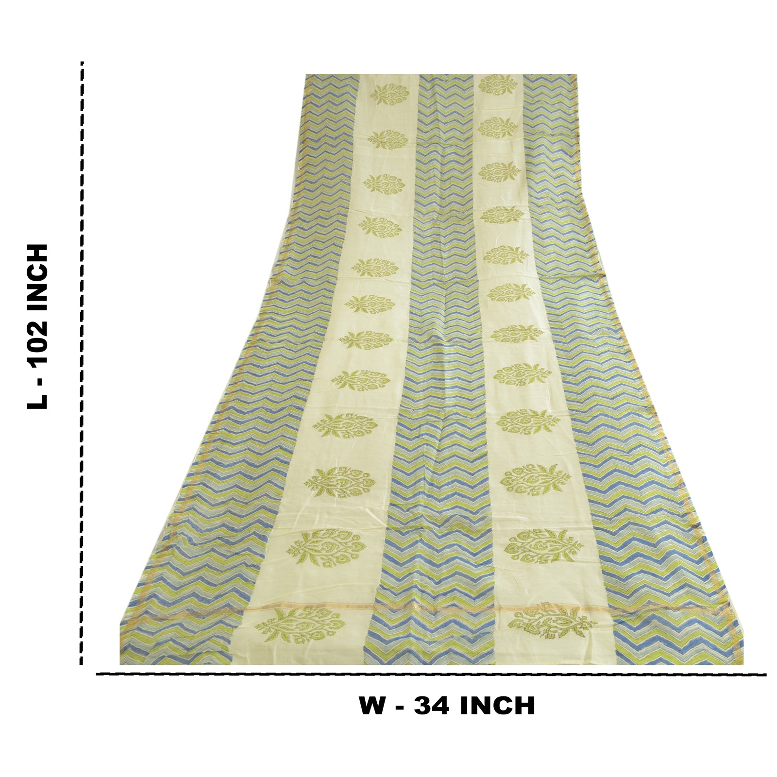'VARENS FARVE ELLER NUANCE KAN VÆRE MØRKERE ELLER LYSERE END BILLEDET.' Elegant cremefarvet, håndbloktrykt, langt tørklæde/dupatta i bomuldssilke. Den overordnede stola har håndbloktrykt blomster- og zigzag-design med blød bund. Bæredygtigt stof fremhæver virkelig dupattaens/stolens skønhed. Du kan også se gyldent vævet arbejde på kanterne. Denne dupatta/stola kan også bruges til forskellige kreative idéer. Brug den til kjoledesign, som tæppe, som vinduesdekoration, polstring, bordlinned og meget mere. Lad dine kreative safter få frit løb.