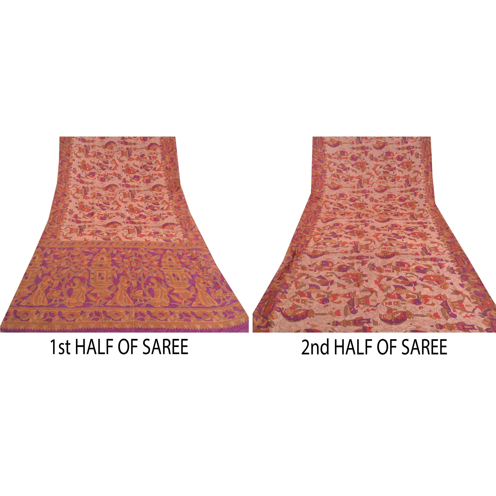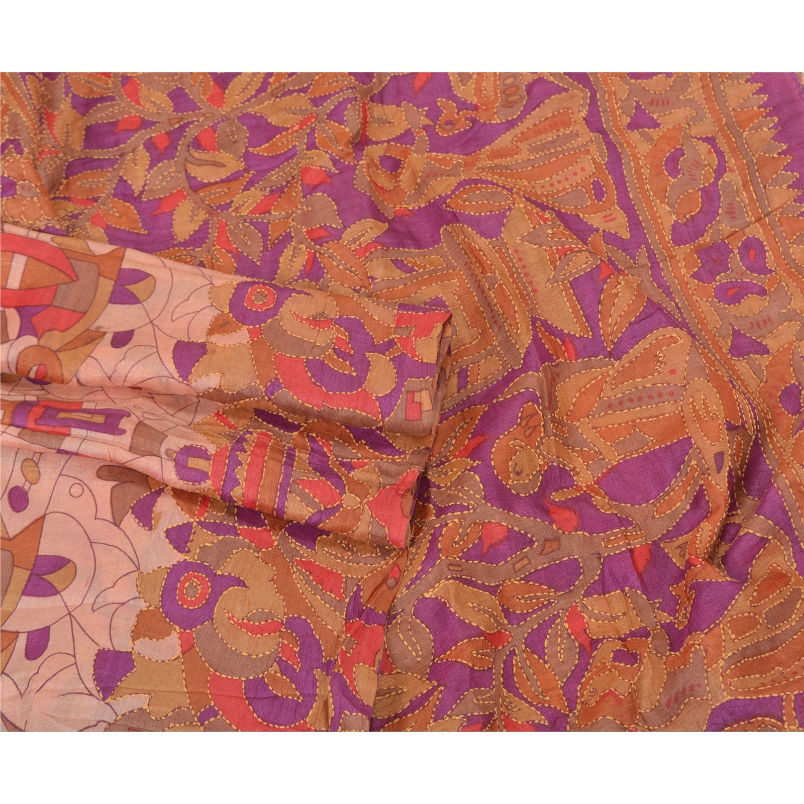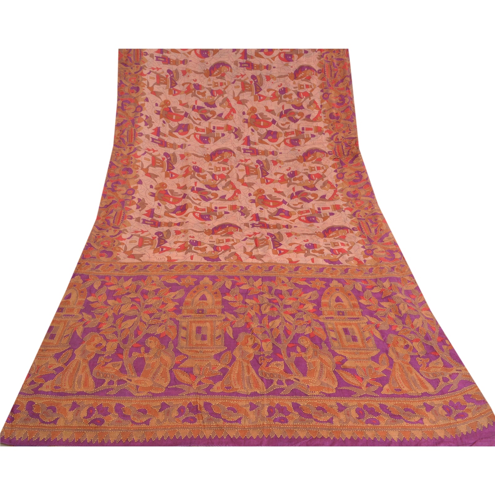 Smuk lyserød og lilla farvet 100% ren silke håndbroderet Kantha og trykt Sari. Pallu & Border har trykte blomster-, menneske- og dyremønstre, der er udsmykket med løbende sting (Kantha-broderi) og sølvpailletter. Midten af sarien har lignende trykte blomster-, menneske- og abstrakte mønstre med trådarbejde. Denne sari kan også bruges til forskellige kreative idéer. Brug den til kjoledesign, som tæppe, som vinduesdekoration, polstring, bordlinned og meget mere. Slip dine kreative safter løs.