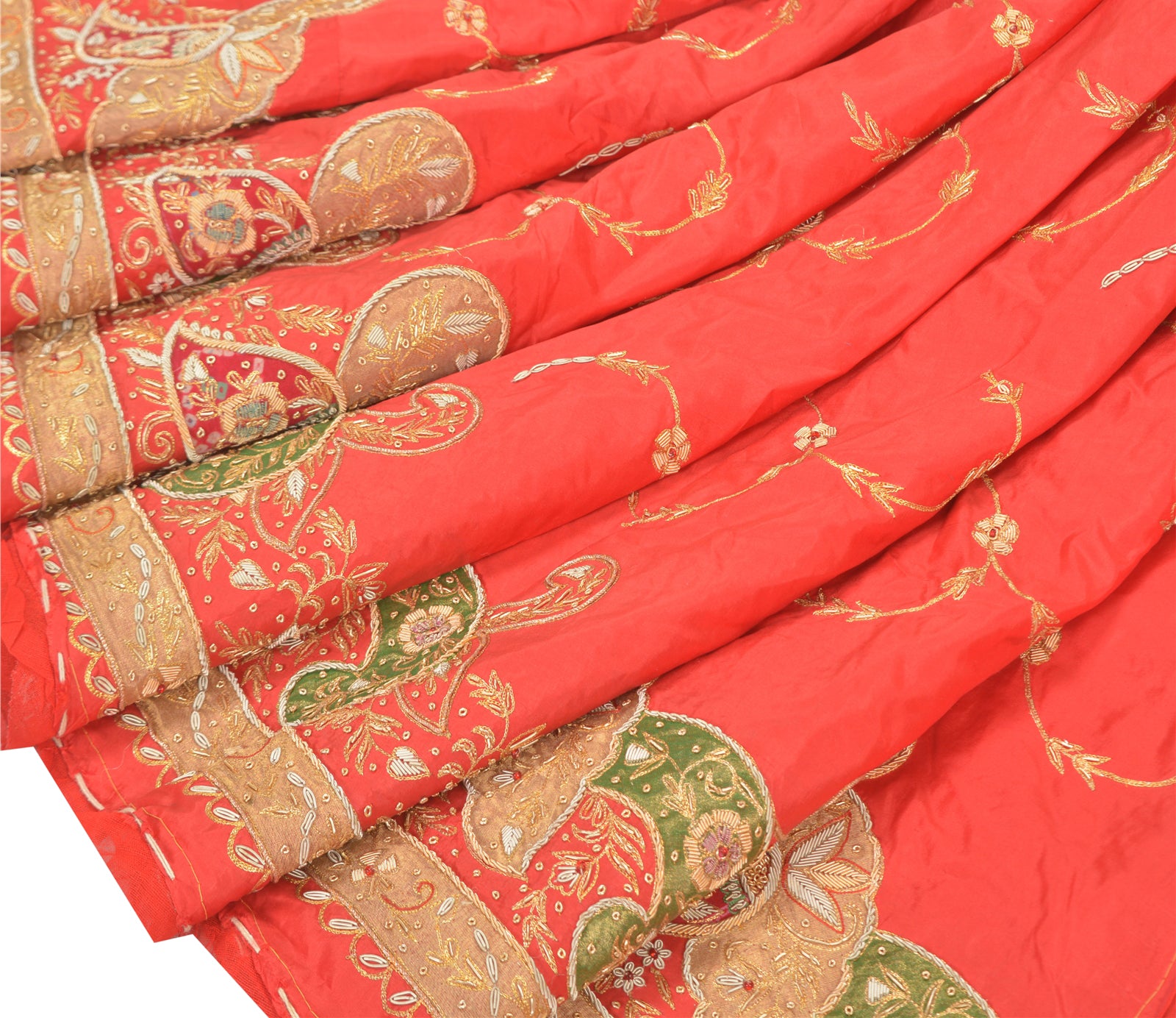 Awesome red colored vintage artificial silk hand embroidered unstitched lehenga. Bottom of lehenga features floral design embellished with pure metallic golden zardozi, zari, dori, thread, & red glass beaded work on multicolor fabric patch. Similar work on allover lehenga. Length-42, Flare-159 inches Flaunt this heavy lehenga with ethnic tops, blouses or kurtis at parties, weddings and other occasions. A one of a kind item hard to find. Awesome craftsmanship. THE ITEM COLOR OR SHADE MAY BE DARKER OR LIGHTER THAN THE PICTURE.' International buyers please note: Import duties, taxes, and charges are not included in the item price or postage cost. Buyer will pay custom duty/tax,VAT, and any applicable charges at the time of delivery. L-758