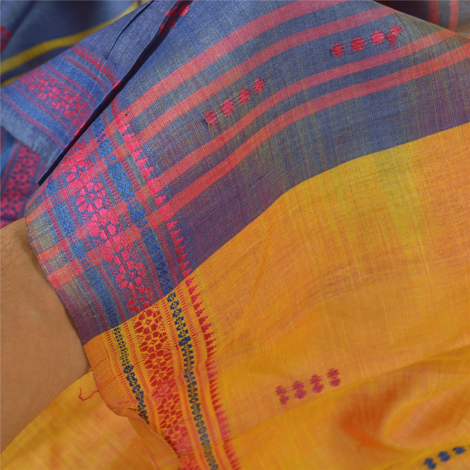 Enestående sari i safran og blå farvet, håndvævet, kraftig sari i 100% ren silke. Pallu & Border har trådarbejde i en kombination af pink/gul farve og blomstermotiver. Du kan se lignende vævet med blomstermotiver i midten af sarien. Da varen er vintage, kan der forventes mindre pletter og defekter. Denne tunge sari kan også bruges til forskellige kreative idéer. Brug den til kjoledesign, som tæppe, som vinduesdekoration, polstring, bordlinned og meget mere. Slip dine kreative safter løs!