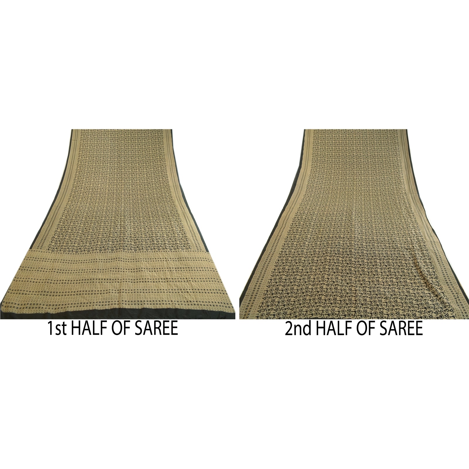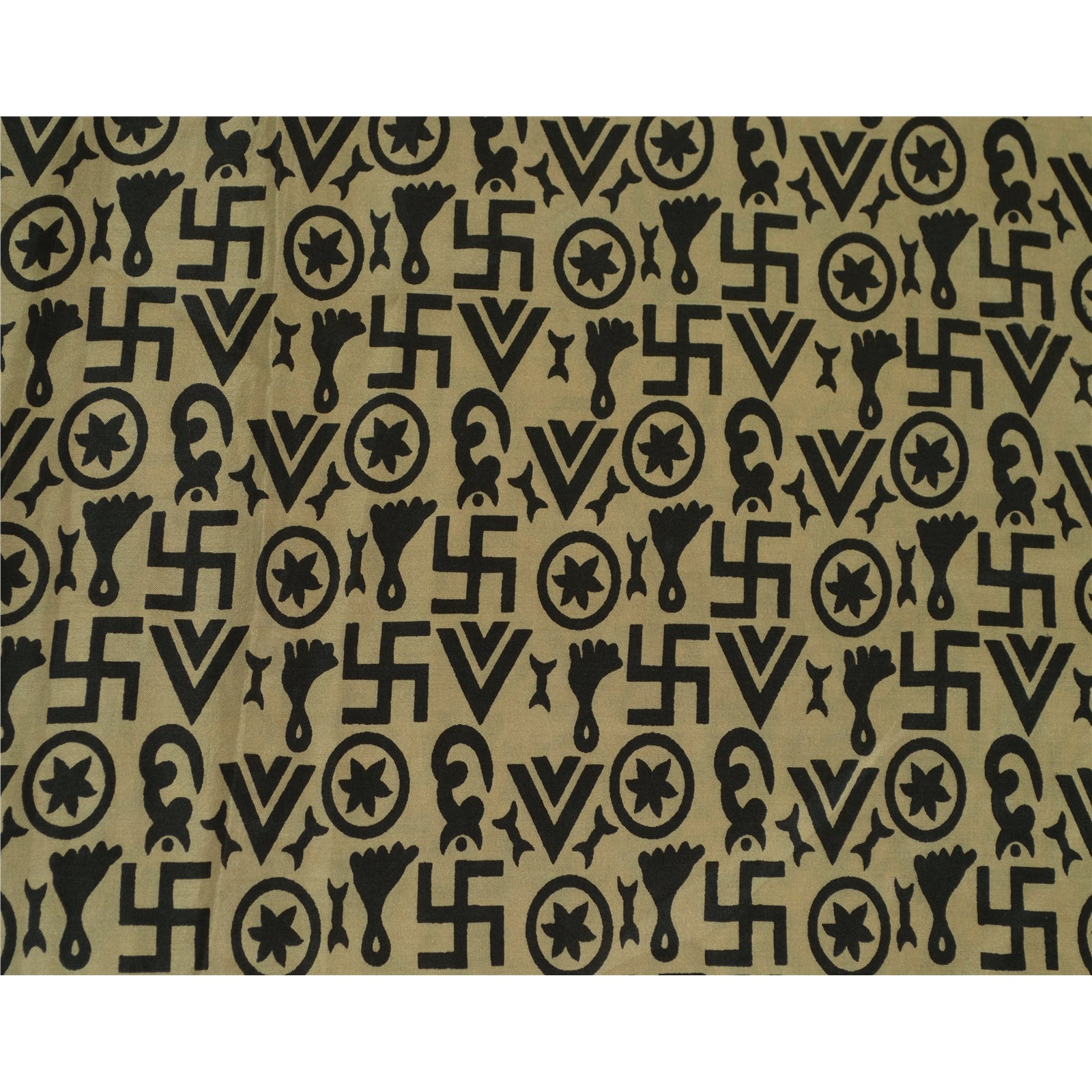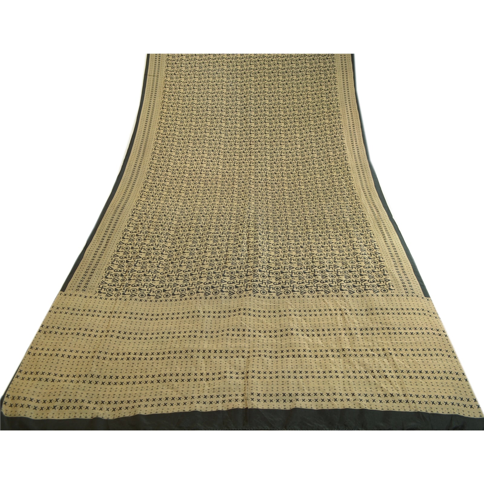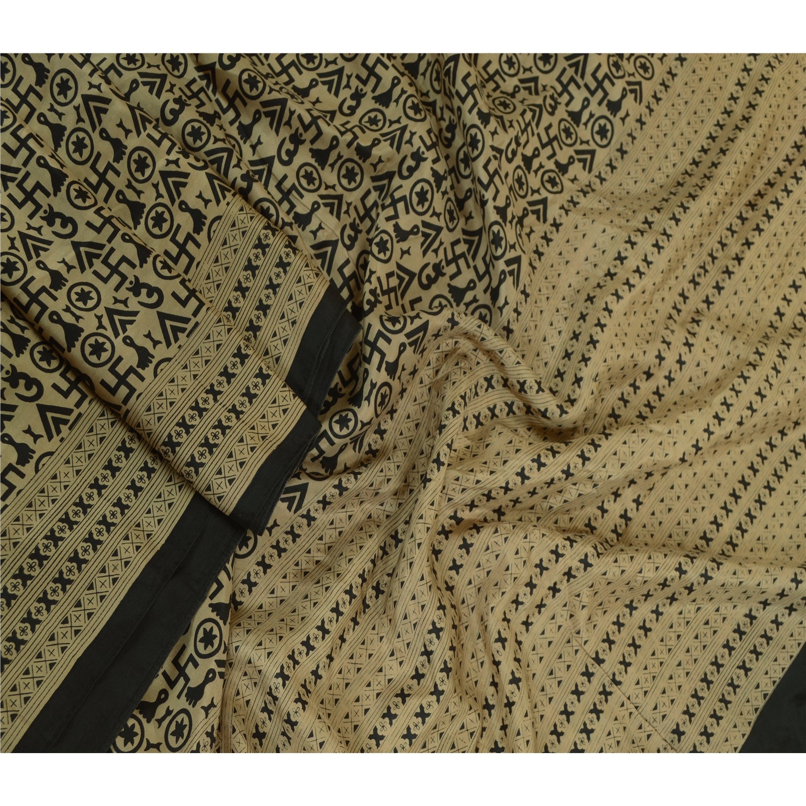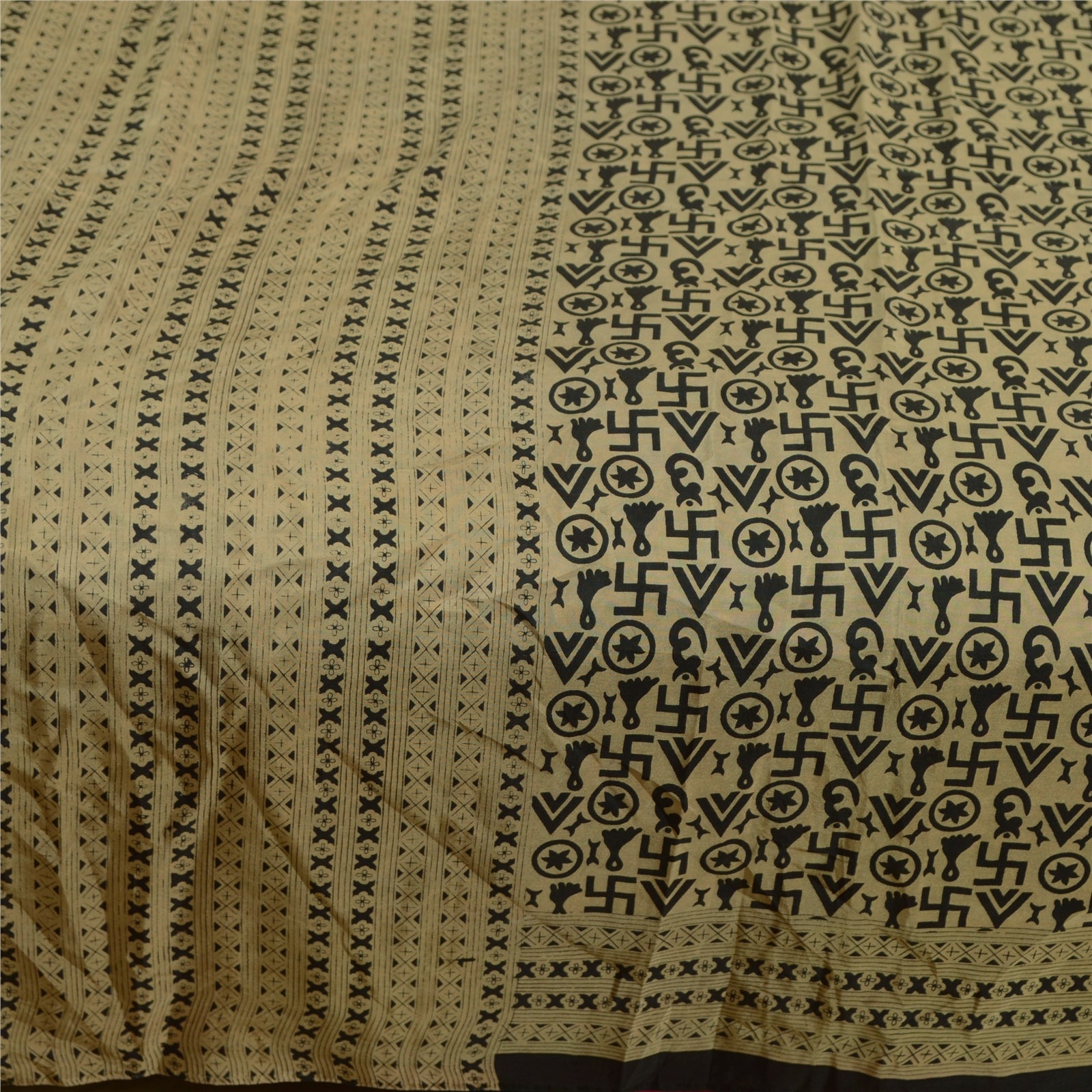 Sanskriti Vintage Sarees Beige Religiøse Symboler Trykt Ren Silke Sari Bæredygtigt Stof