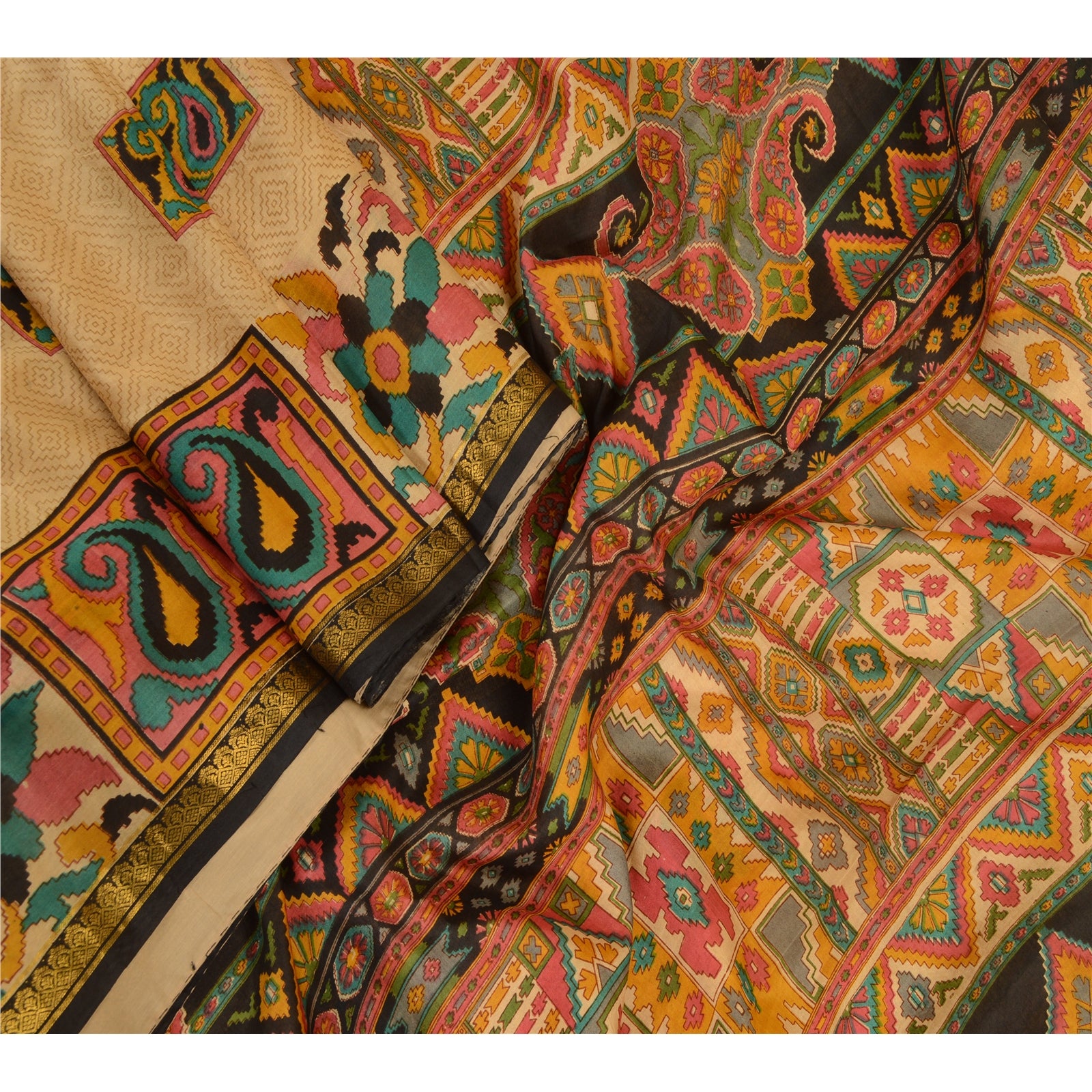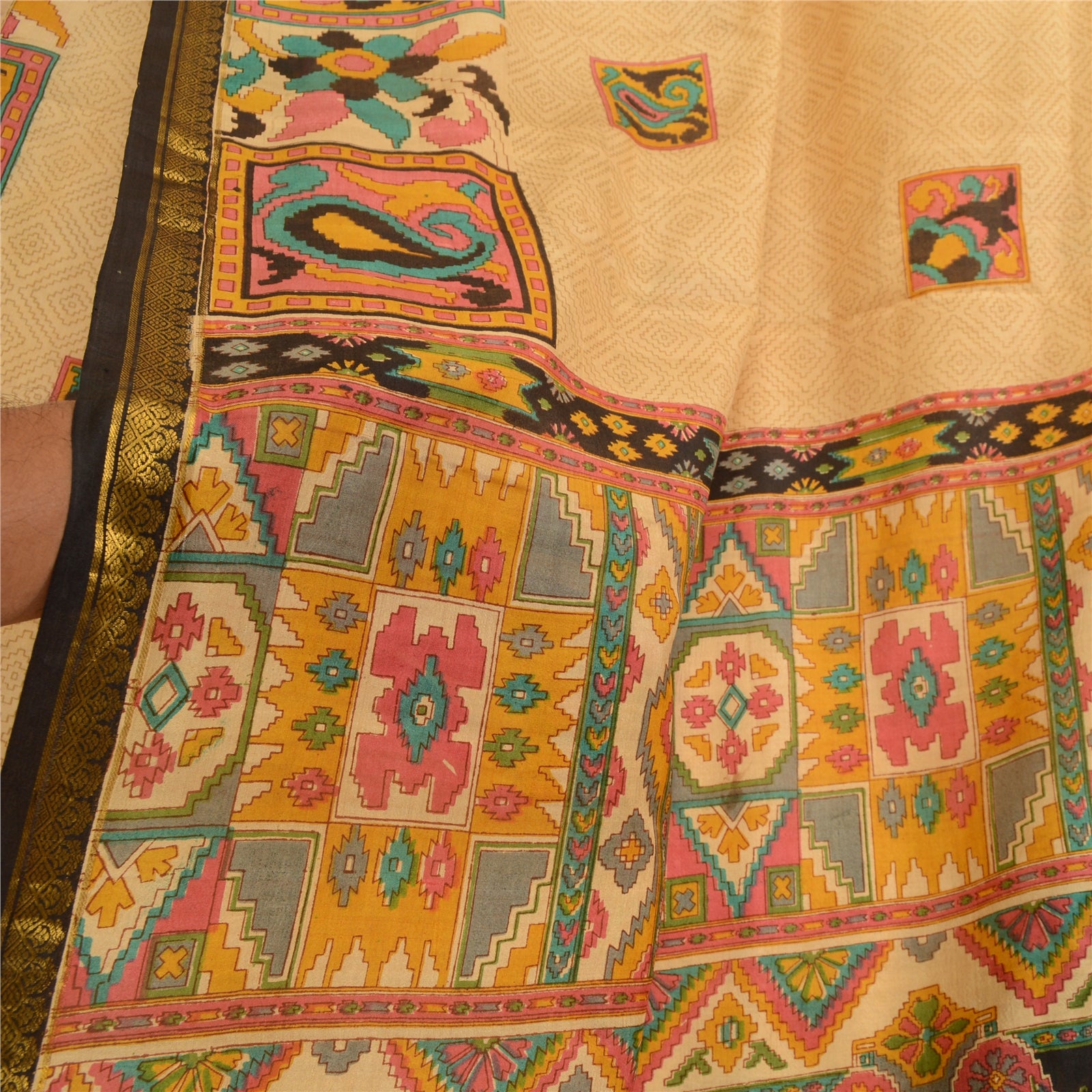 Sanskriti Vintage Sarees Beige Zari Kant Ren Silke Trykt Sari Håndværk Bæredygtigt Stoff