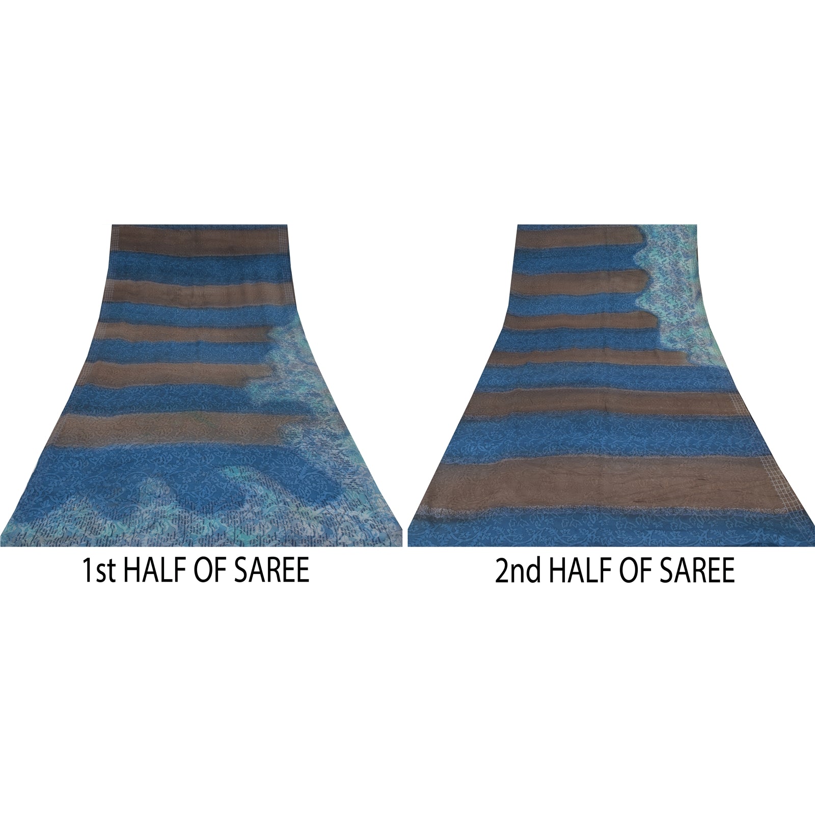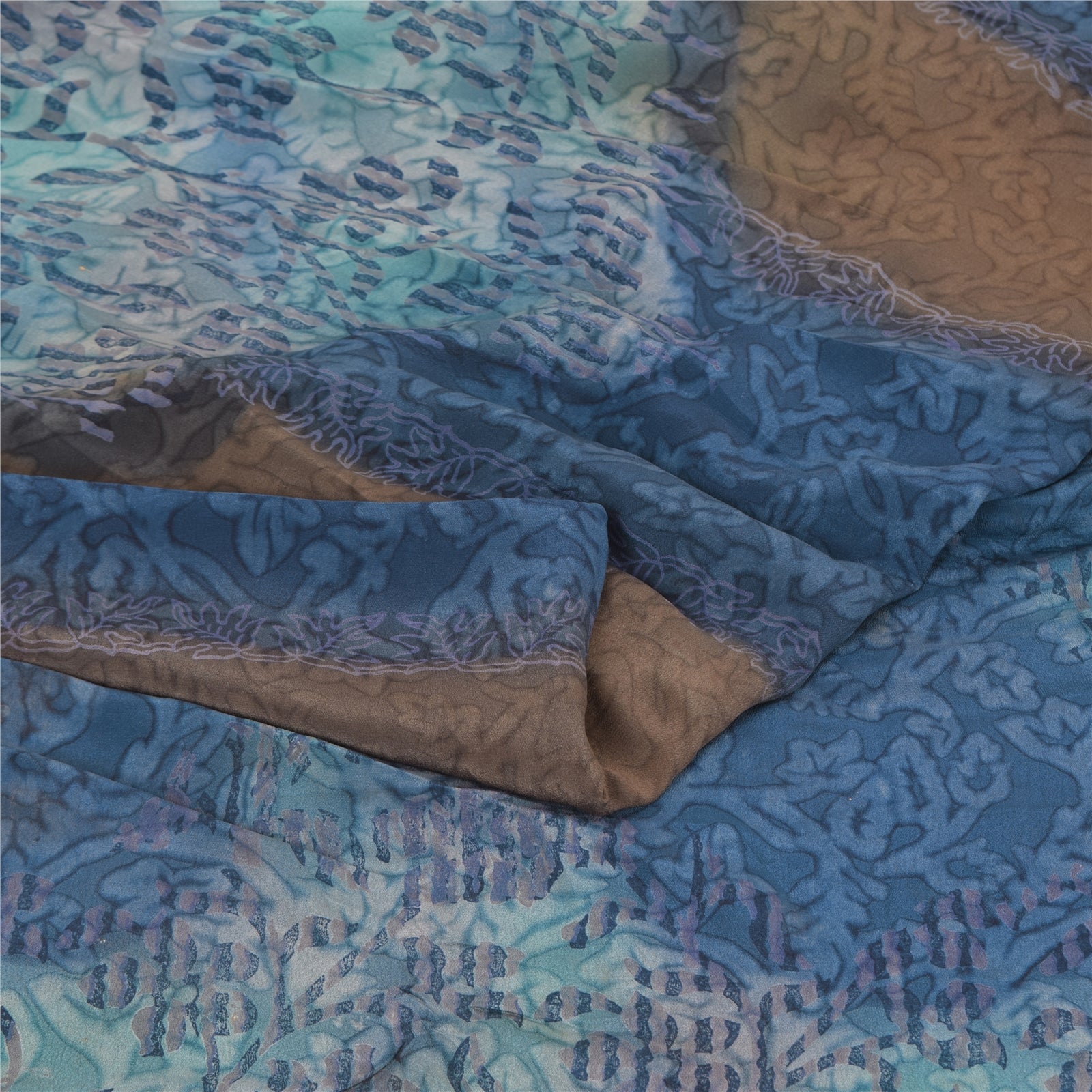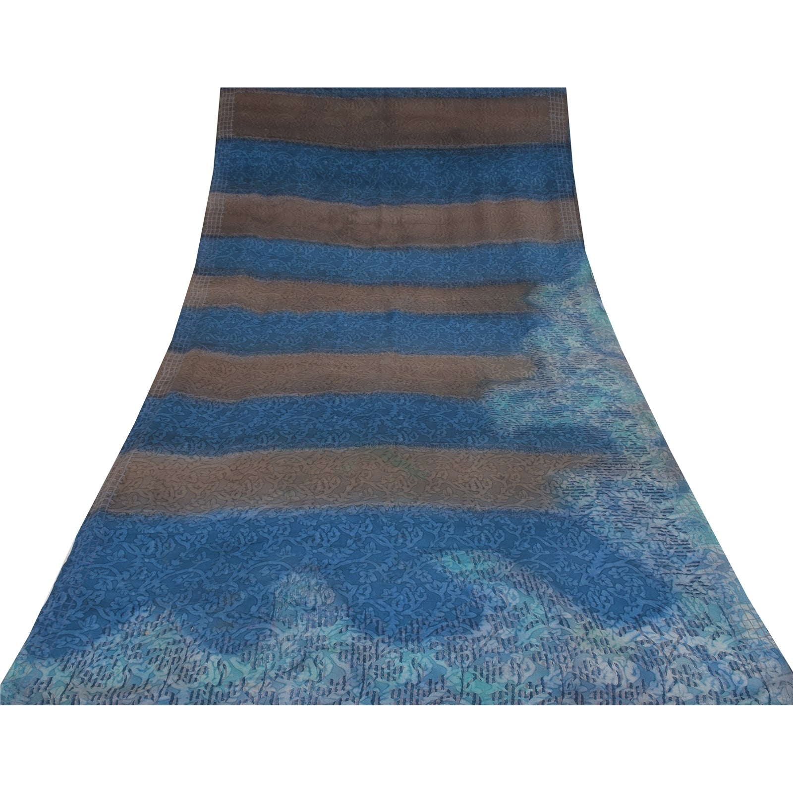 Sanskriti Vintage Sarier Blå/Brun Sari i Ren Crepe Silke Print, 5+ yards Håndværksmæssigt Bæredygtigt Stoff