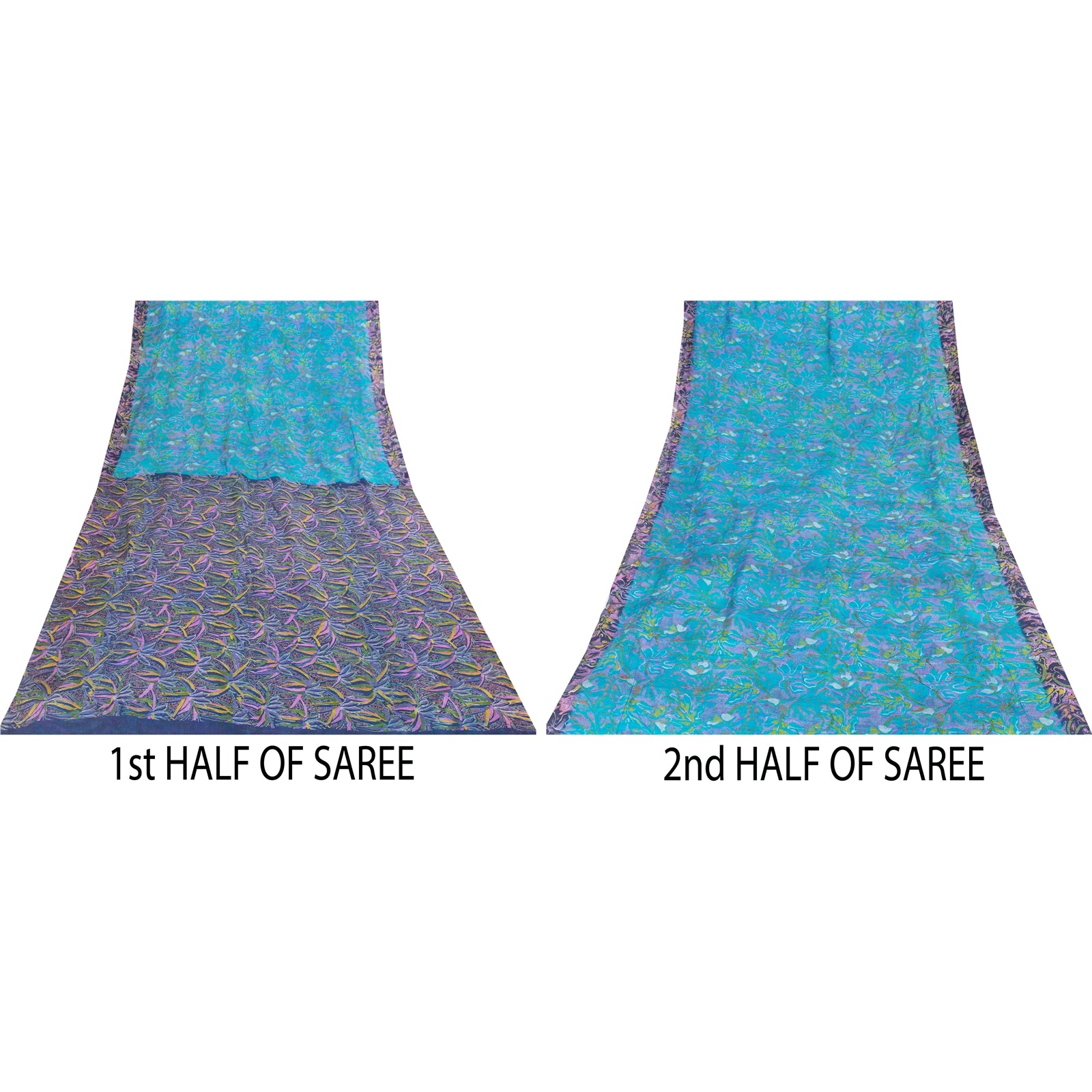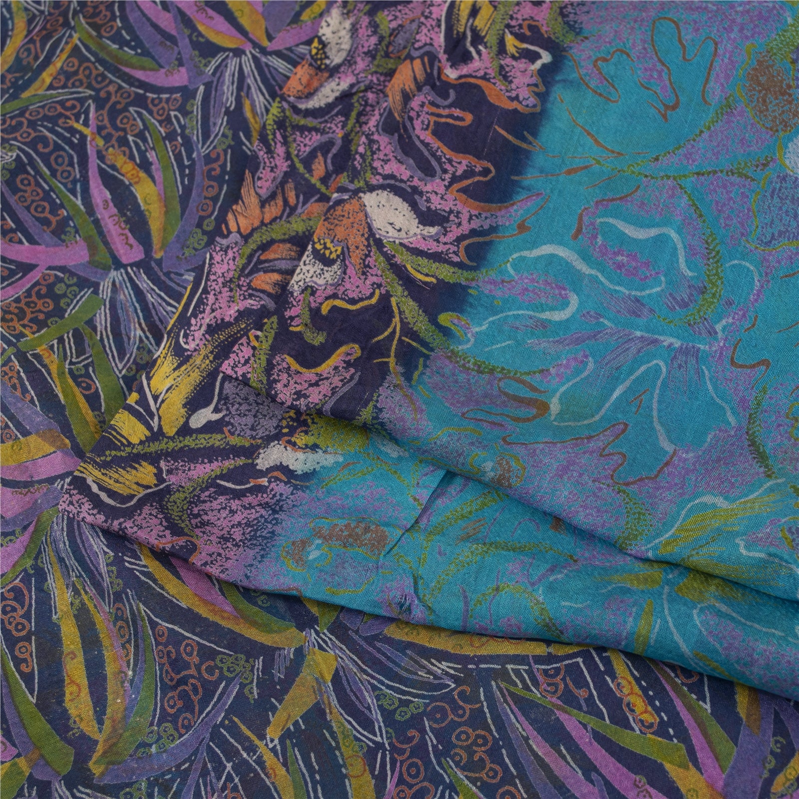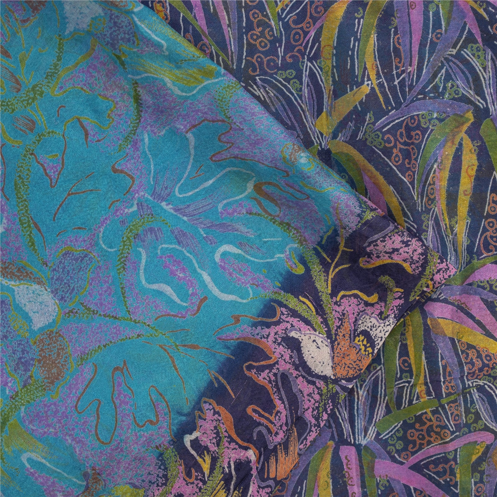 Sanskriti Vintage Sarees Blue Indian 100%Pure Silk Printed Sari 6yd Craft Fabric