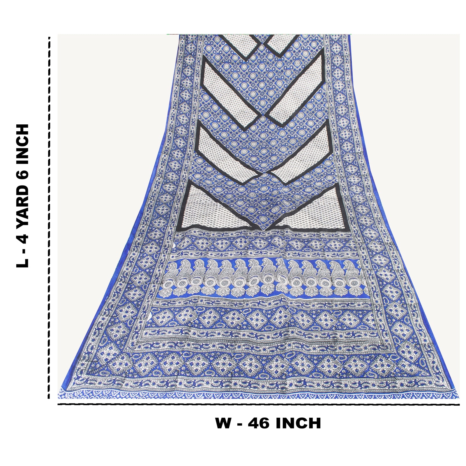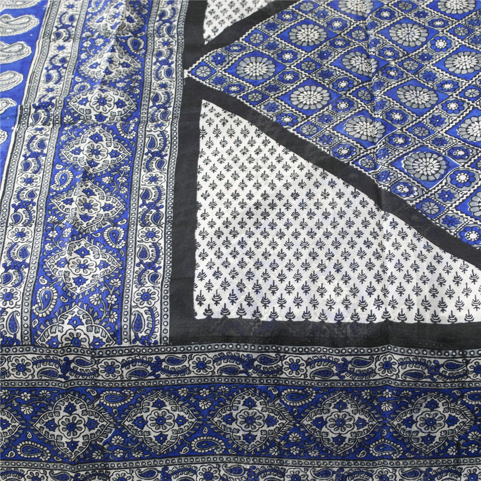 Sanskriti Vintage Sarees Blue & White 100% Pure Silk Printed Sari Craft Fabric