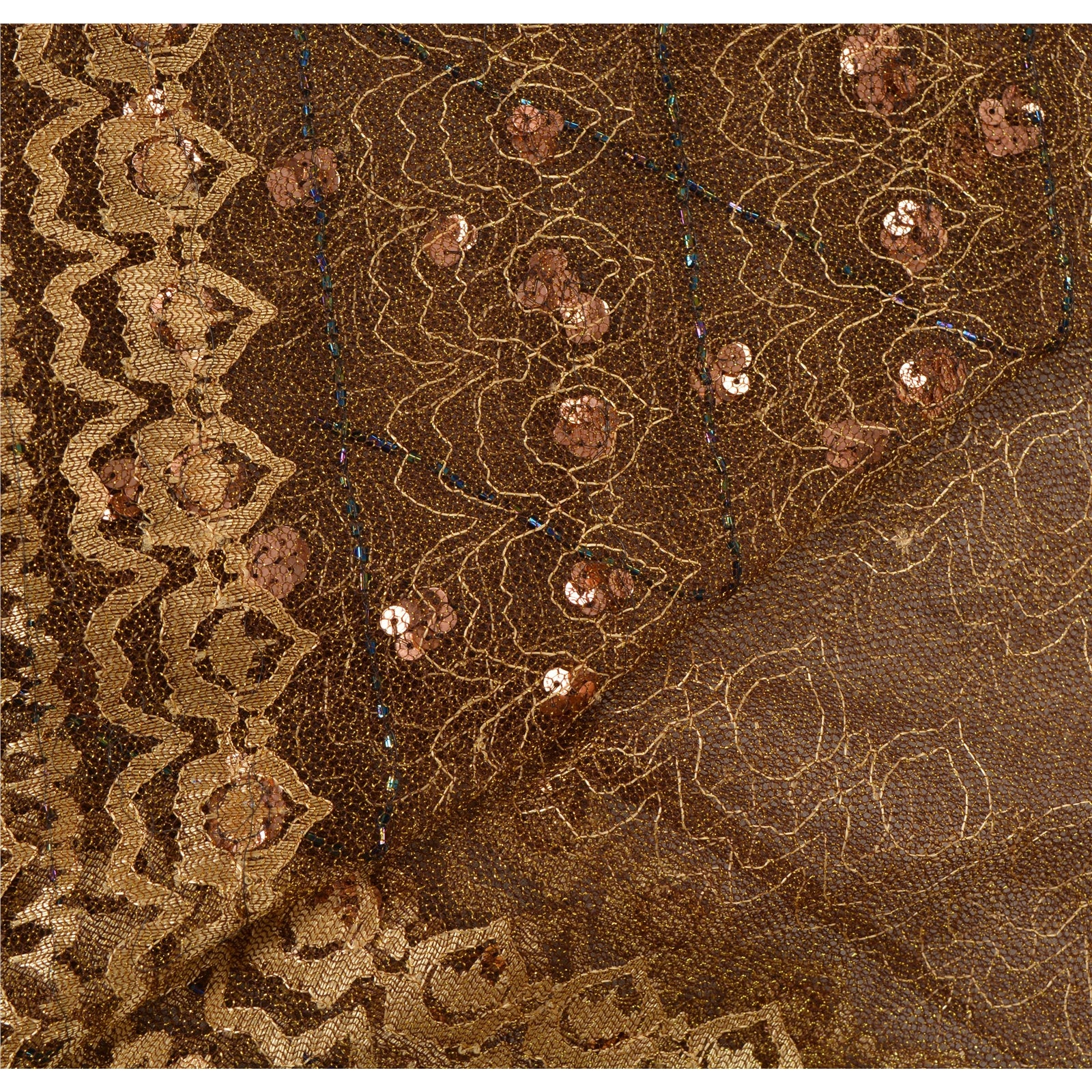 Sanskriti Vintage Sarees Net Mesh Hand Beaded Woven Brown Fabric Craft 5 YD Sari