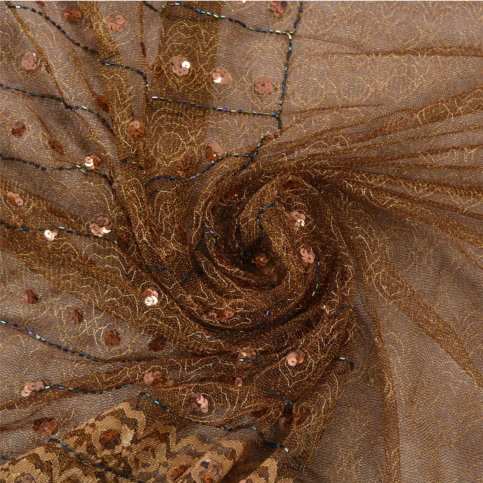 • Beautiful brown colored hand embroidered woven net mesh sari • Pallu & Border features floral design embellished with copper sequins and blue multi color reflecting glass beads work. • There are floral motifs with similar work in center part of sari. What is special about this saree? Sparkling sequins & glass beads work with floral design on brown color base fabric is really enhancing the beauty of the saree. This unique vintage saree can be used for various crafting ideas even if you don't want to use it as a sari. Design a dress, use it as a throw, as window dressing, upholstery, sarongs, table linen and much more. Let your creative juices flow and use this decorated fabric in multiple fashion.