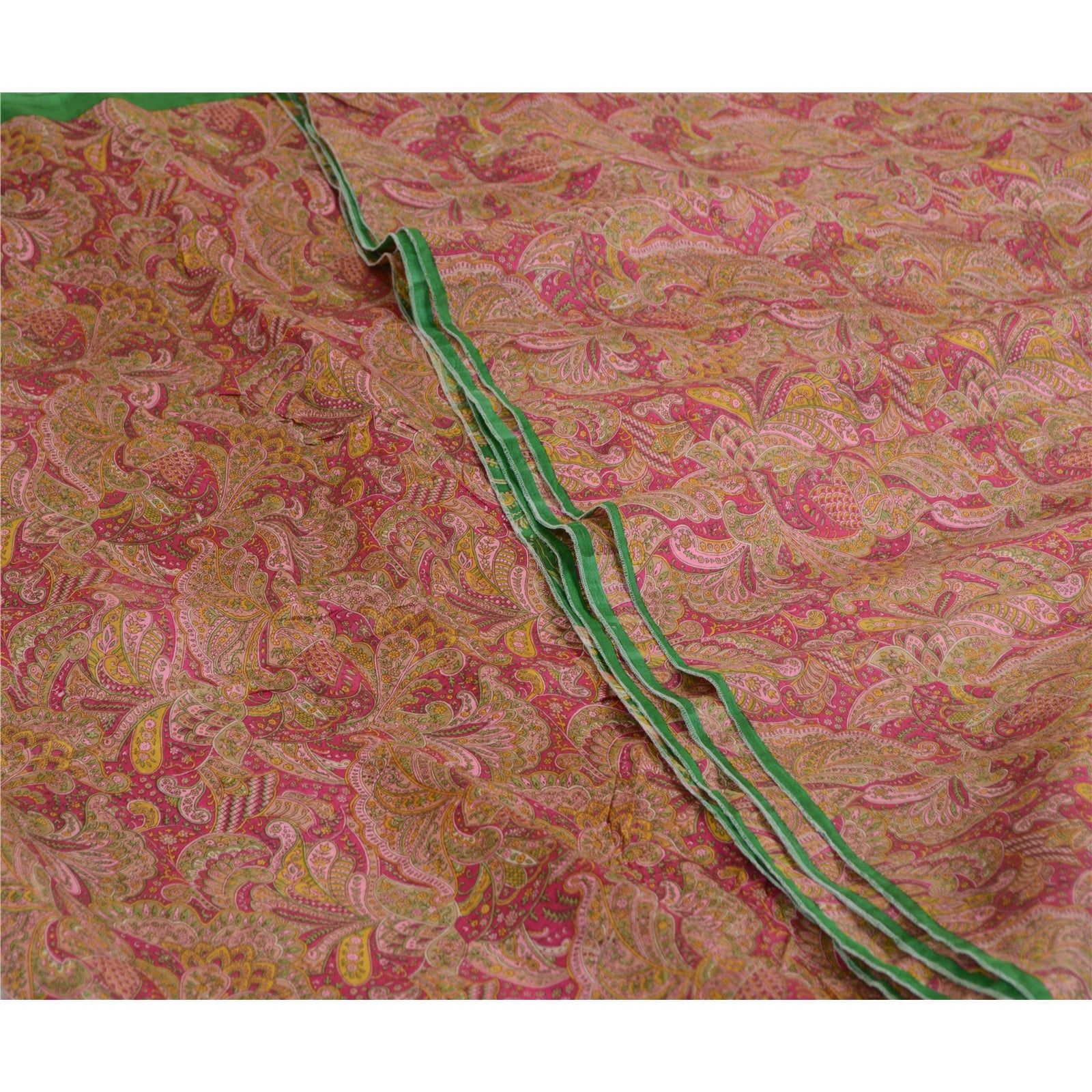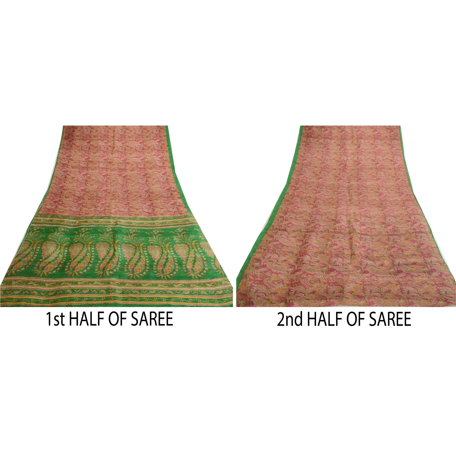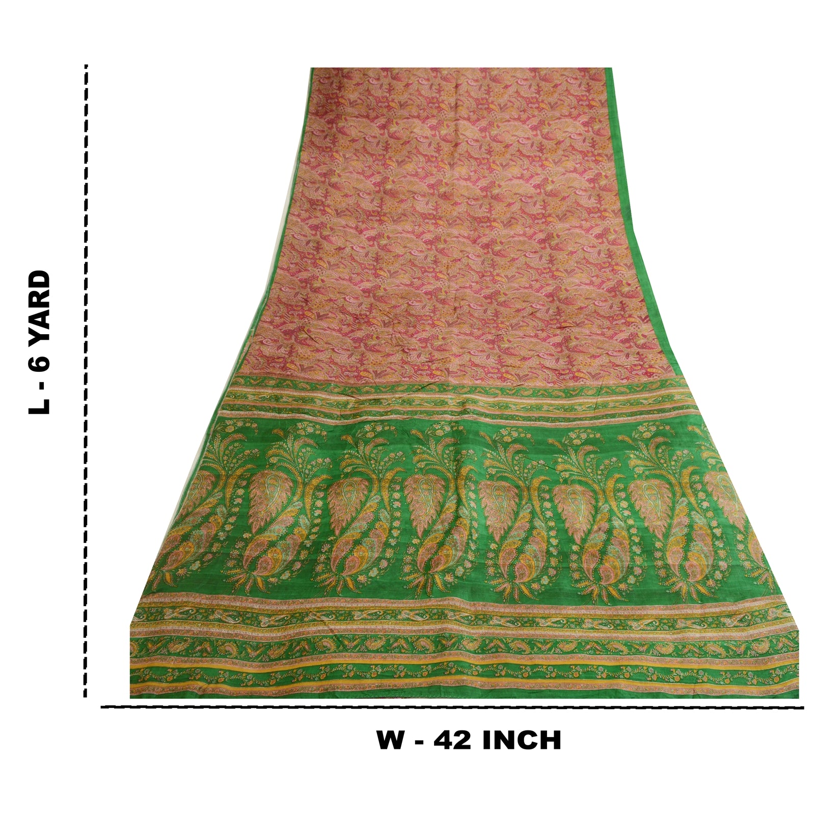 Sanskriti Vintage Sarees Pink & Green Printed Pure Silk Sari Blomsterhåndværk Bæredygtigt Stoff