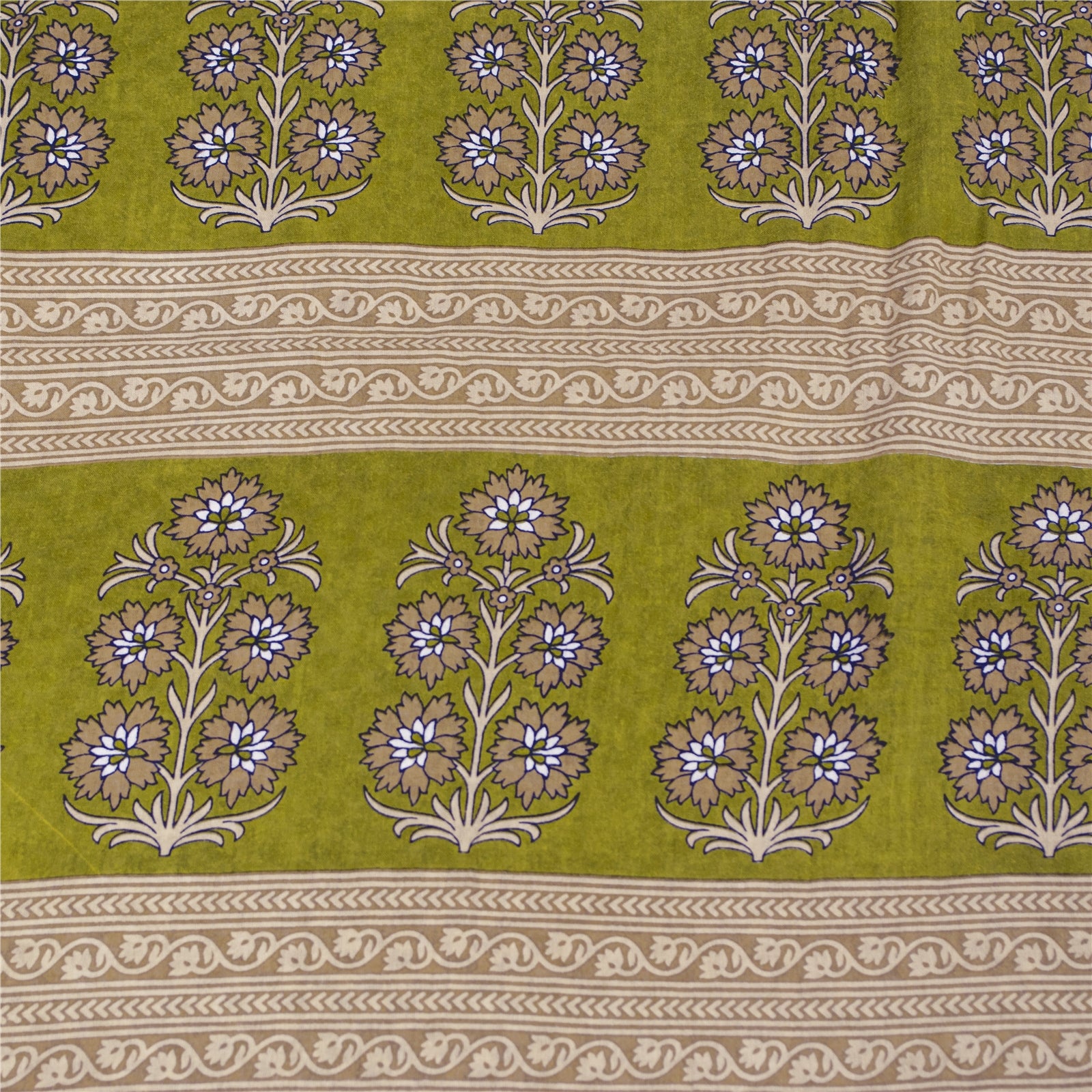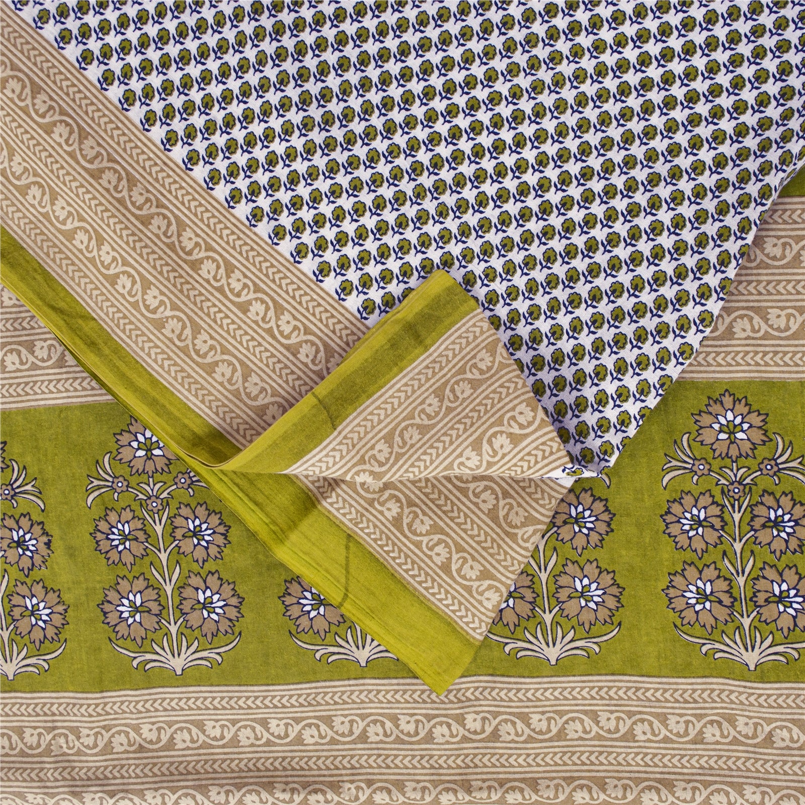 Sanskriti Vintage Sarees White & Green Pure Cotton Print Sari 5+yd Craft Fabric