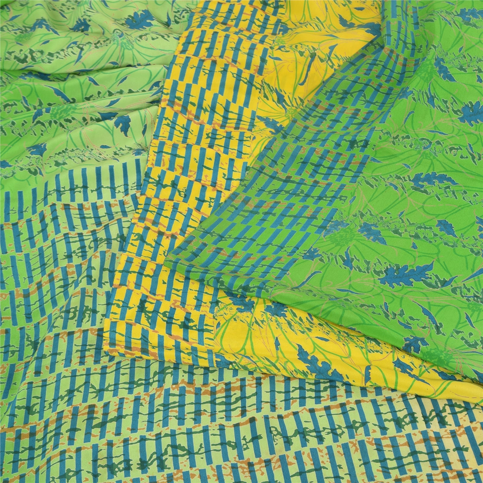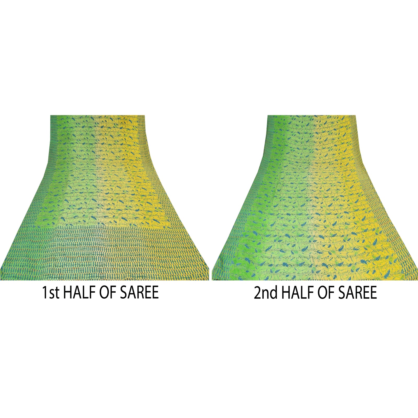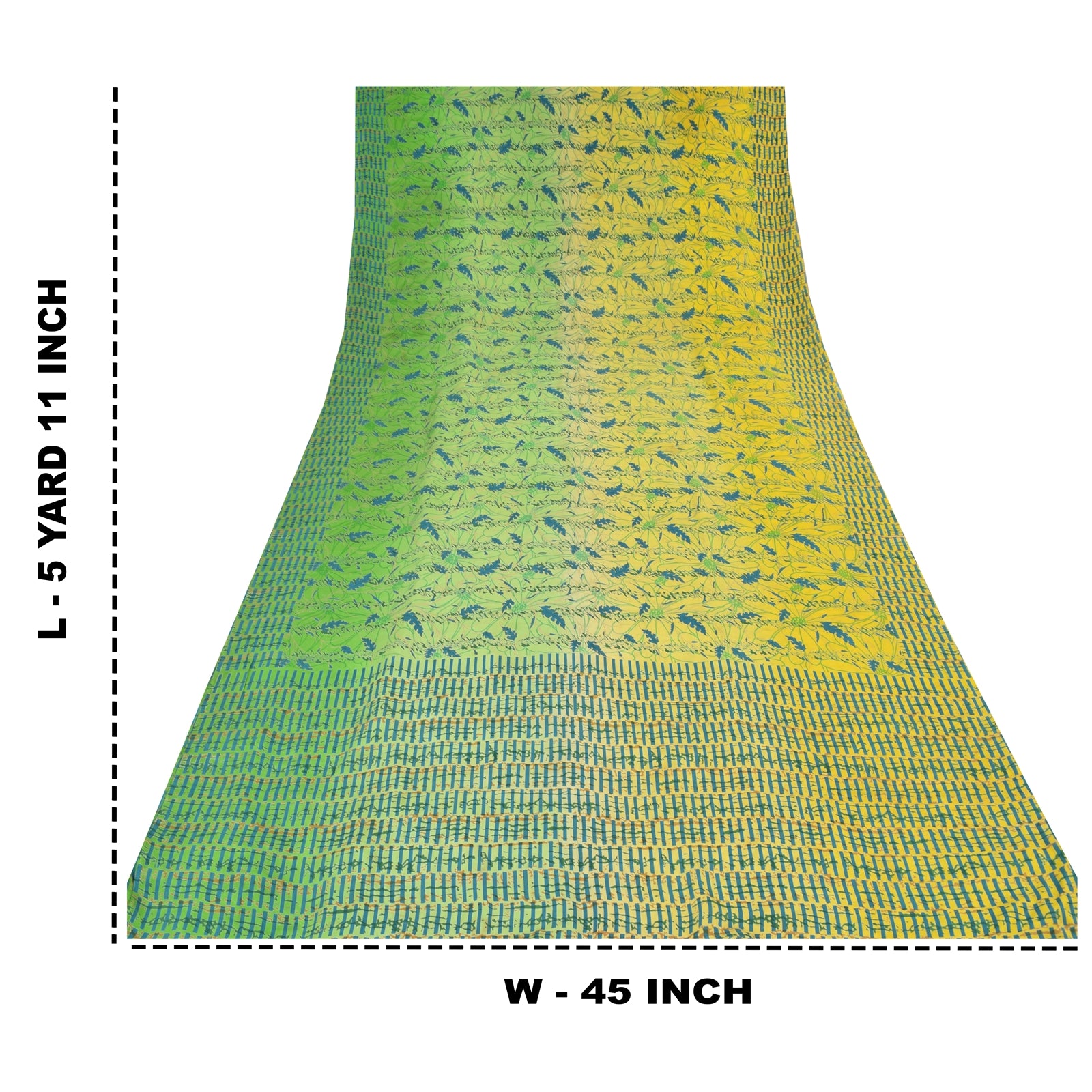 Sanskriti Vintage Sarees Gul/Grøn Ren Crepe Silke Trykt Sari Håndværk Bæredygtigt Stoff