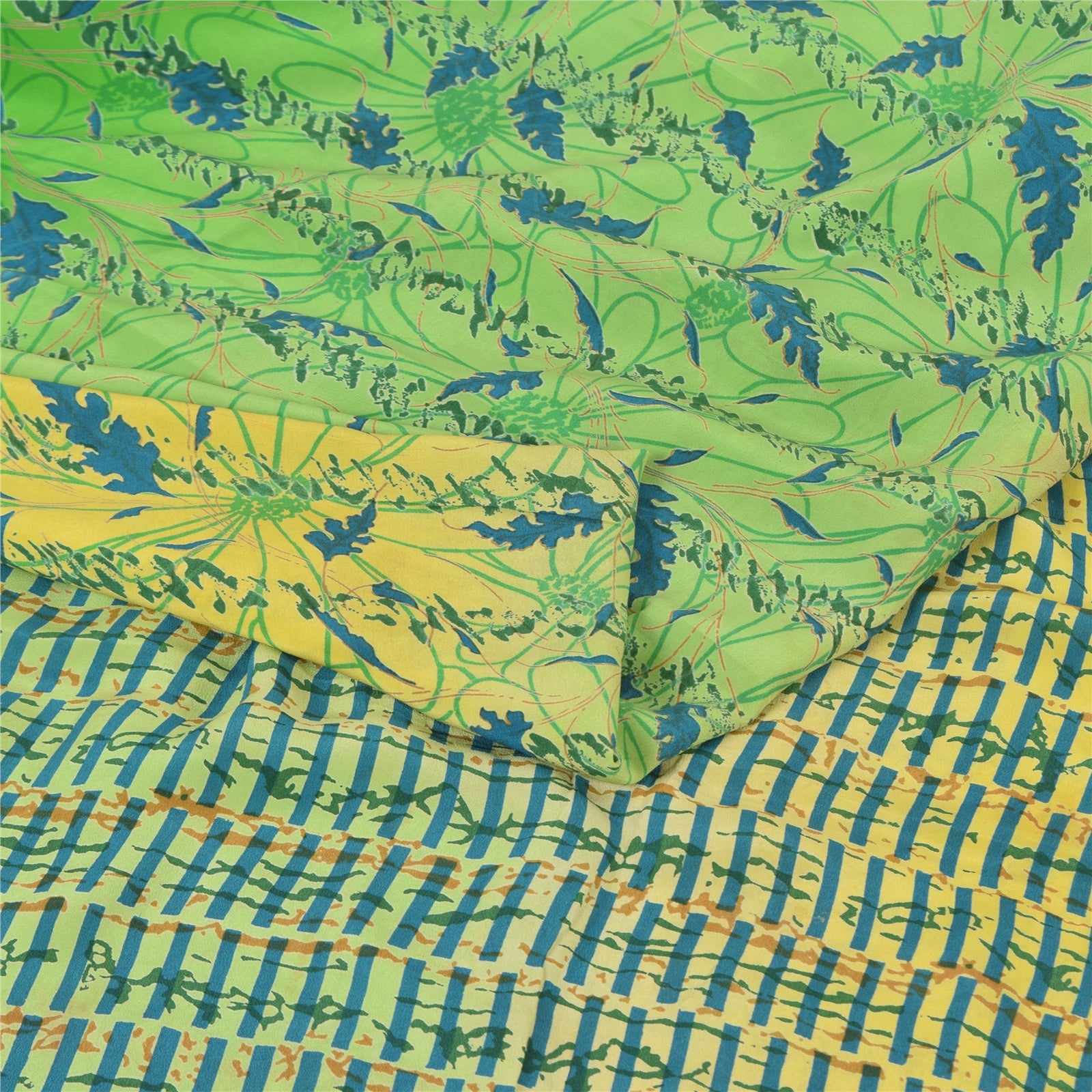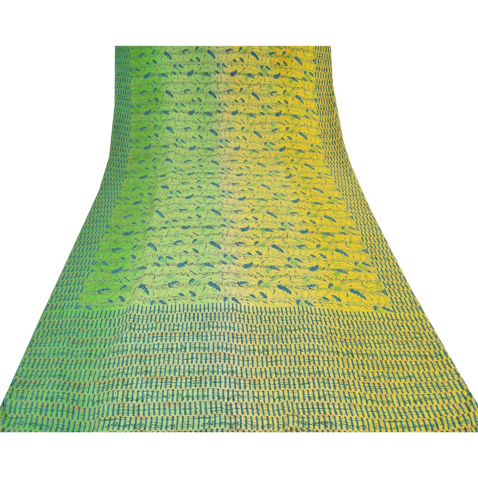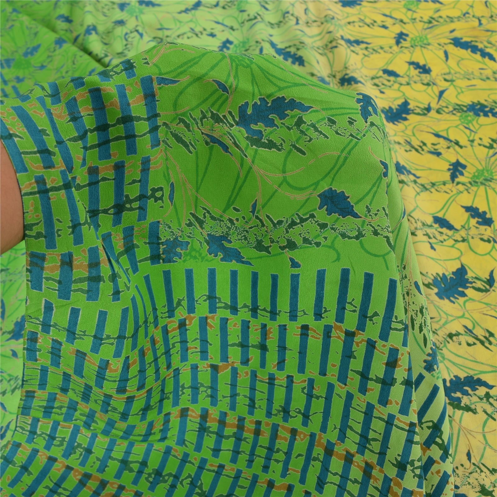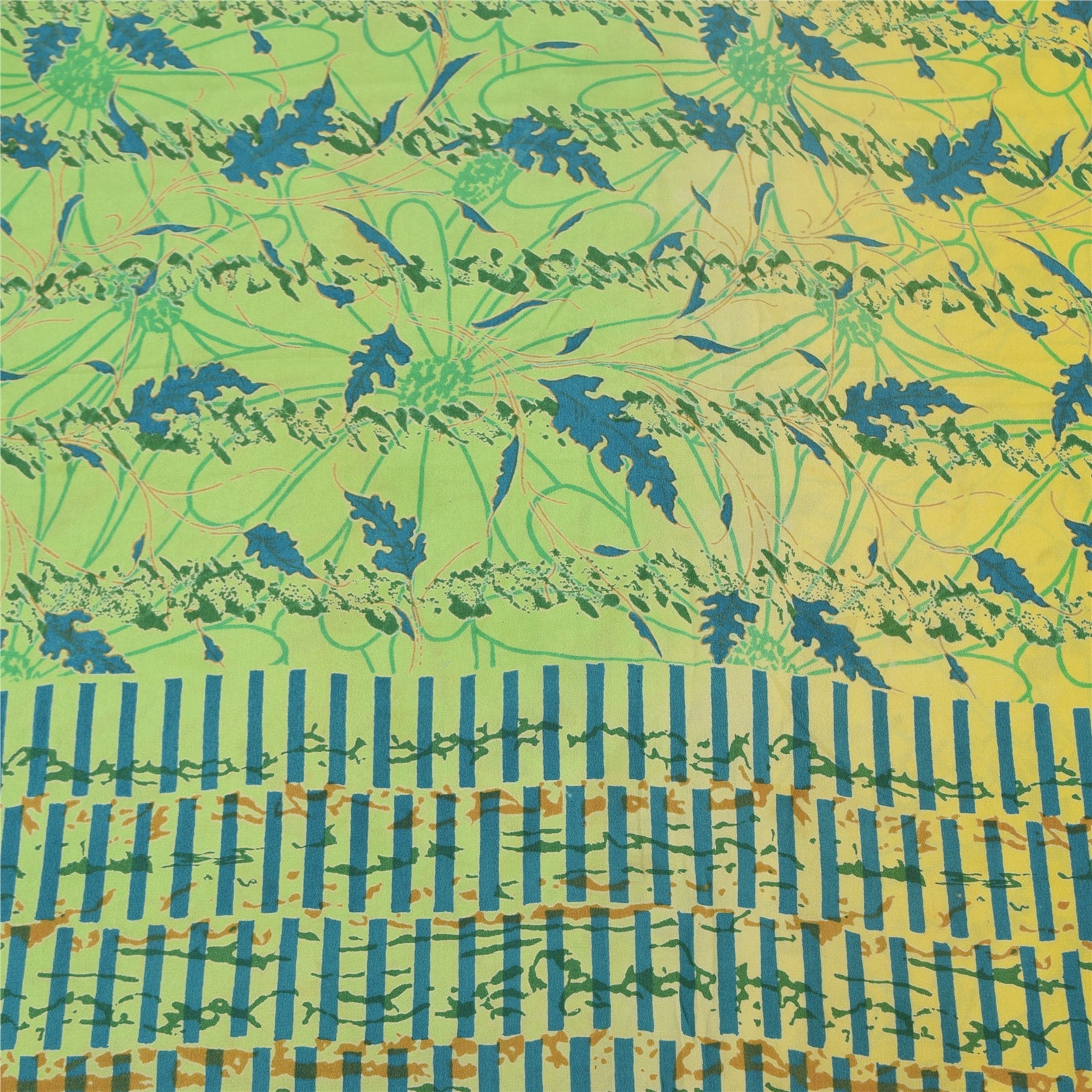 Sanskriti Vintage Sarees Gul/Grøn Ren Crepe Silke Trykt Sari Håndværk Bæredygtigt Stoff
