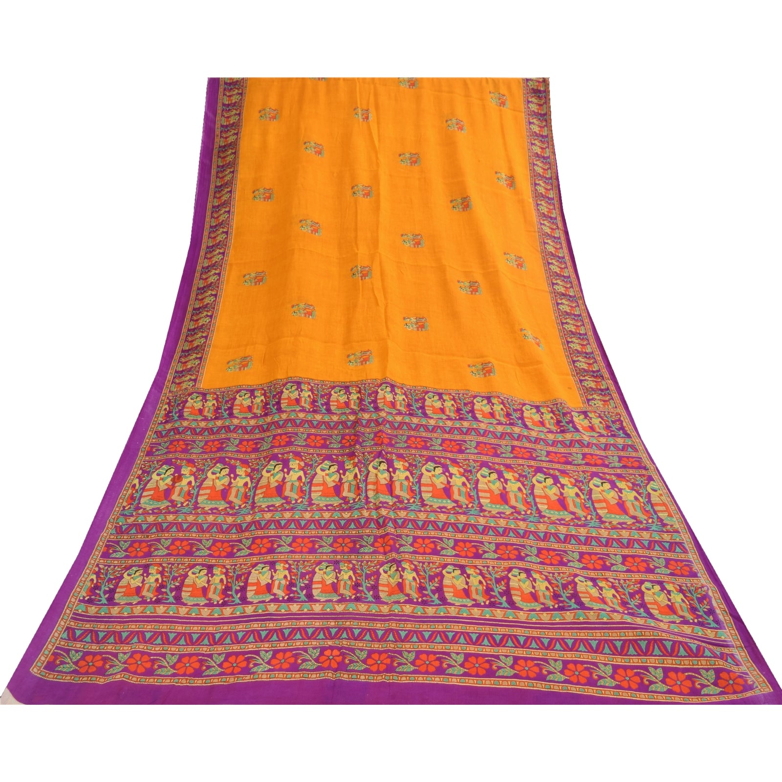Sanskriti Vintage Sarier Gul Ren Bomuld Mennesketrykt Sari 5+ yard Håndværksstof