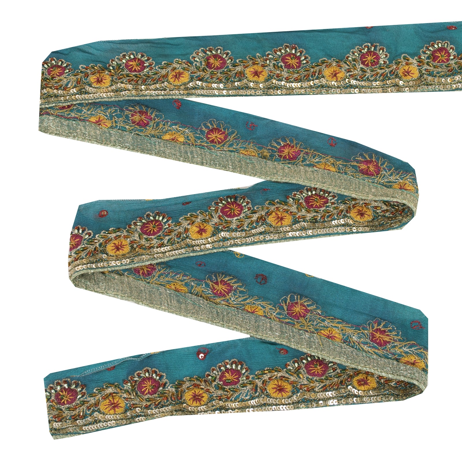 Sanskriti Vintage Sari Border Hand Bead 1 YD Craft Trim Blue Pure Silk 2.2W Lace