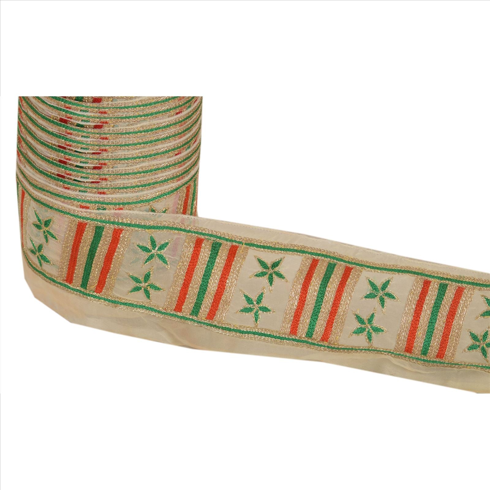 Fantastisk håndbroderet georgette-sari-kant i cremefarve med fremhævning af kundan-sten. Kanten har smukke blomstermønstre, der er omhyggeligt håndbroderet med guld zari-arbejde og orange/grønt trådarbejde. WOW!! et fantastisk, unikt og alsidigt bed. 1 Antal = 1 Yard