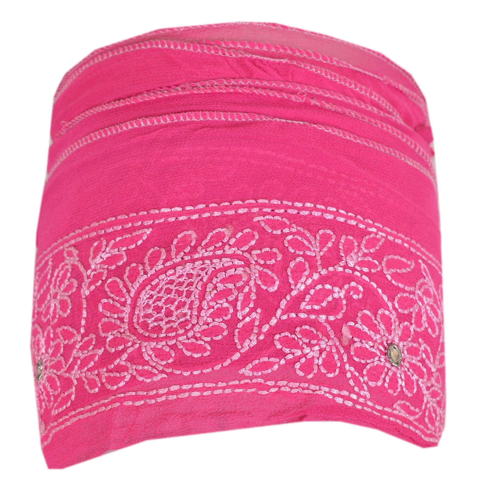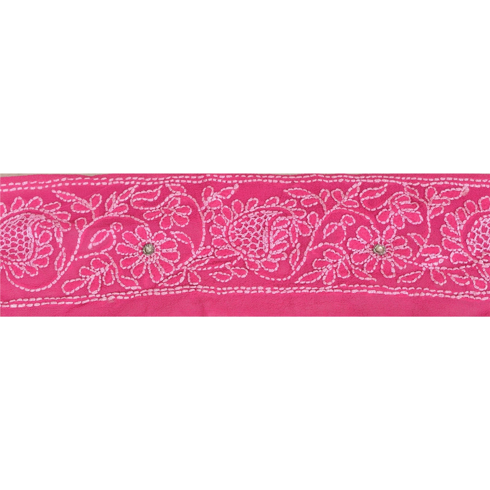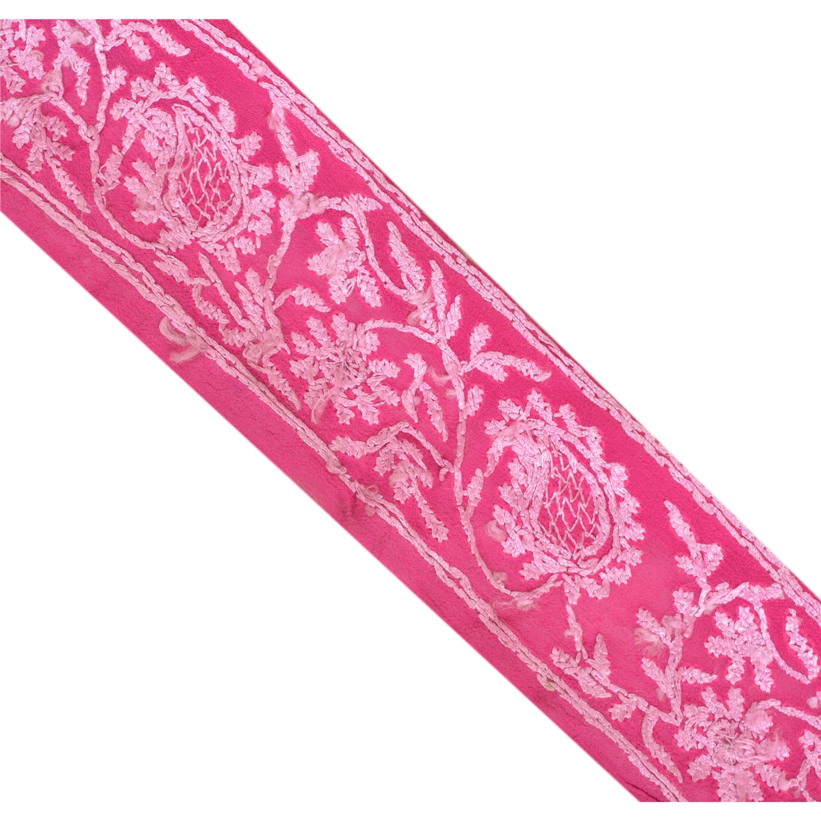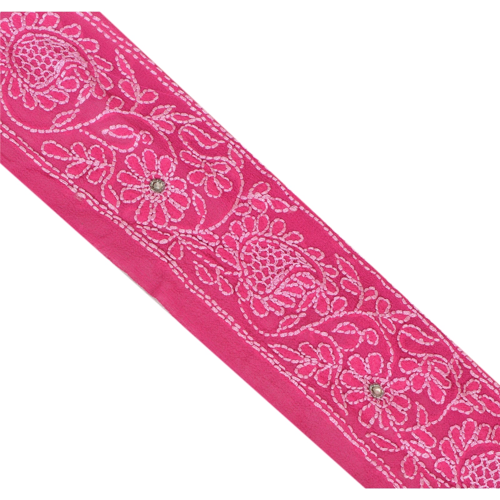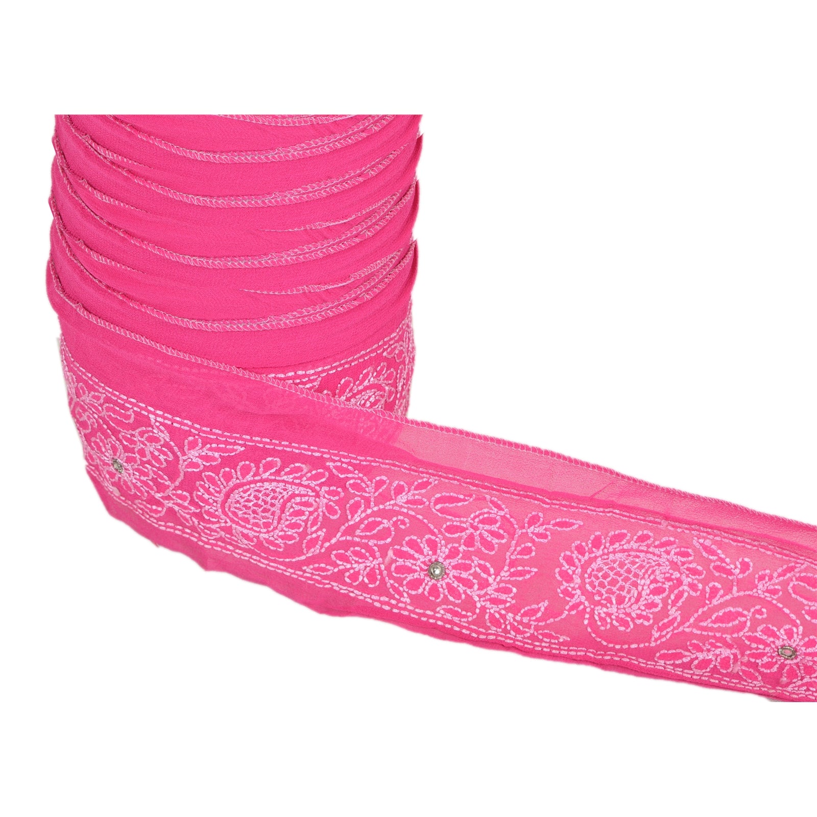 Amazing georgette hand embroidered chikankari sari border in pink color highlighting zardozi work. Border has beautiful floral & paisley patterns painstakingly hand embroidered with pink thread work. Further you can see fine detailing with golden zardozi work, white rhinestone work. WOW!! an awesome one of a kind versatile border. 1 Quantity = 1 Yard B-12021