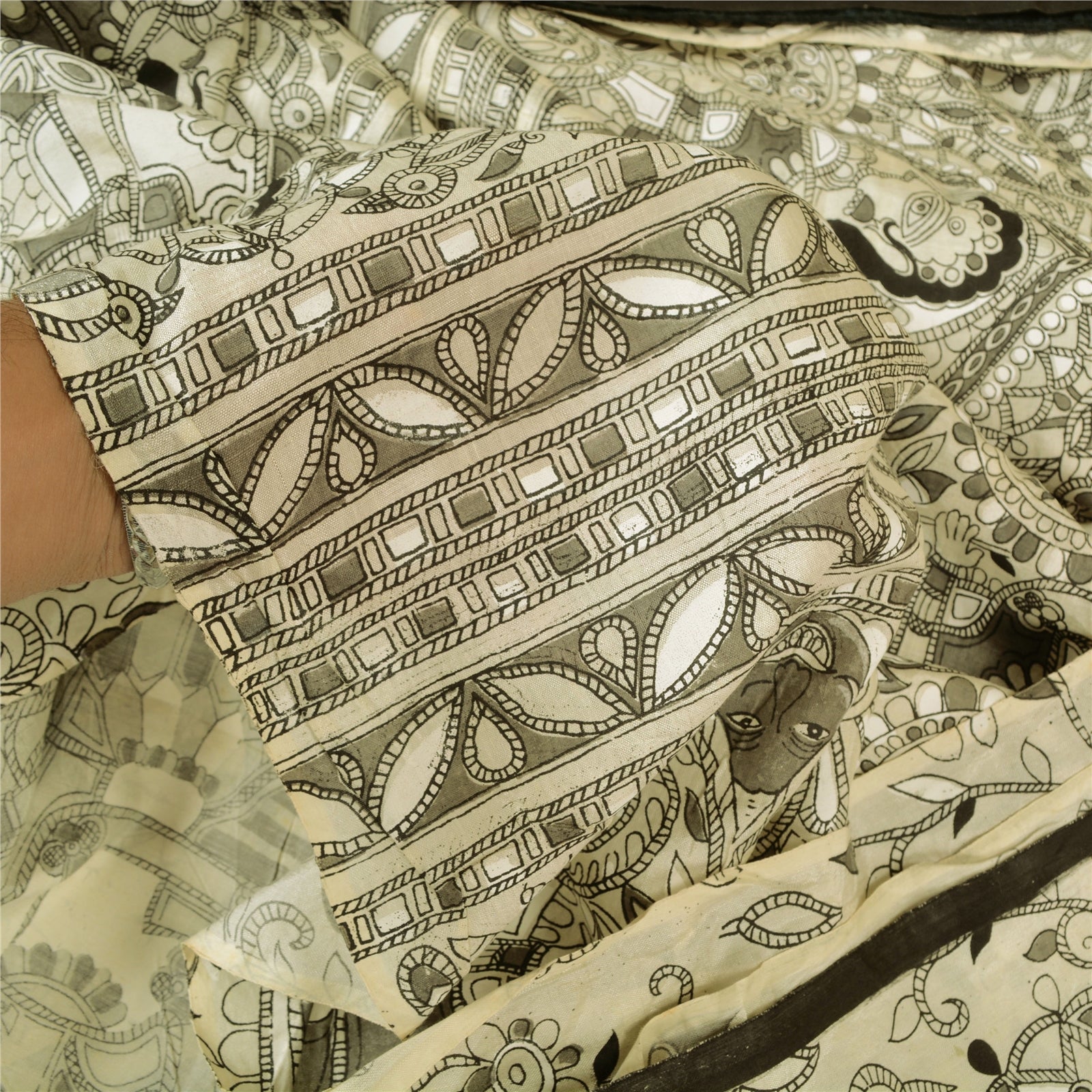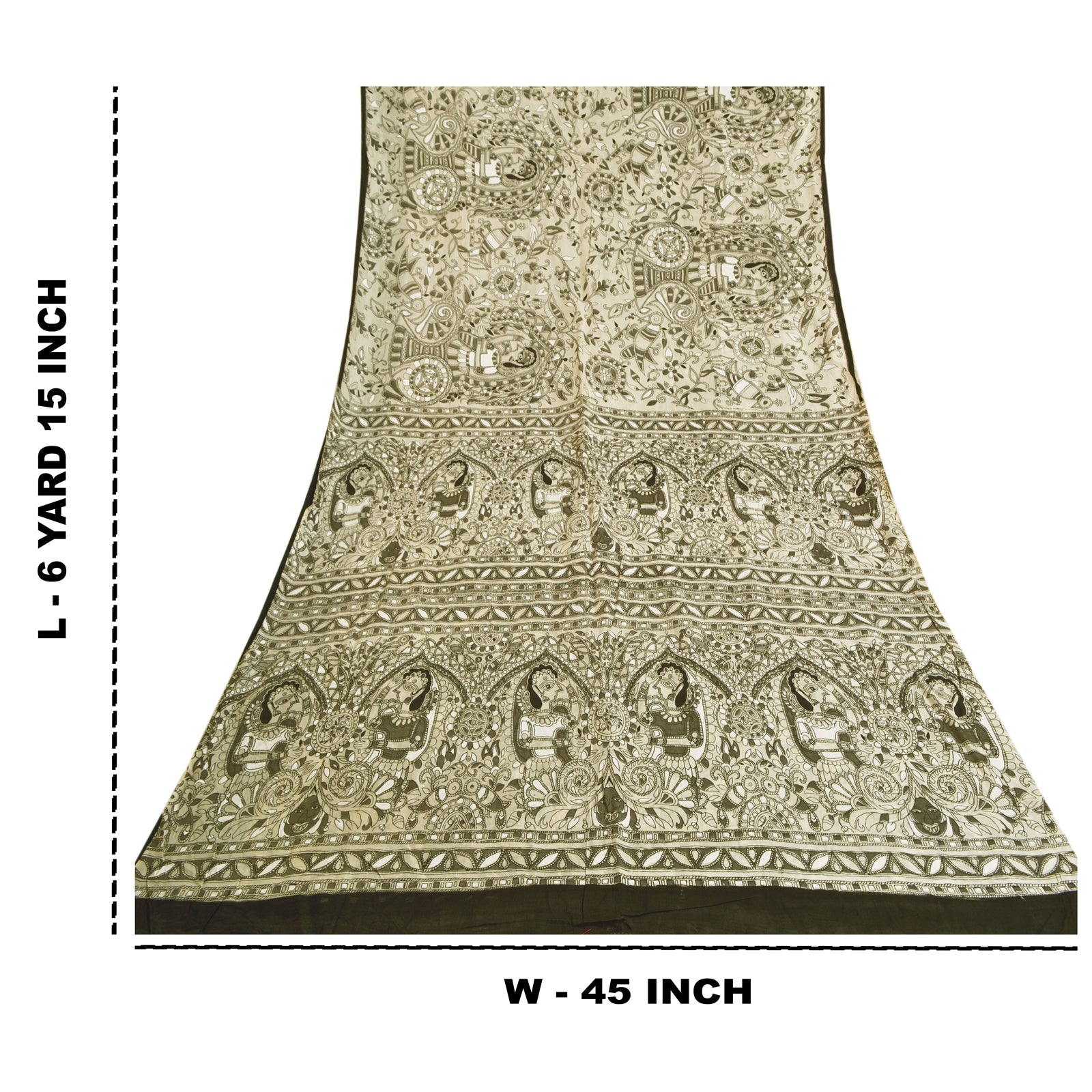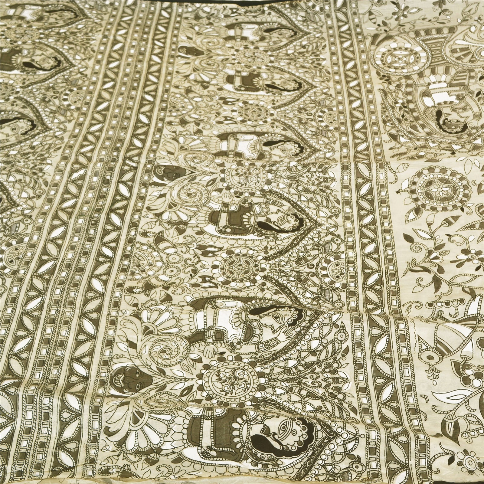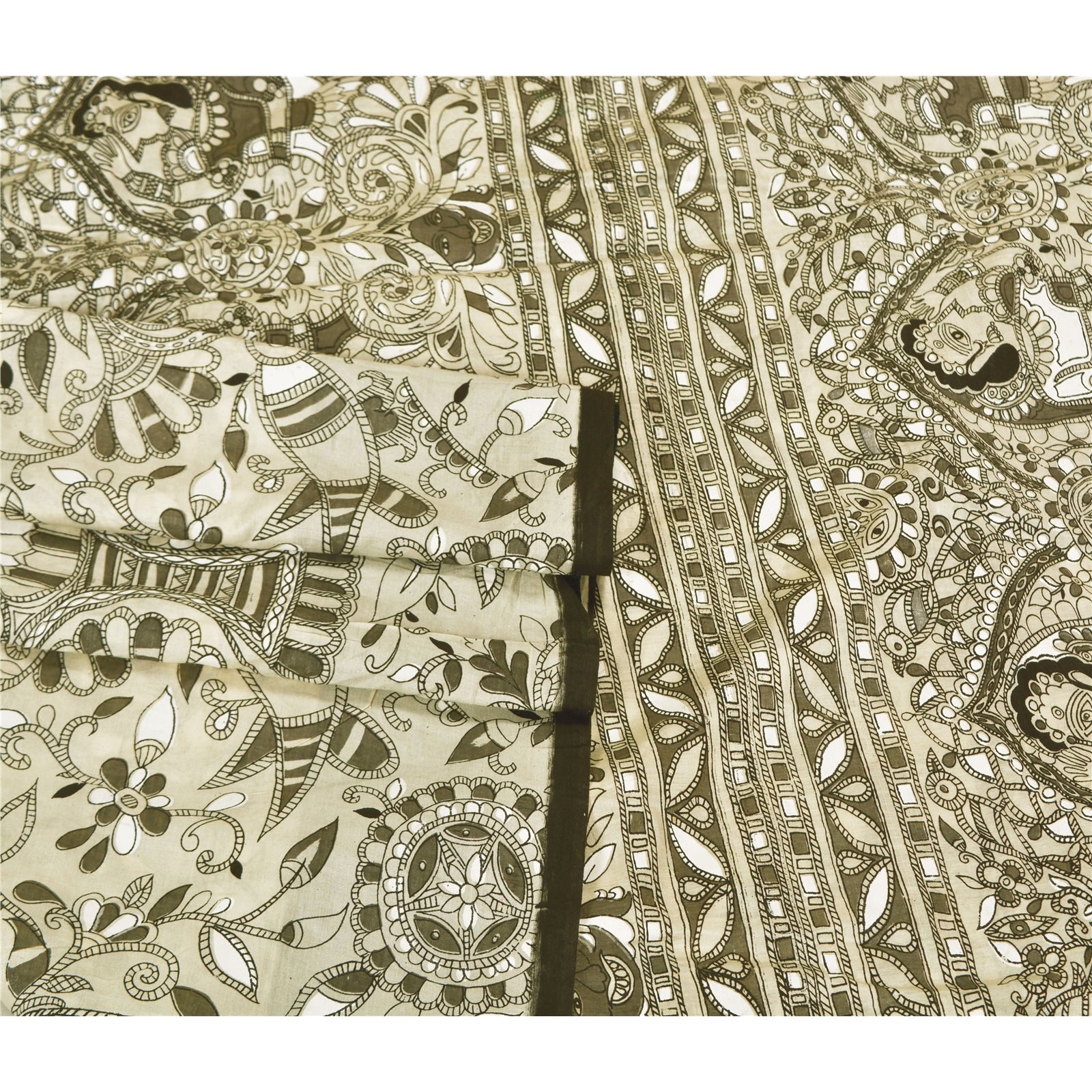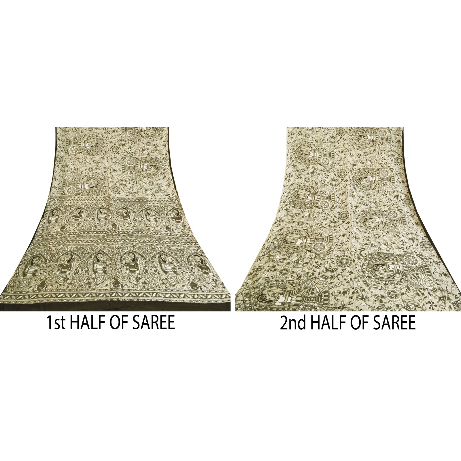 Sanskriti Vintage Hvide Tunge Sarier Ren Bomuld Madhubani Trykt Sari Bæredygtigt Stoff