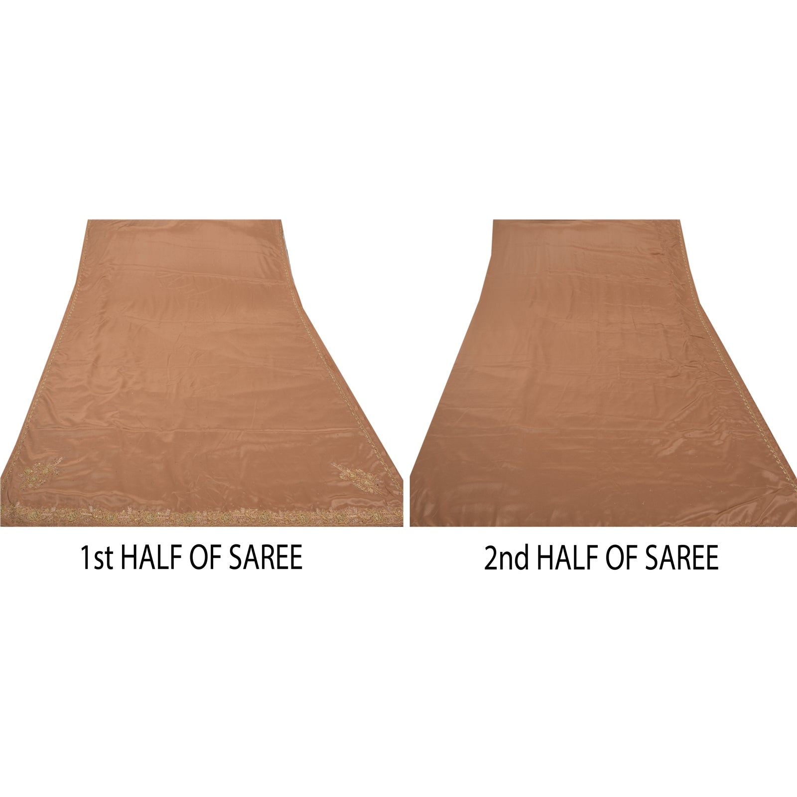 Beautiful Brown colored hand embroidered art silk sari Pallu & border features floral design embellished with maroon thread work, golden zari/zardozi/dabka work, golden sequins, yellow glass beads work. Also you can see golden fabric patch work gives a unique look to this saree. There are floral motifs with similar work in center part of sari. Alluring golden patch work with floral design on Brown color base fabric is really enhancing the beauty of the saree. This unique vintage saree can be used for various crafting ideas even if you don't want to use it as a sari. Design a dress, use it as a throw, as window dressing, upholstery, sarongs, table linen and much more. Let your creative juices flow and use this decorated fabric in multiple fashion.