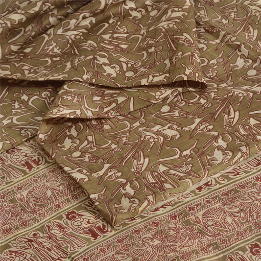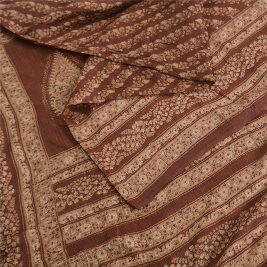 Sanskriti Vintage Brown Saree 100% Pure Silk Batik Work Craft Sustainable Fabric 5 Yd Sari