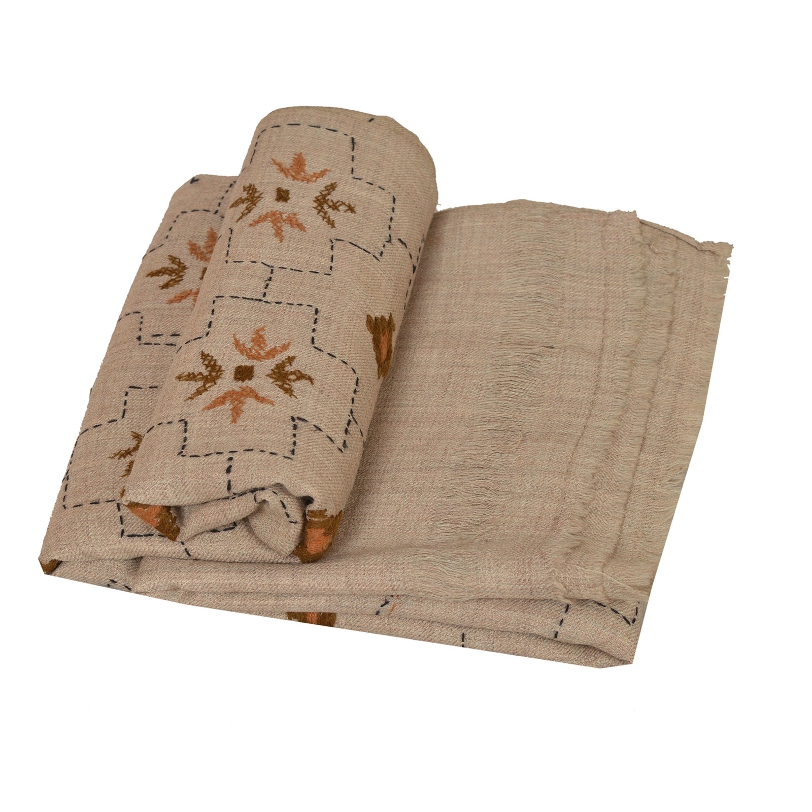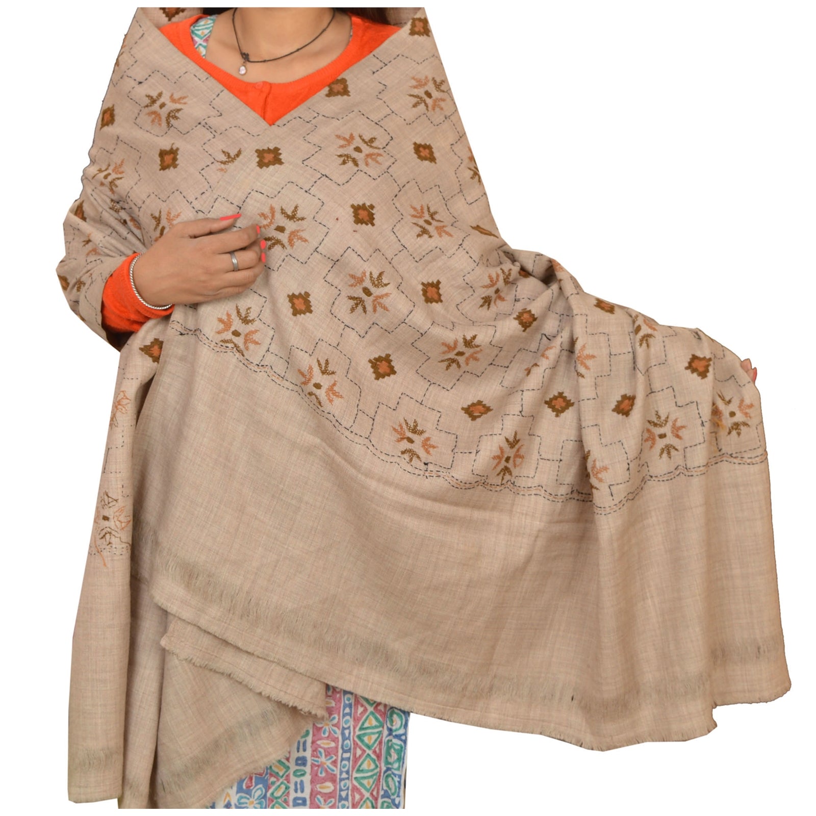 Fabulous hand embroidered woolen brown colored shawl/scarf/stole. Cozy and gorgeously soft to touch, this shawl has a beautiful hand embroidered floral design all over with green, brown & black thread. Wear this versatile piece as a scarf, stole or wrap.