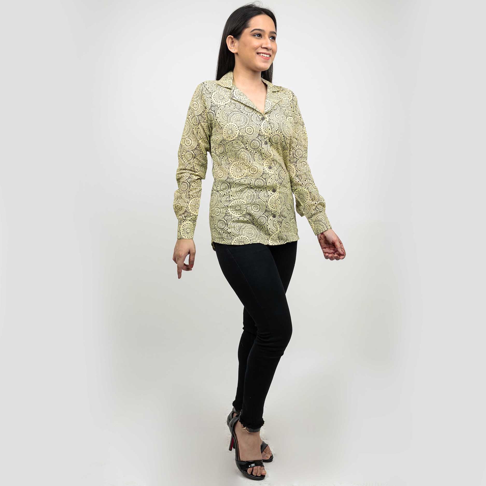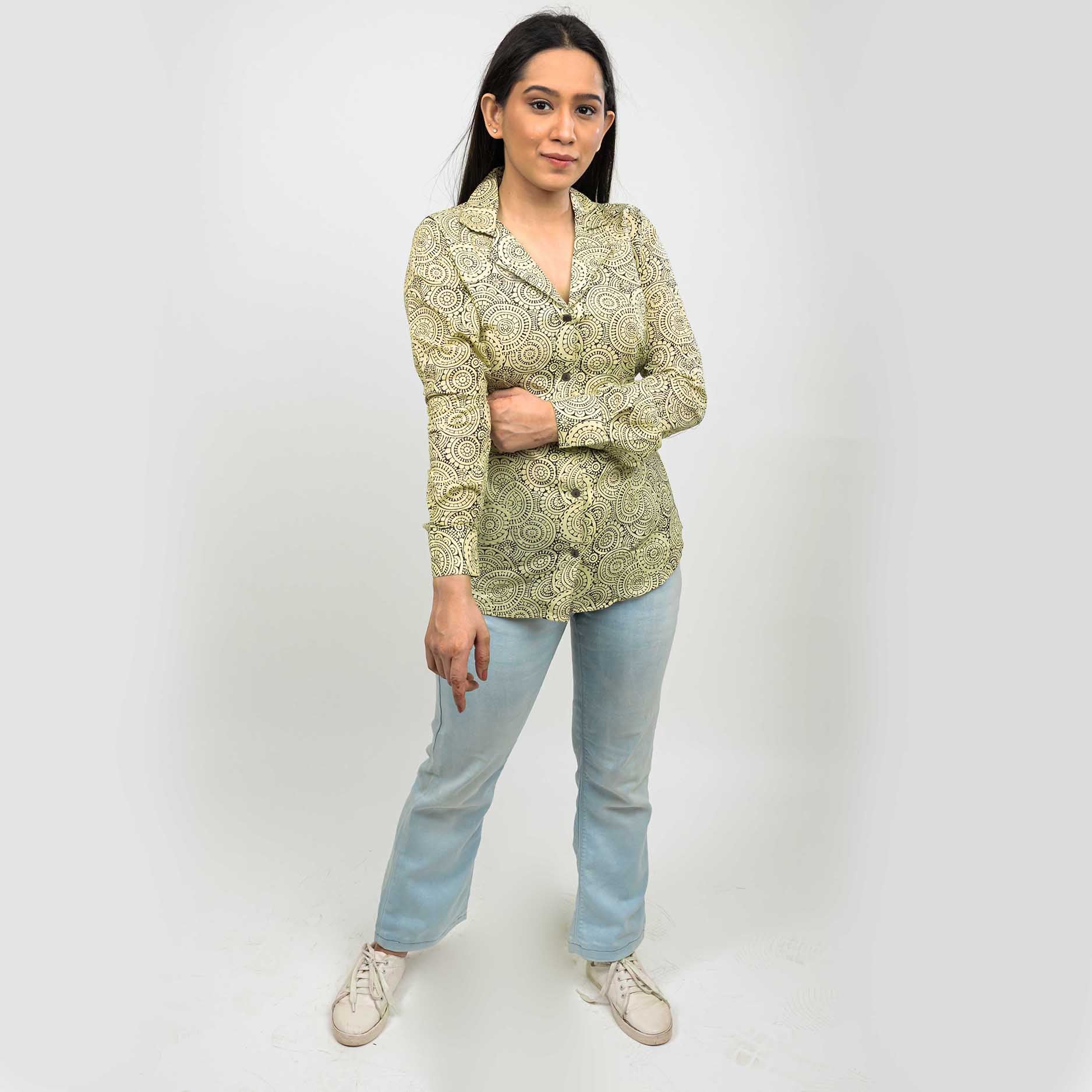 Sanskriti offers this beautiful casual hand block printed shirt in cream color. This shirt is in beautiful mandala print and has blazer collar neckline. It has front opening with wooden buttons. This shirt is made from pure cotton hand block printed Sustainable Fabric. The Sustainable Fabric is made from natural, organic food dyes. You can pair it with trousers, skirts, denims along with any classic accessory to enhance your outfit. Wash Care: Hand wash in cold water, Wash with similar color, Do not bleach, Do not tumble dry, Steam Iron