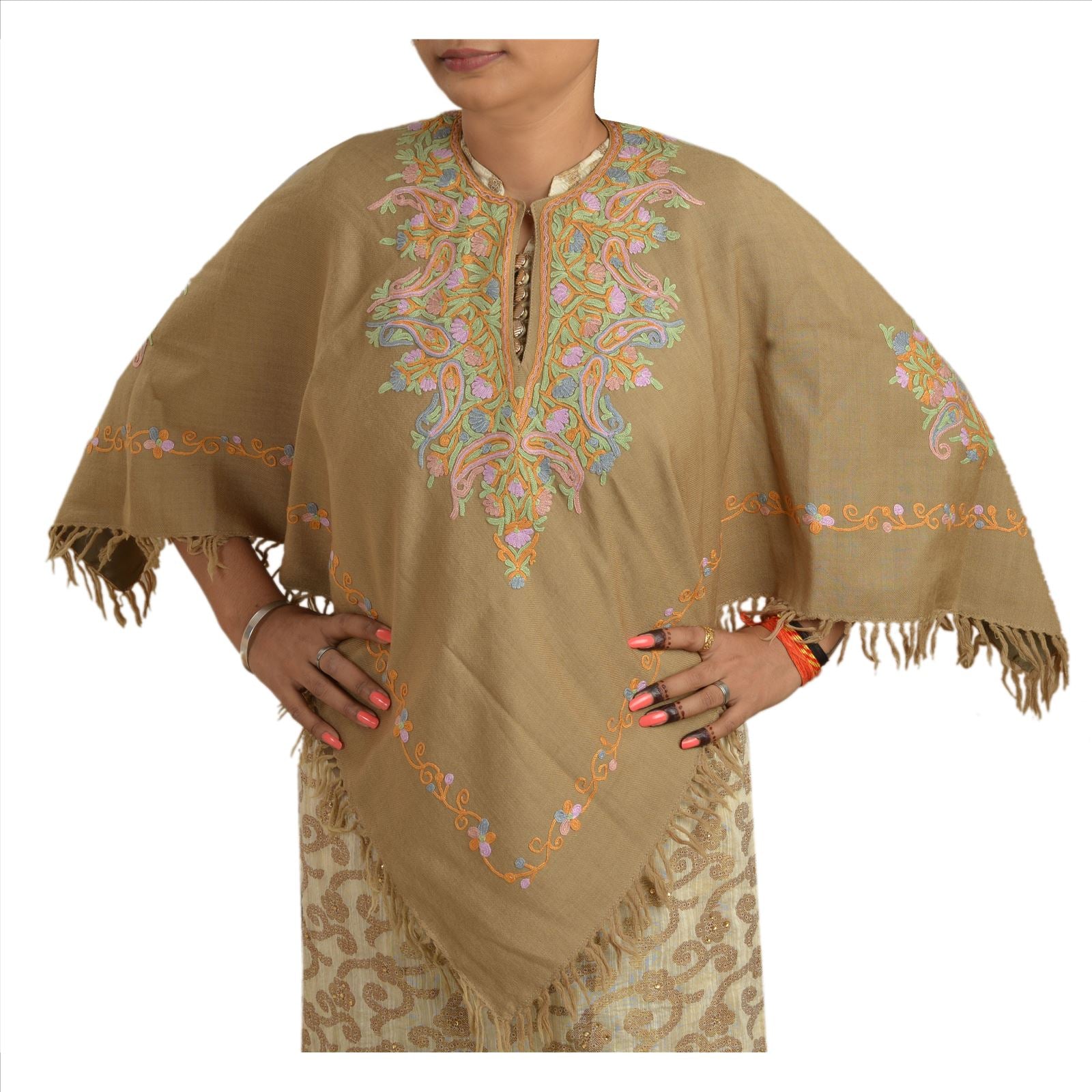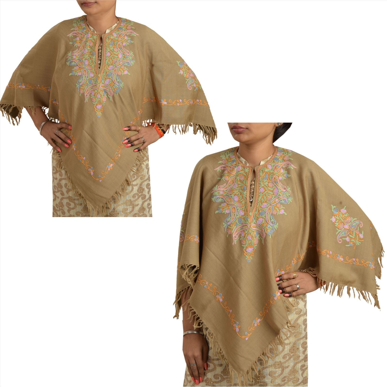 Stylish blue colored hand embroidered poncho top in pure wool. Amazing paisley design ari work(crewel work) in pink, green and grey thread. green trims on edges. Wear over contrast color tops. Match with leggings jeans or pant and palazzos for comfort & style. Trendy and feminine, this poncho top has an effortless style and is ideal for daily wear, casual wear, fairs, movies, lounging and much more.