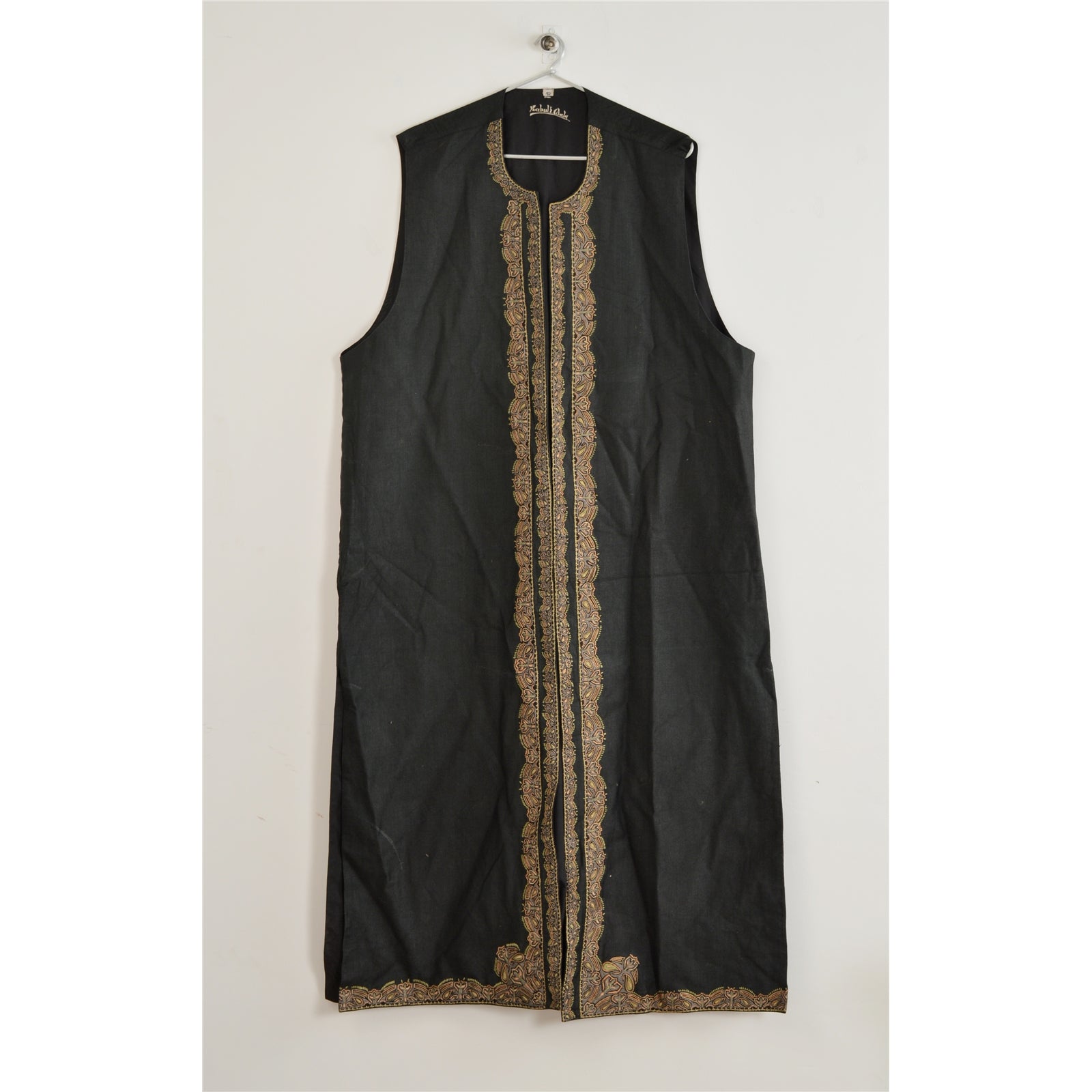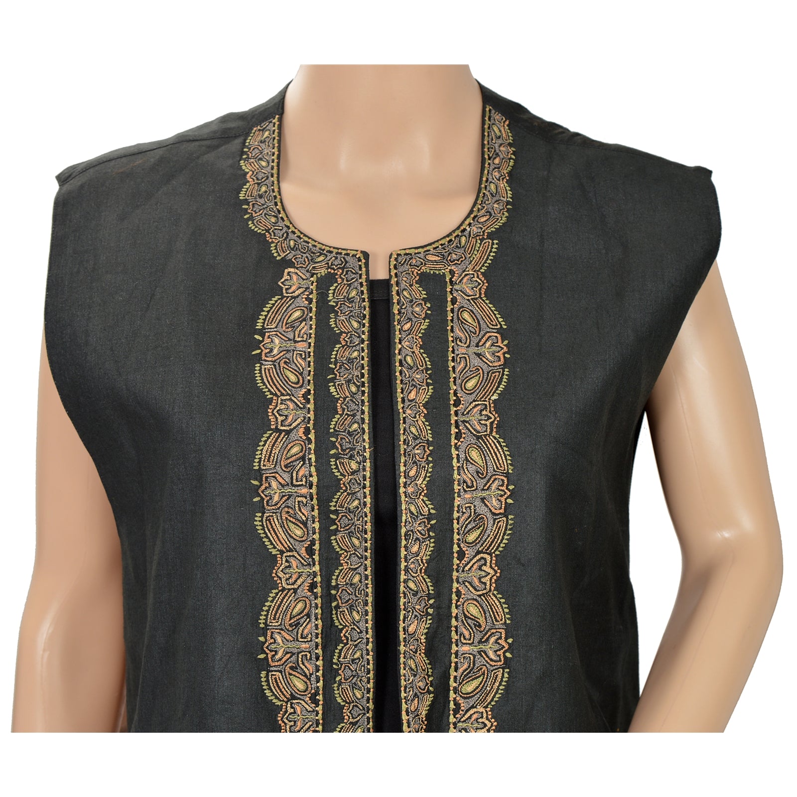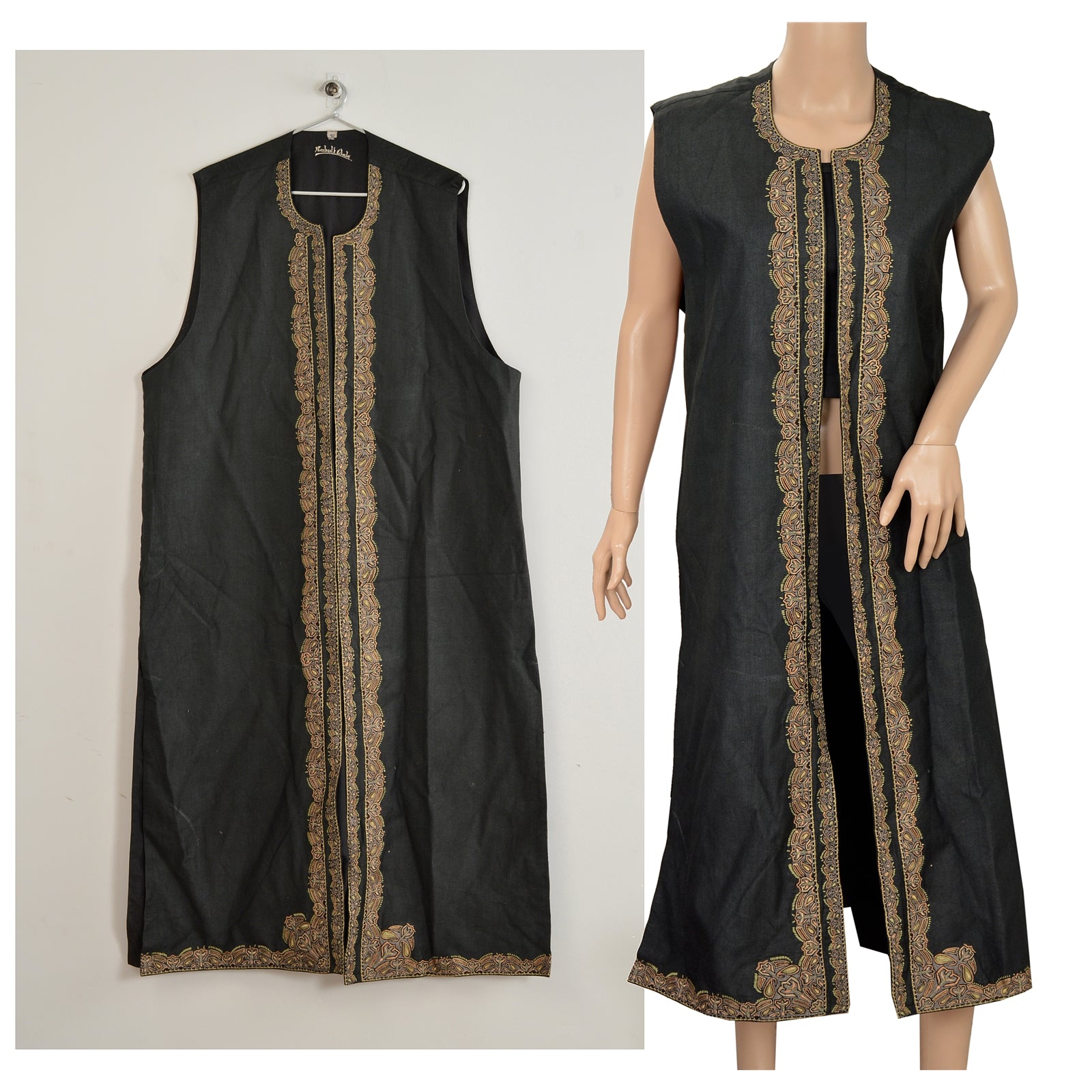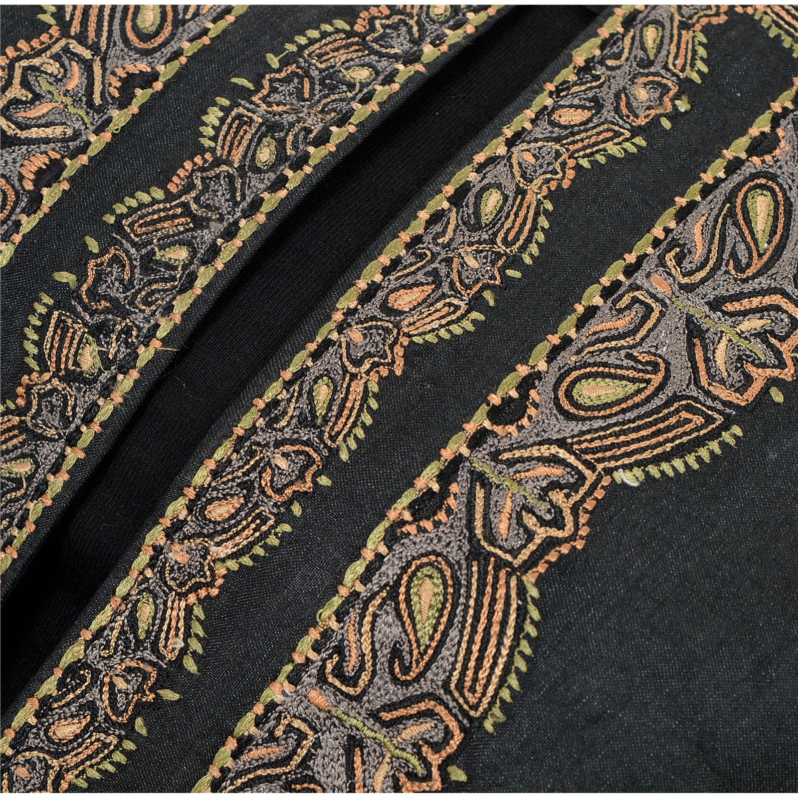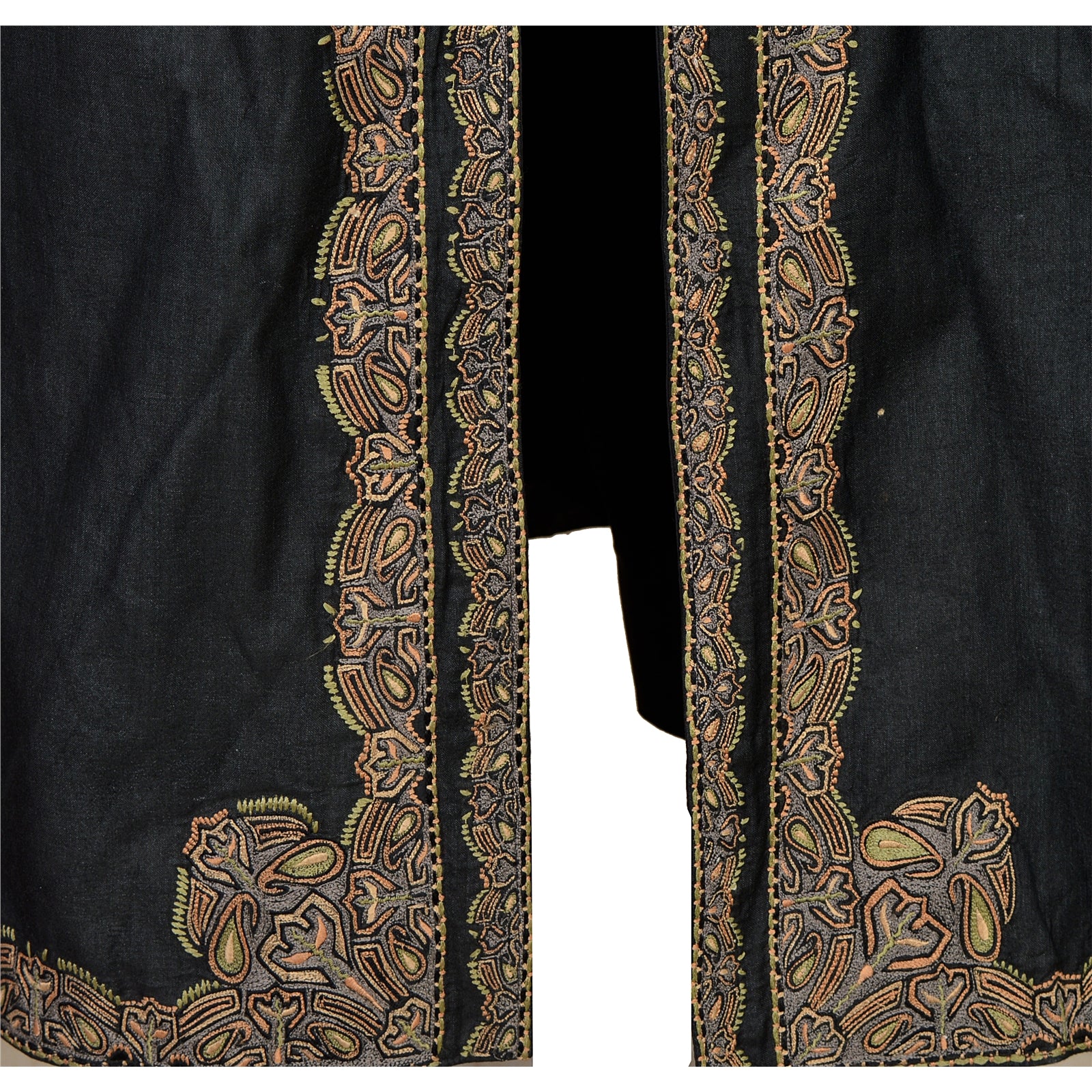 Black blend cotton Embroidered open Style Jacket Long Top. Floral & paisley design in a multi color thread work. Top with remarkable vibrant embroidery work brightens the look of wearer and adds up charm to their outfits. Awesome work. This designer top will make you look smart & elegant. Team it with pants for comfort & style.