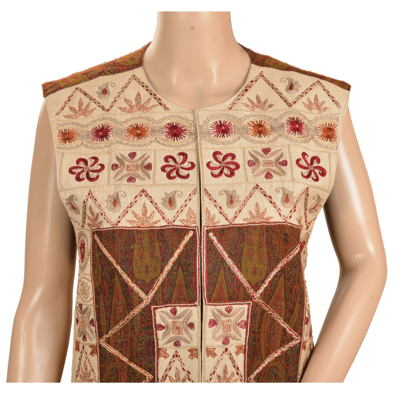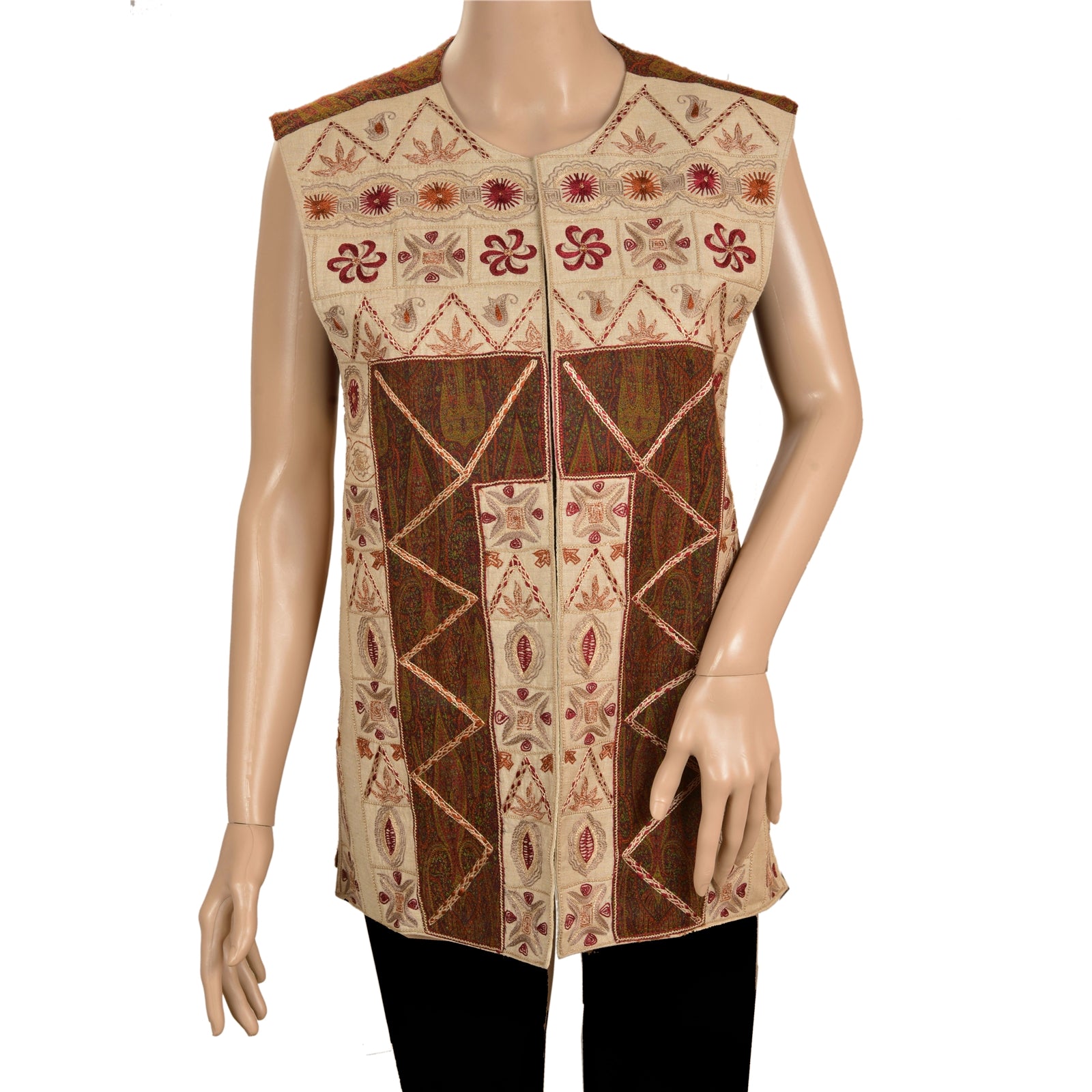Cream color cotton woven embroidered short jacket style top. Floral design in a combination of maroon and cream. Top has woven woolen patch work in front and back side of the top in woven woolen Sustainable Fabric with floral and paisley design. Top is without sleeves with a round neckline. Top with remarkable embroidery brightens the look of wearer. This designer top with a front tie will make you look smart & elegant. Team it with leggings for comfort & style.