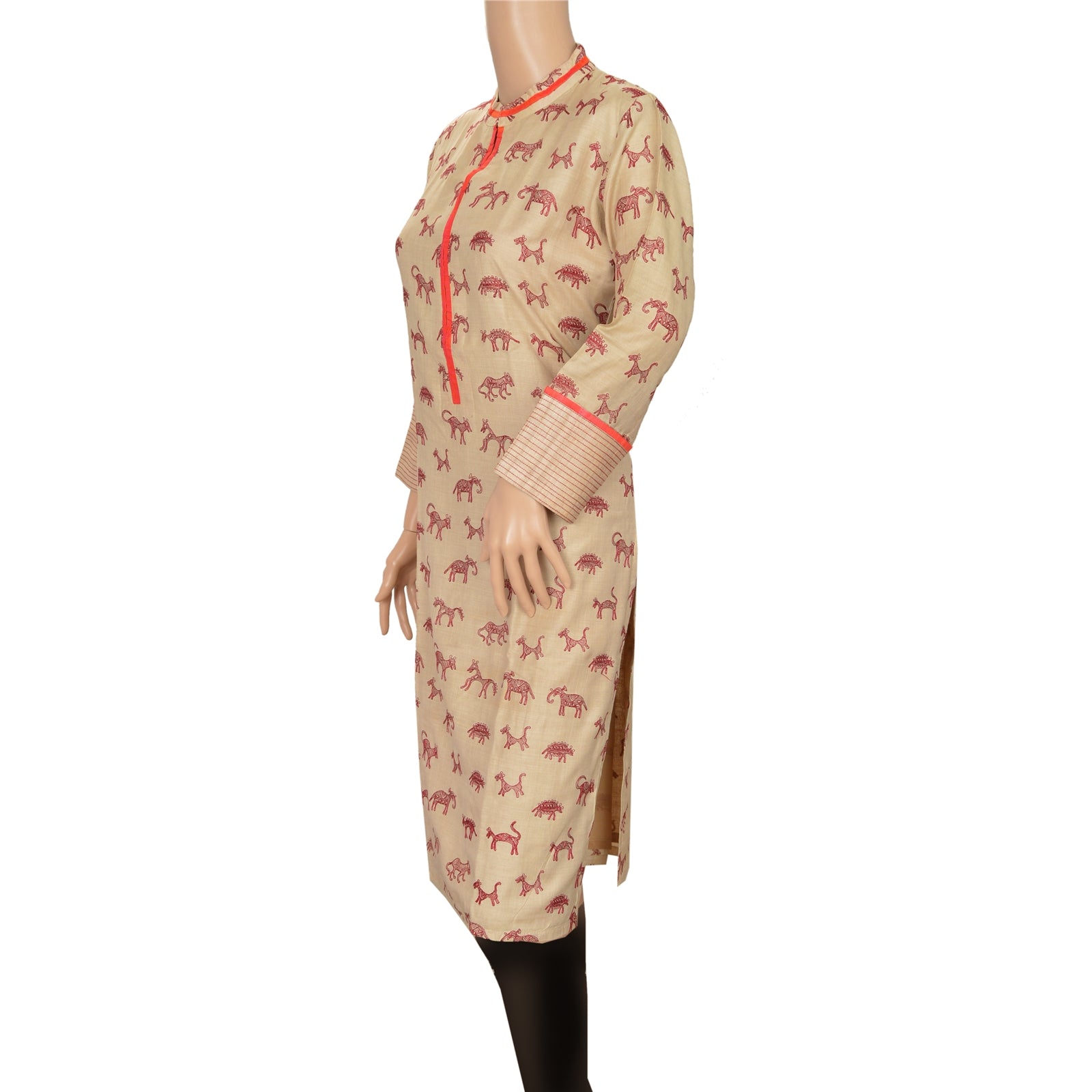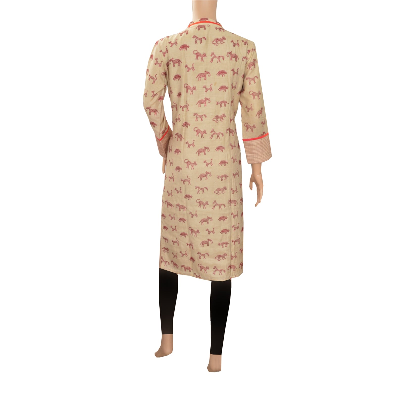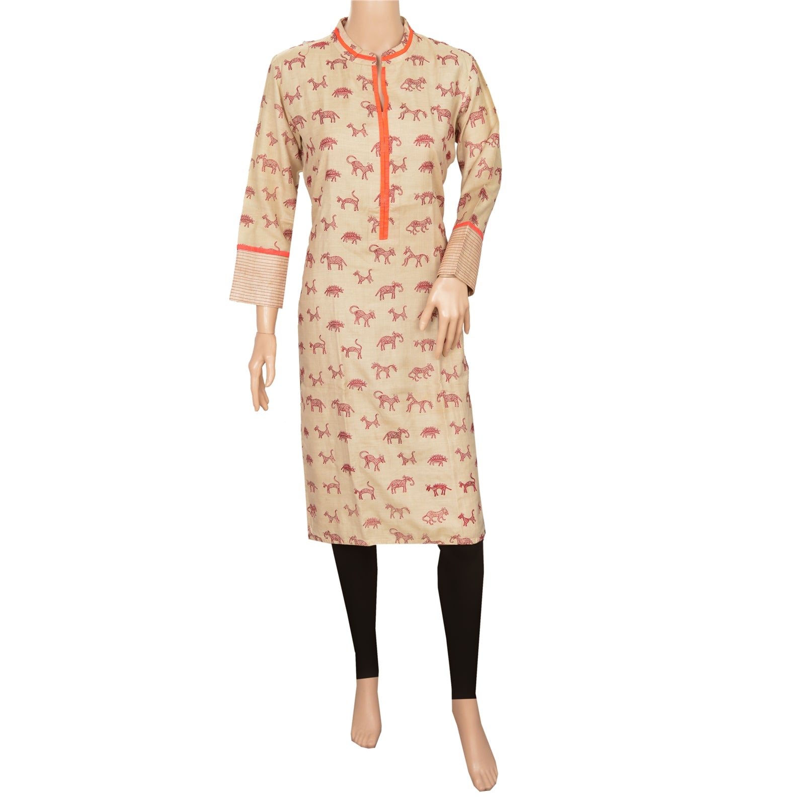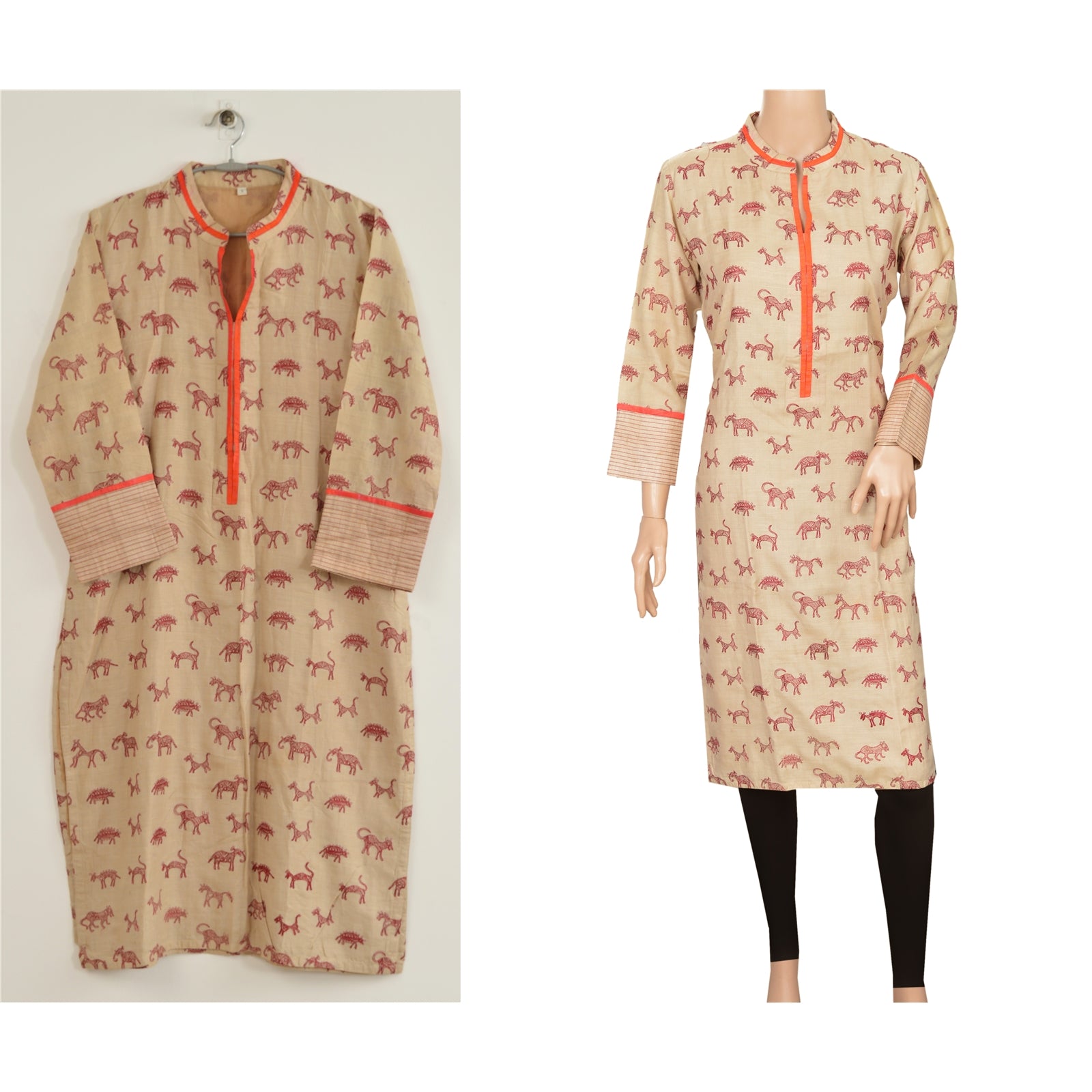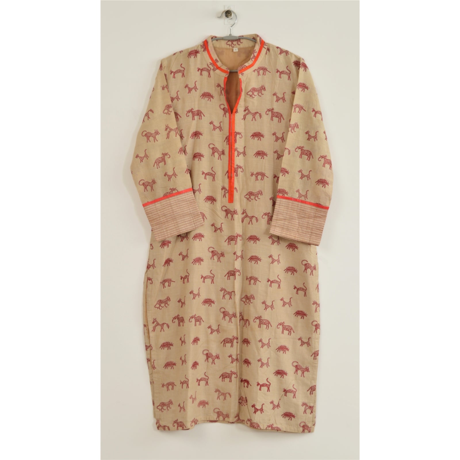 Beautiful cream Color khandi Silk Long Top Kurta. Floral & animal Design. Top Further Highlighted With maroon color embroidered thread work Is Looks beautiful. Top Has orange Patch Work In Front and Full Sleeves and collars is Looks Amazing. Top With Remarkable embroidery Work And Full Sleeves Brightens The Look Of Wearer And Will Add Style And Class To Their Look. Awesome Work. This Designer Top With collars and patch work Will Make You Look Smart & Elegant. Team It With Leggings For Comfort & Style.