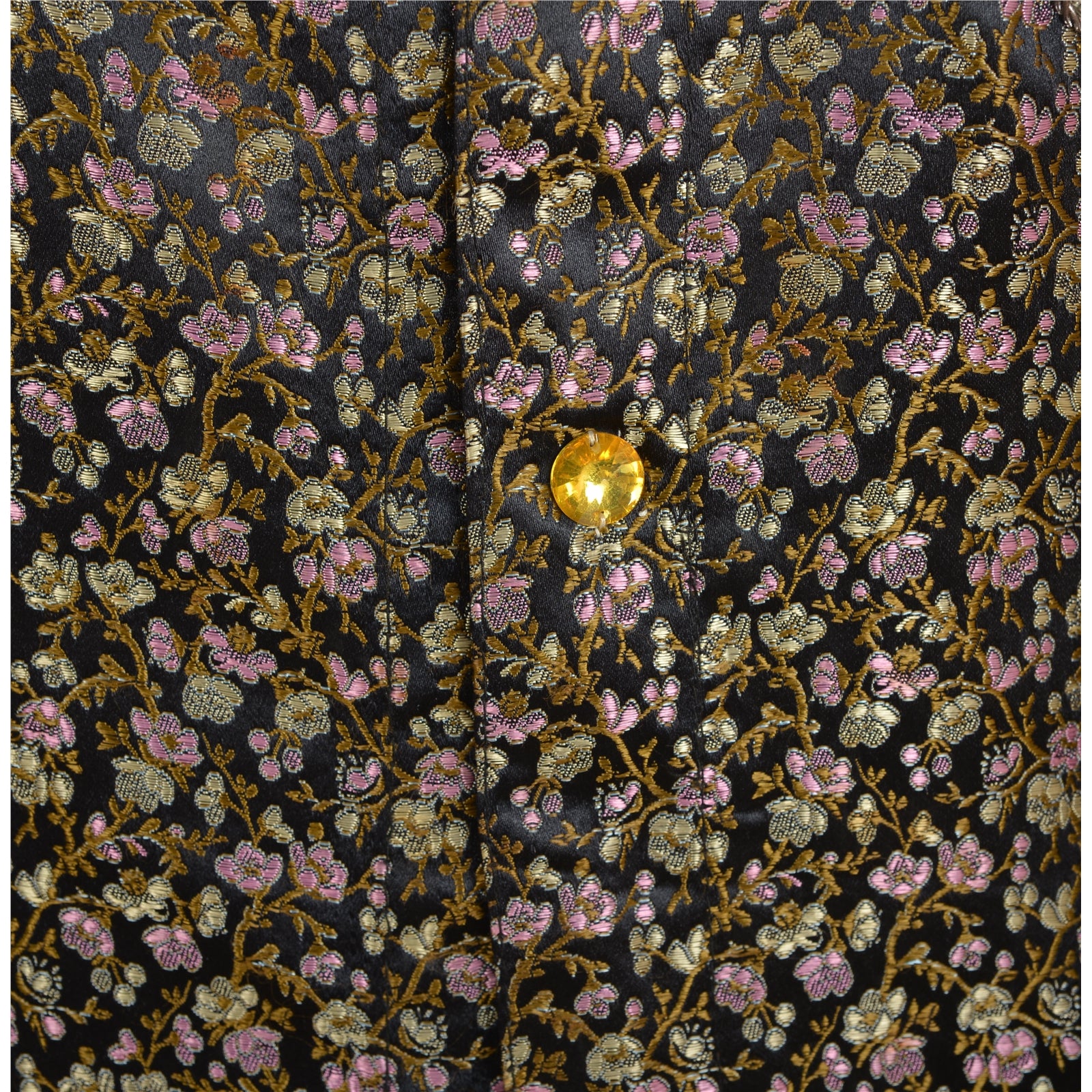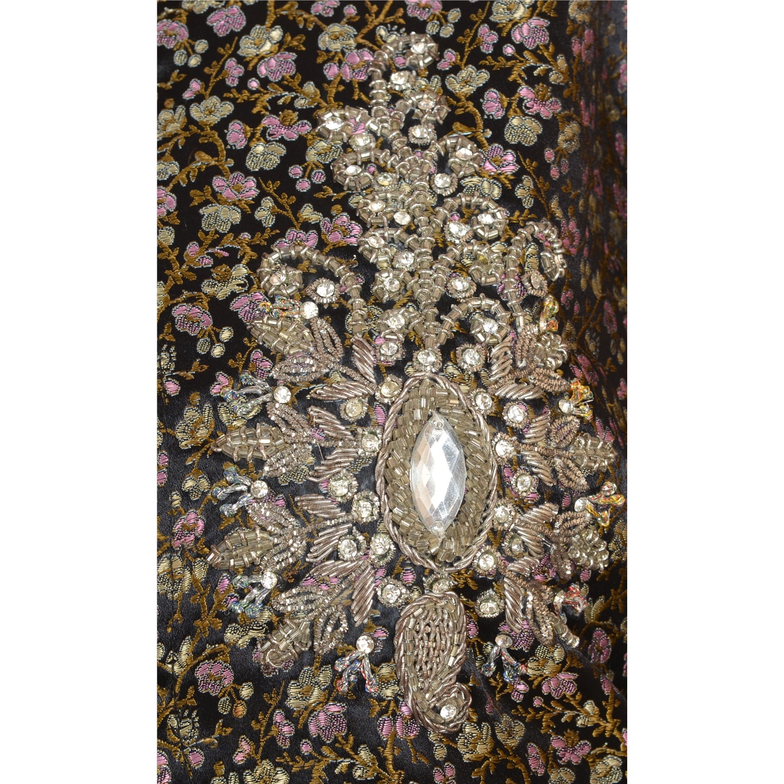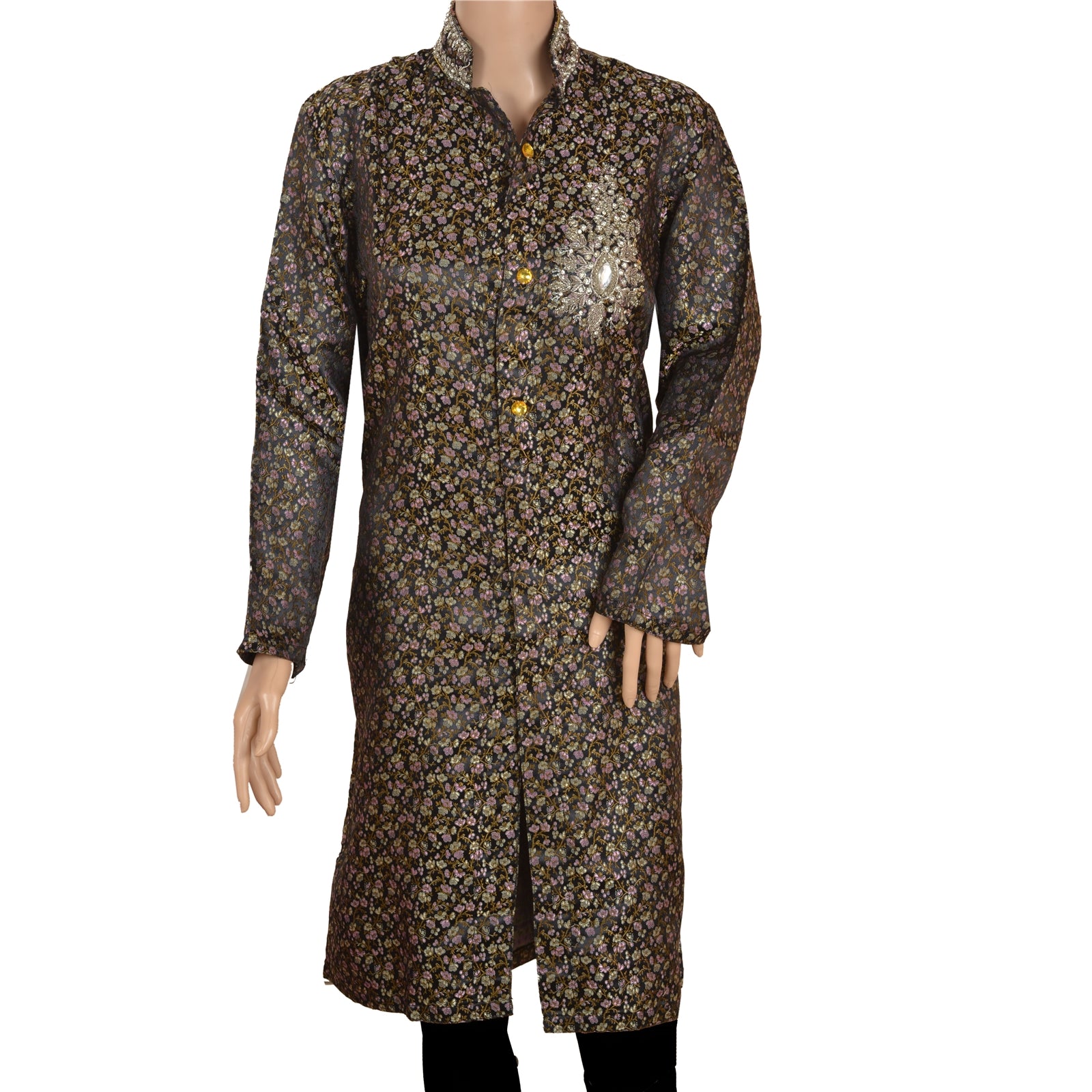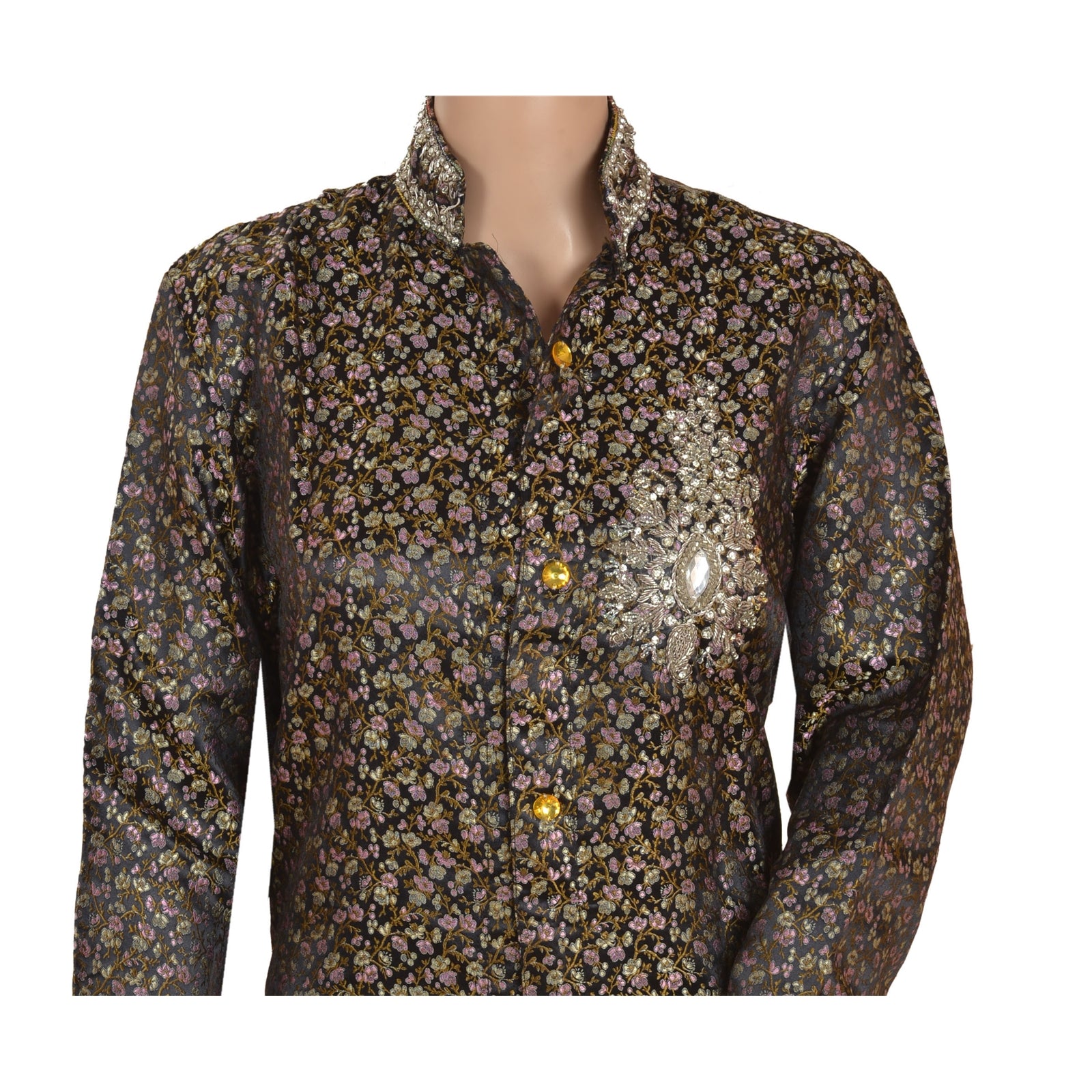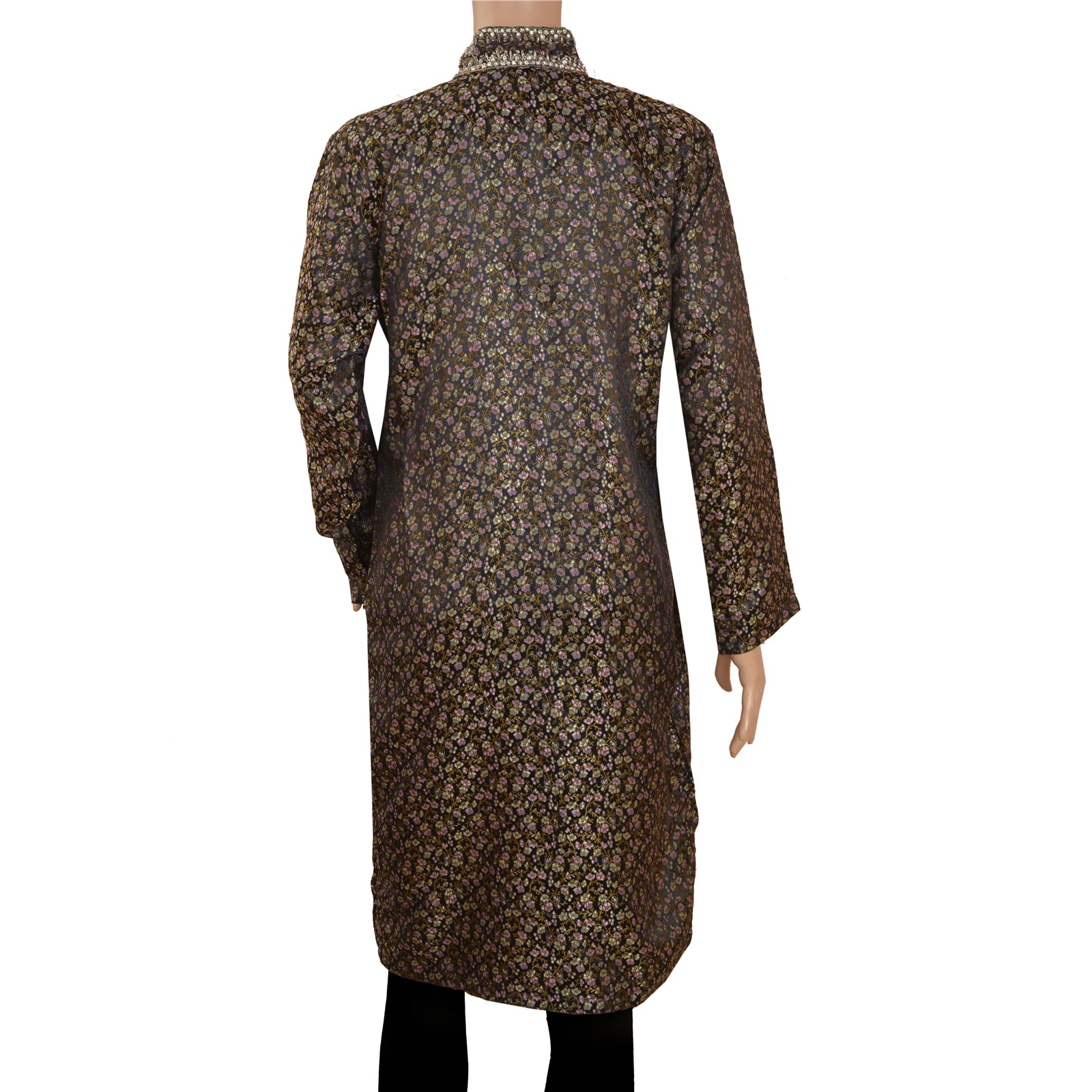 Black color satin woven hand beaded long top. Floral design woven in golden, pink and cream color painstakingly hand worked with silver zardozi and dabka work, white zircons and rhinestones. Top with remarkable embroidery brighten the look of wearer and adds up charm to their outfits. Awesome work. Embroidery also on back part of the top . This designer top with a band collar and buttons in front will make you look smart & elegant. Team it with leggings or pants for comfort & style.