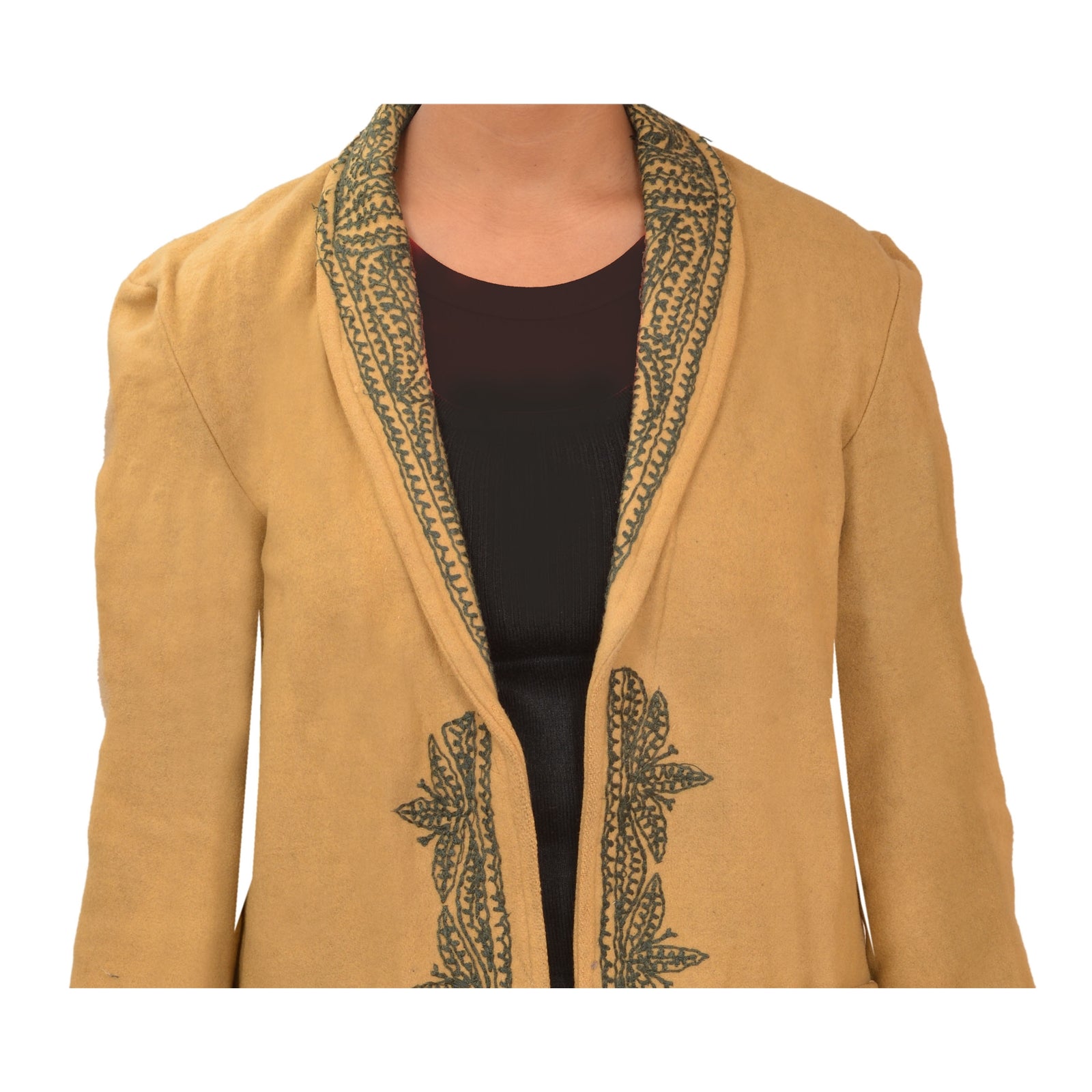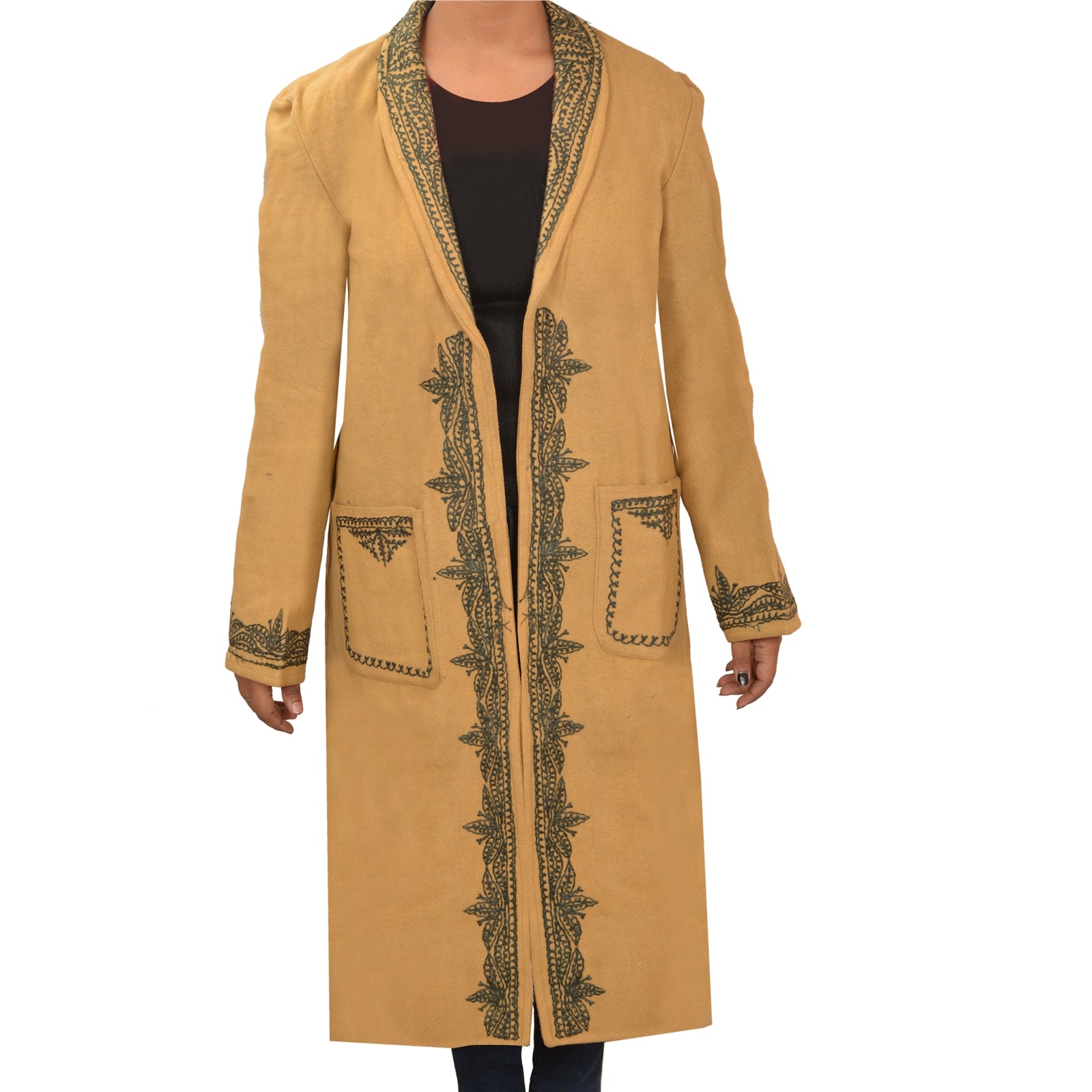Brown color woolen hand embroidered Kashmiri open style jacket long top/ house coat. Floral & paisley design painstakingly hand worked in a green color. Beautiful embroidery on collar, back side, sleeves and front pocket gives an amazing look to the jacket. Top with remarkable embroidery brightens the look of wearer and adds up charm to their outfits. Wear it over dresses, pants & trousers for comfort & style. Wear cozy and apt for winters. Awesome work.