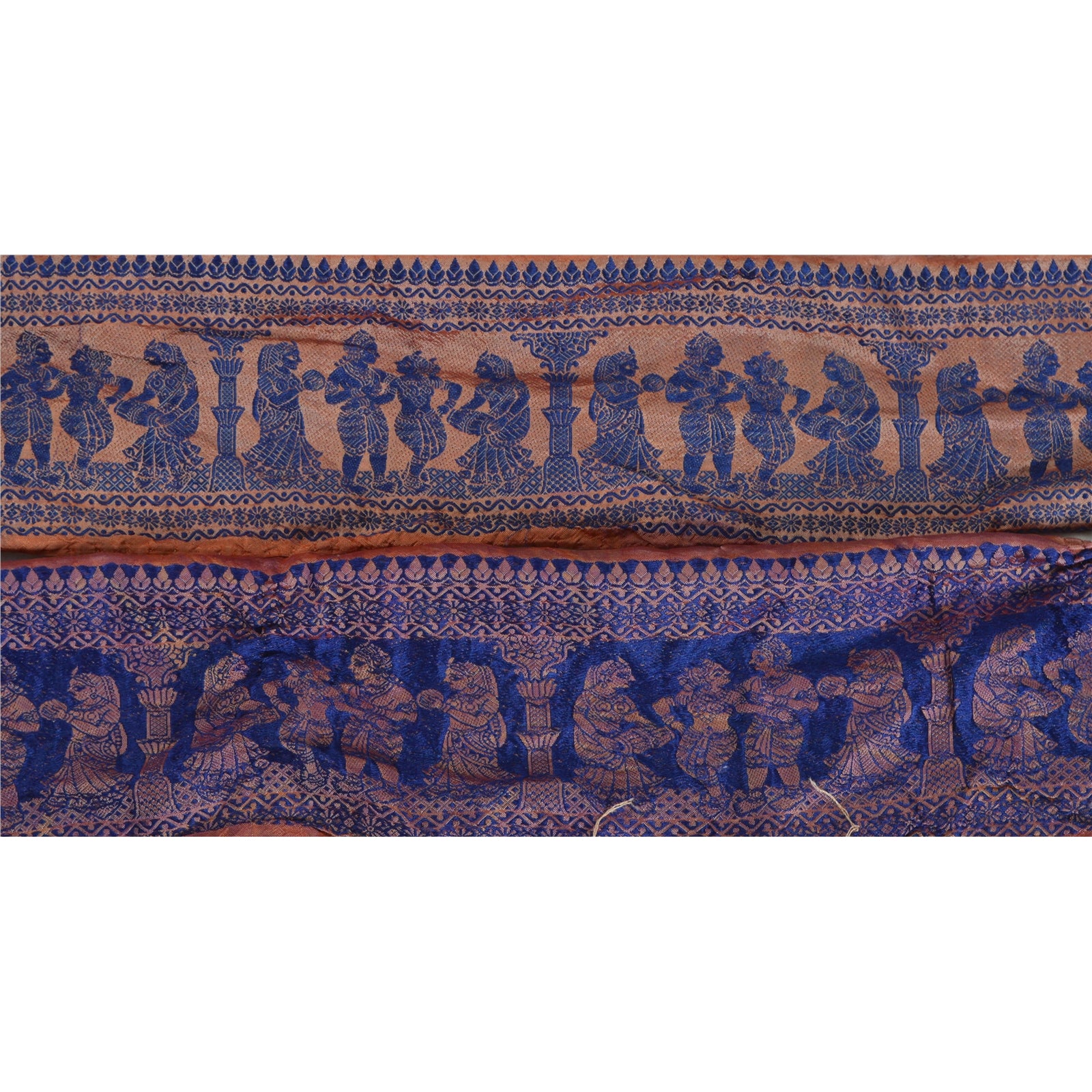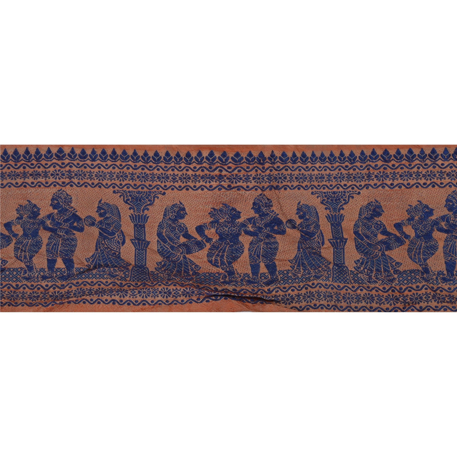 Wonderful pure silk woven sari border in brown color highlighting traditional Baluchari work from Odisha (Eastern India). Border has beautiful woven pattern in blue color showcasing dancing human pattern. Floral motifs further add to the beauty of the trim. WOW!! and awesome one of a kind versatile border. 1 Quantity = 1 Yard