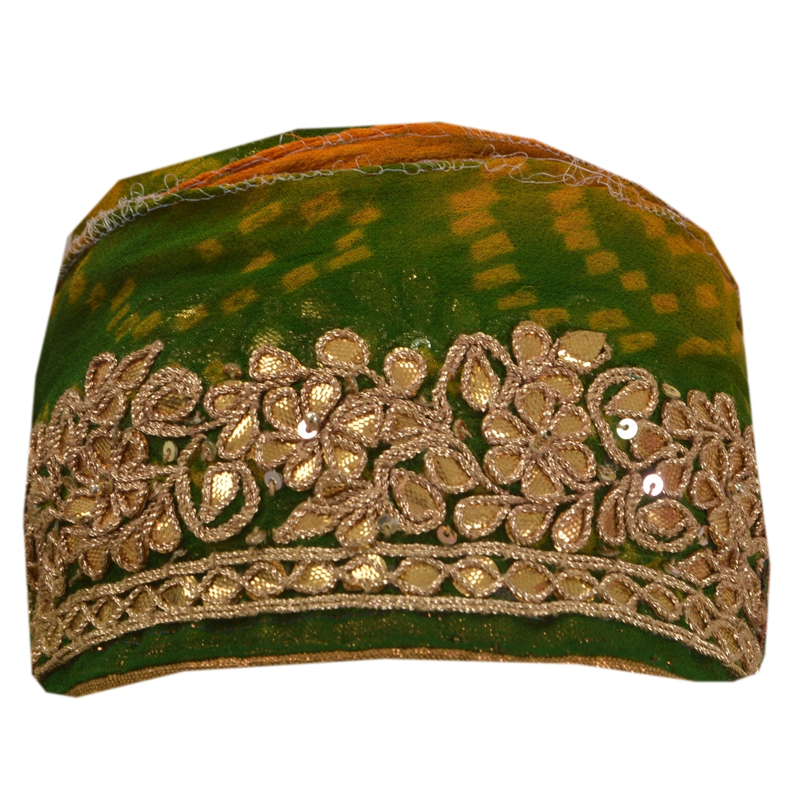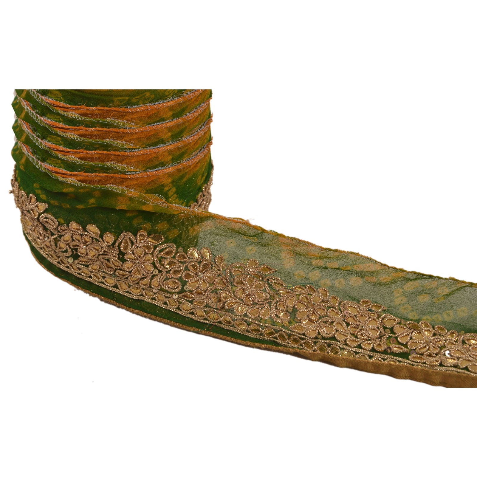 Fabulous georgette hand beaded Bandhani sari border in green color gota patti work. Border has beautiful floral patterns painstakingly hand beaded with golden gota patti work & dori work. Further you can see fine detailing with golden sequins work. WOW!! an awesome one of a kind versatile border. 1 Quantity = 1 Yard