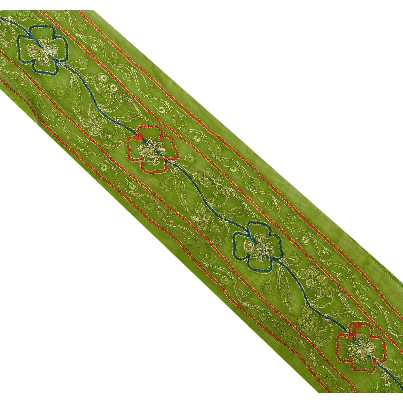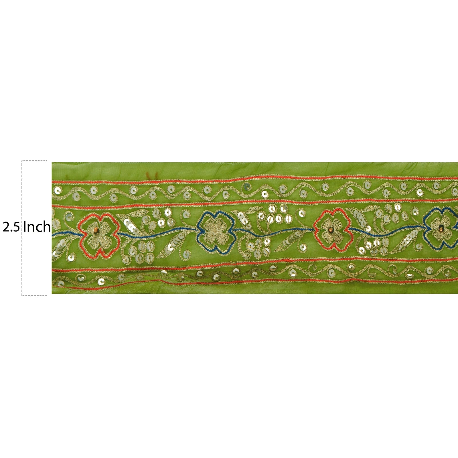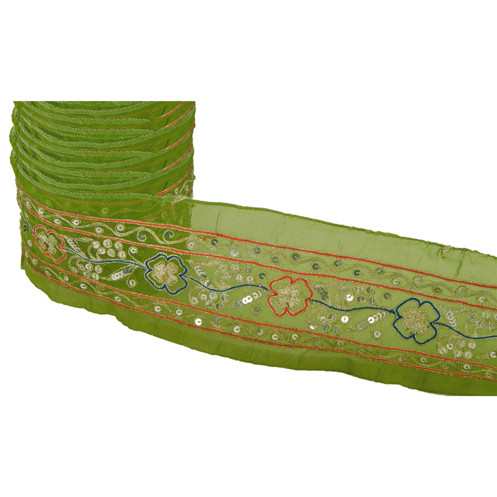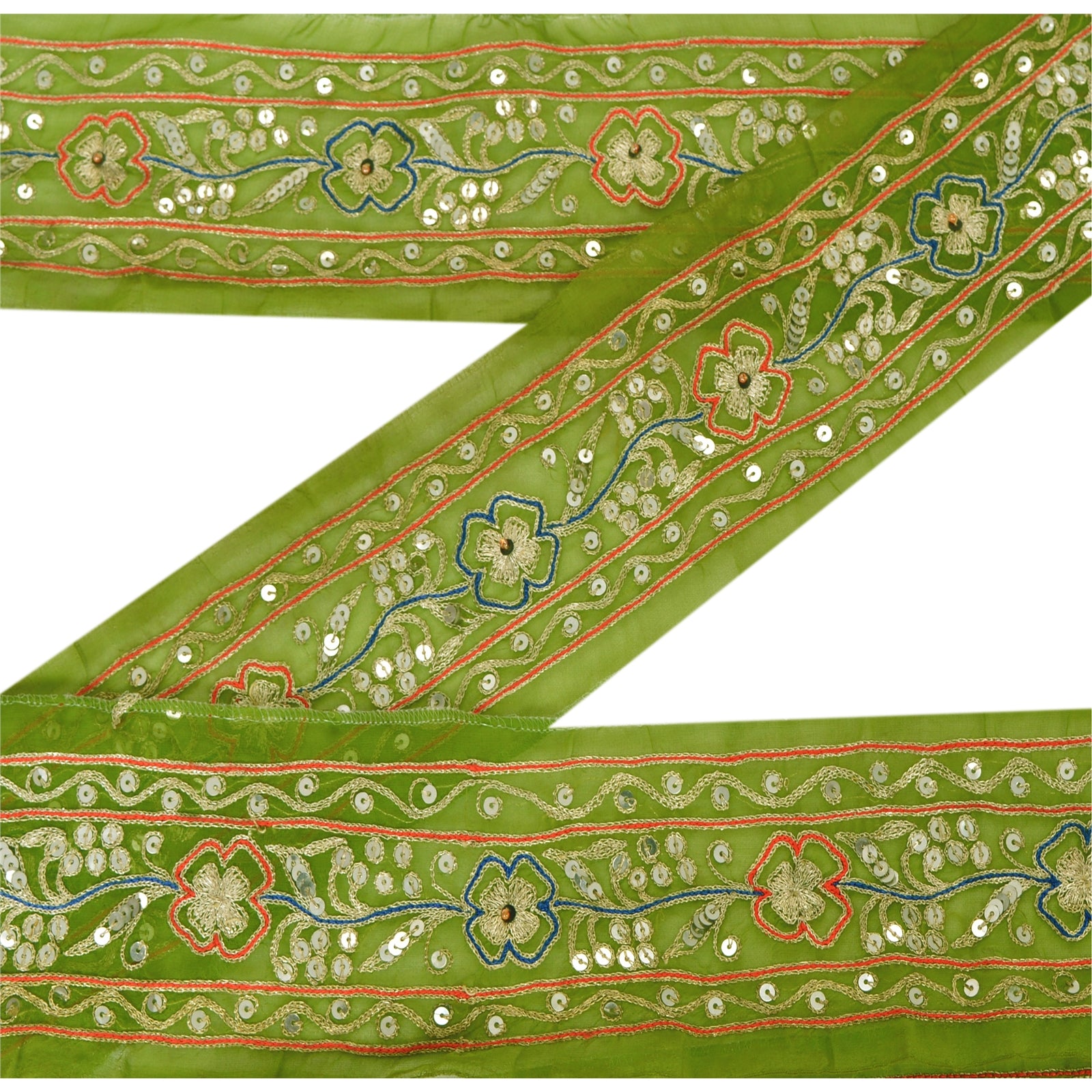 Excellent georgette hand beaded sari border in green color highlighting sequins work. Border has beautiful floral patterns painstakingly hand beaded with silver zari work, silver sequins work . Further you can see fine detailing with red/blue thread work. WOW!! an awesome one of a kind versatile border. 1 Quantity = 1 Yard