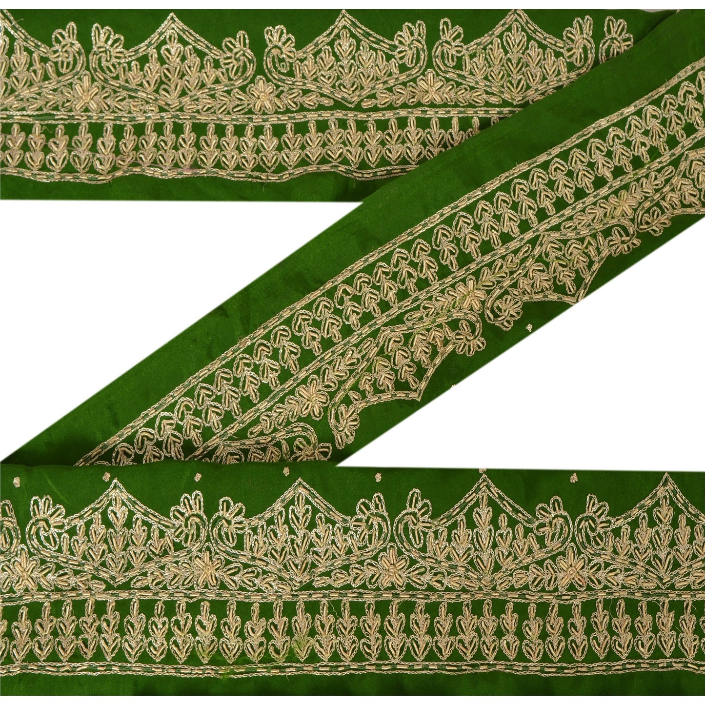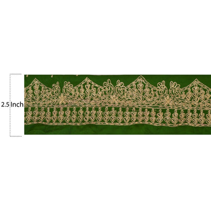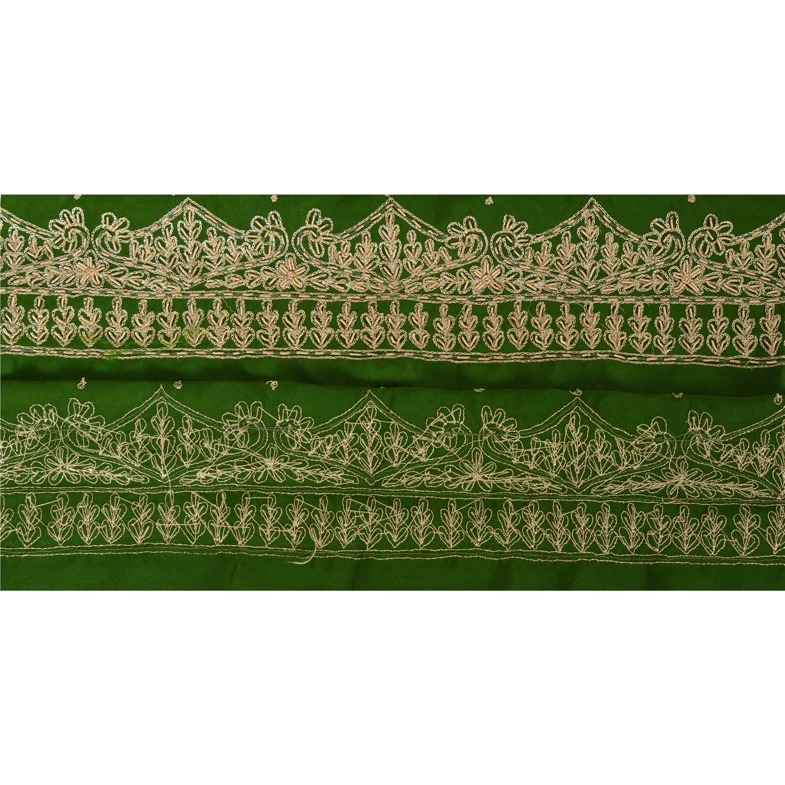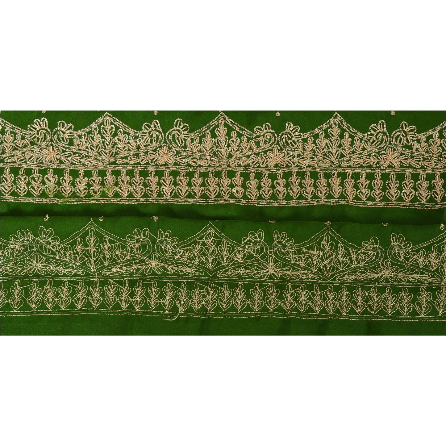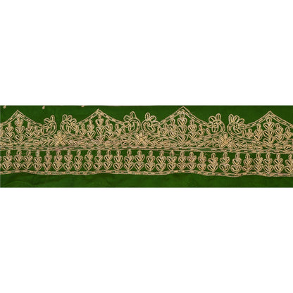 Amazing art silk hand embroidered sari border in green color highlighting zardozi work. Border has beautiful floral patterns painstakingly hand embroidered with golden zari/zardozi work . WOW!! an awesome one of a kind versatile border. 1 Quantity = 1 Yard