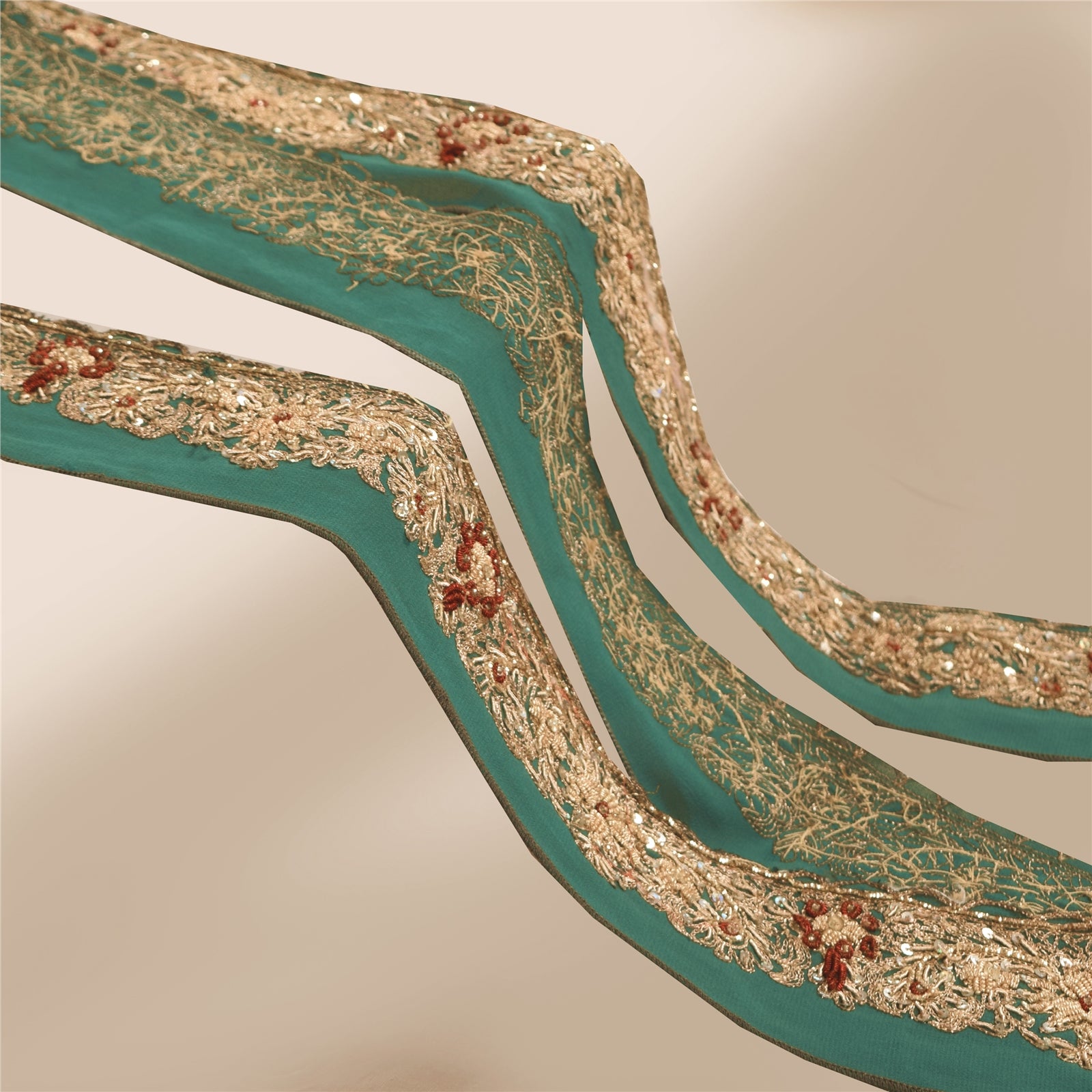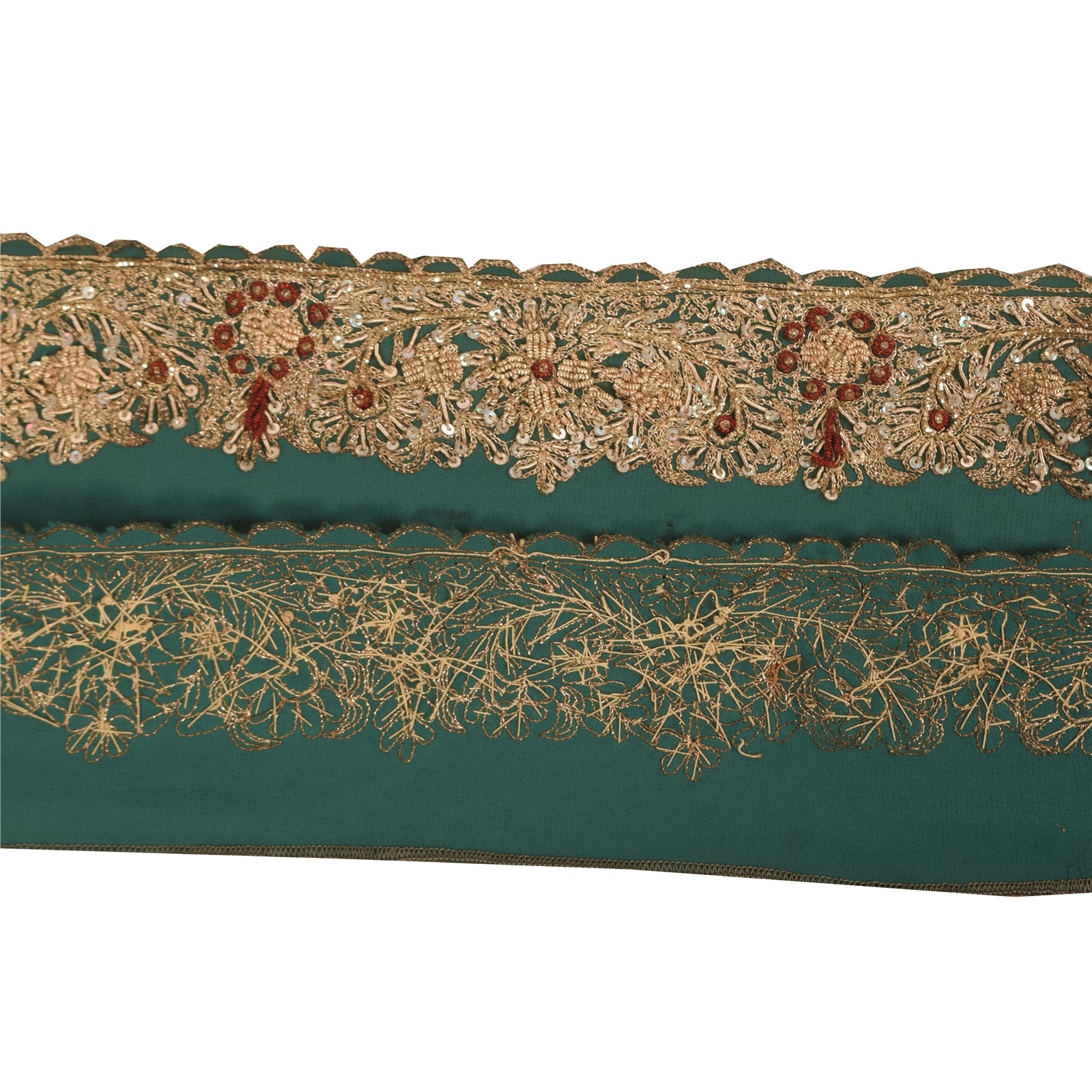 THE ITEM COLOR OR SHADE MAY BE DARKER OR LIGHTER THAN THE PICTURE.' Amazing georgette hand Embroidered sari border in green color highlighting zari zardozi work. Border has beautiful floral design with zari, zardozi, dabka, sequins work. WOW!! an awesome one of a kind versatile border. 1 Quantity = 1 Yard B-14792